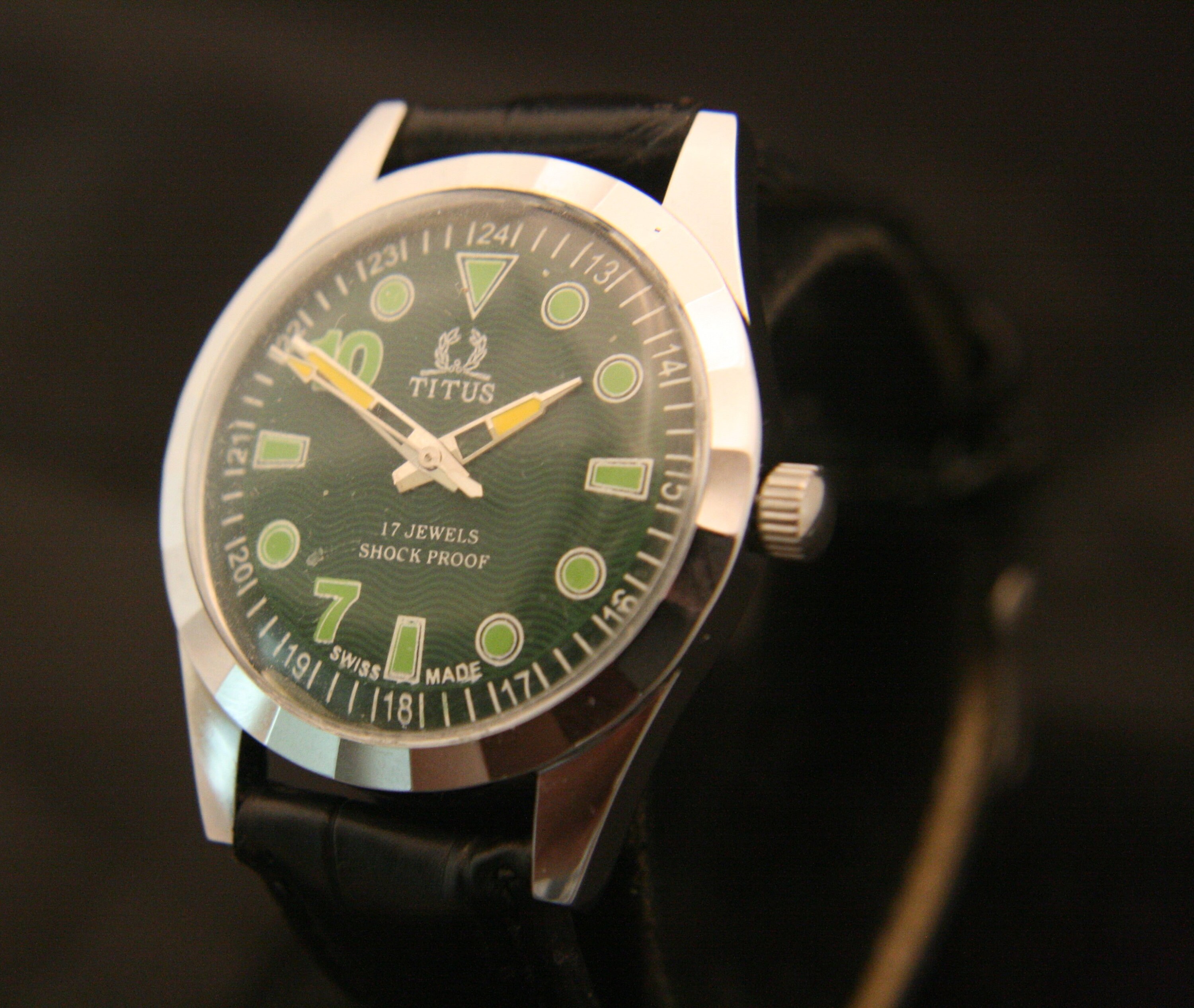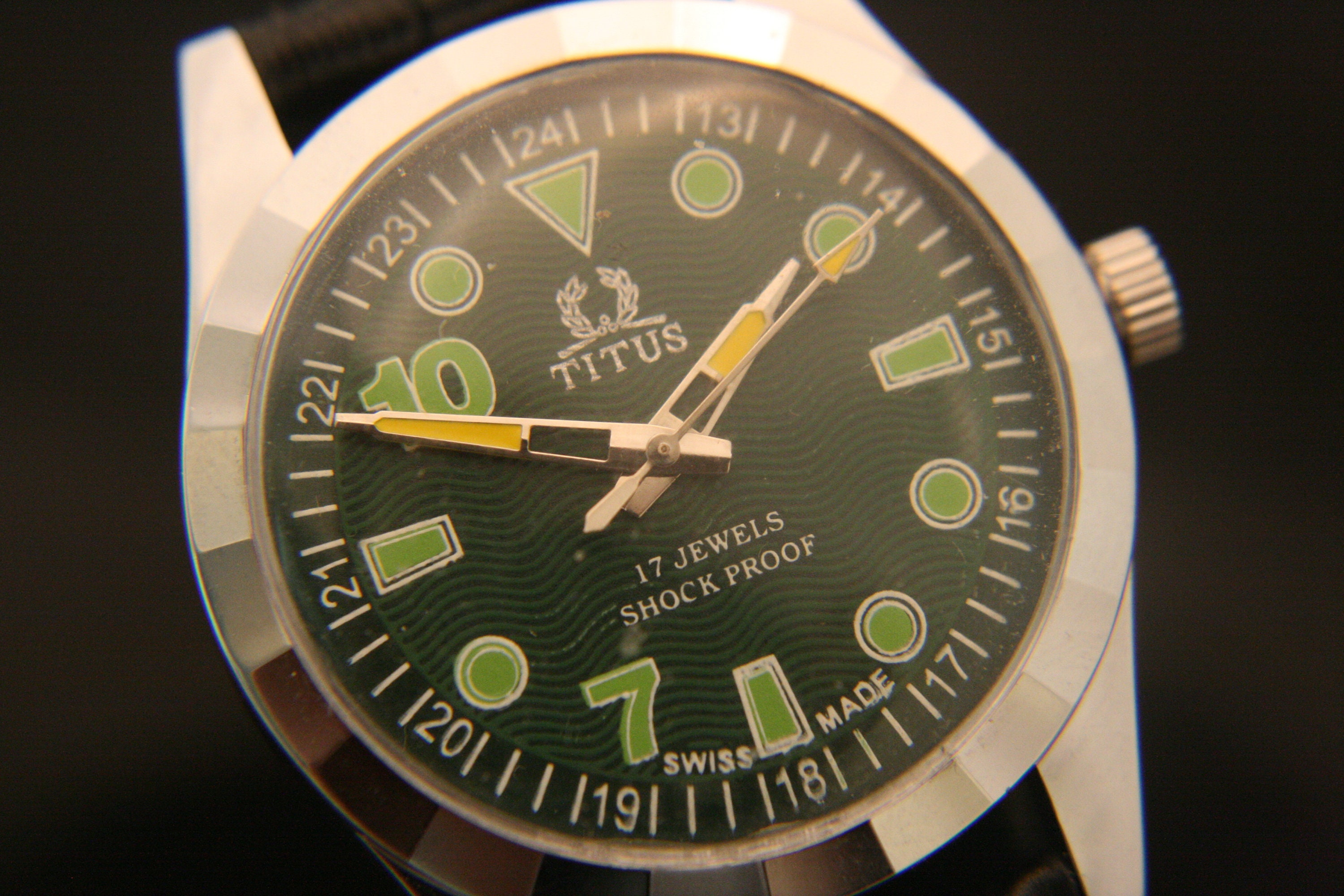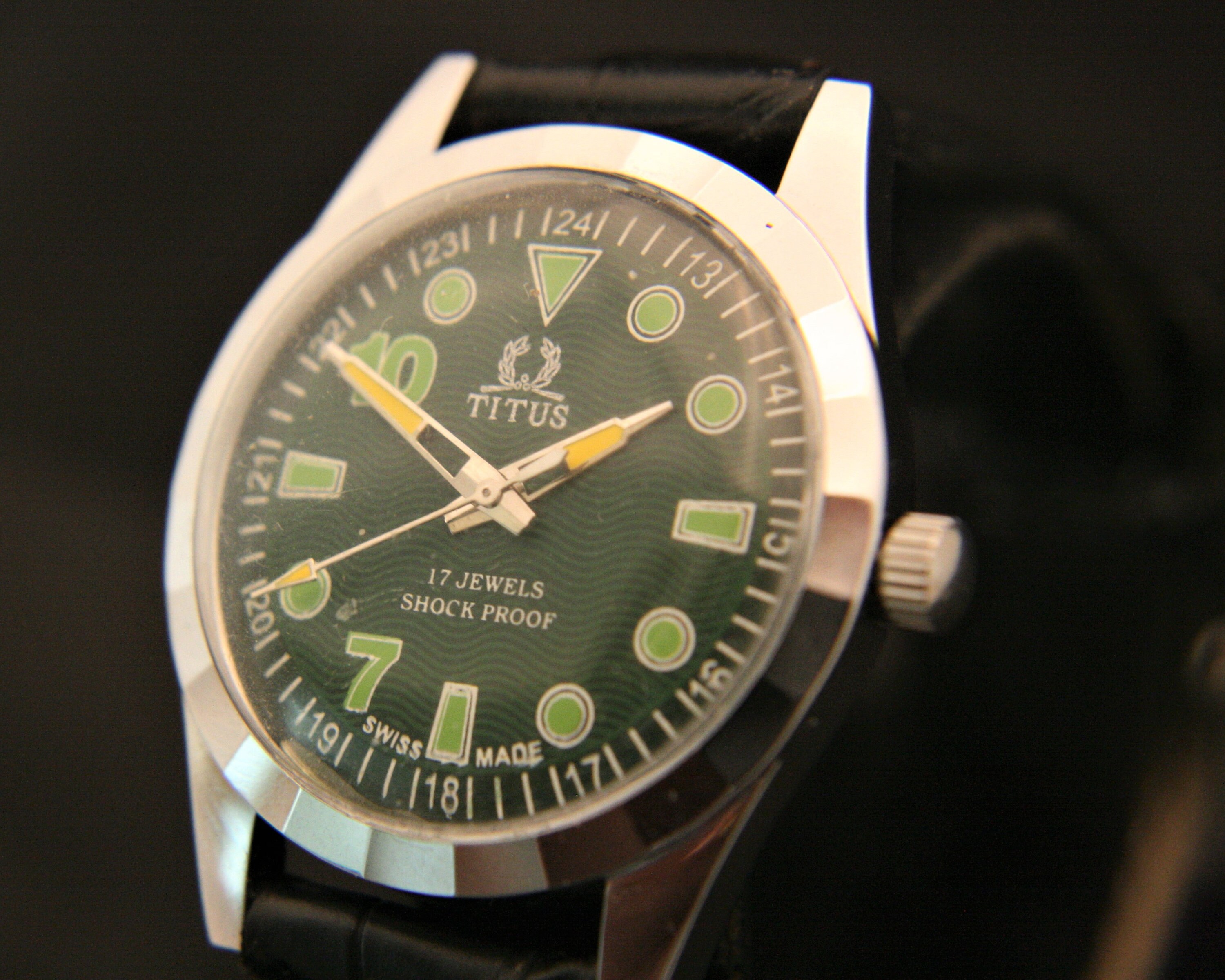 The beautiful green guilloche dial is complimented with bold, cut-out yellow hour and minute hands, yellow spear sweep second hand, green hour markers and numbers, and white outer chapter, all under a bright new crystal.