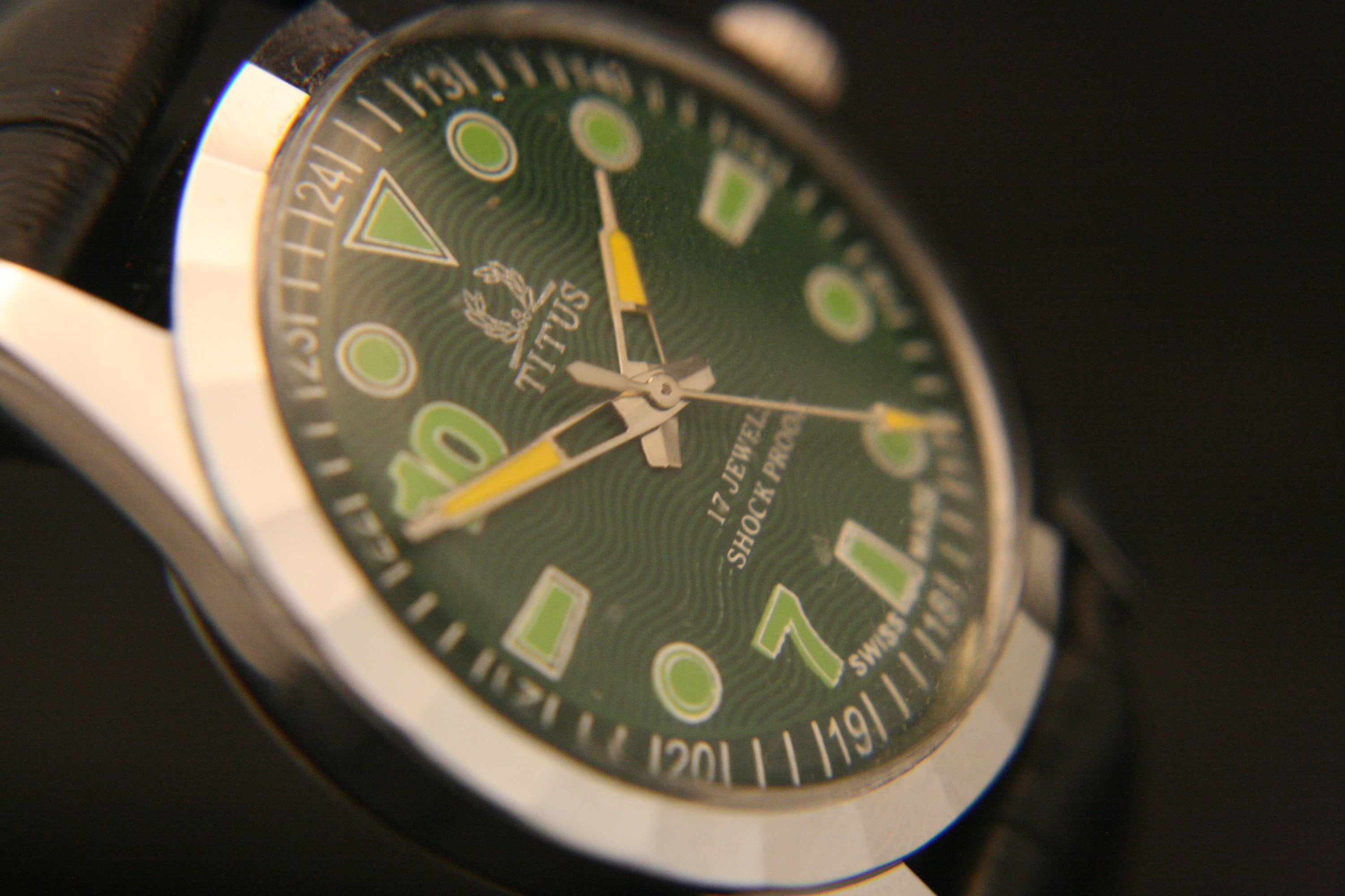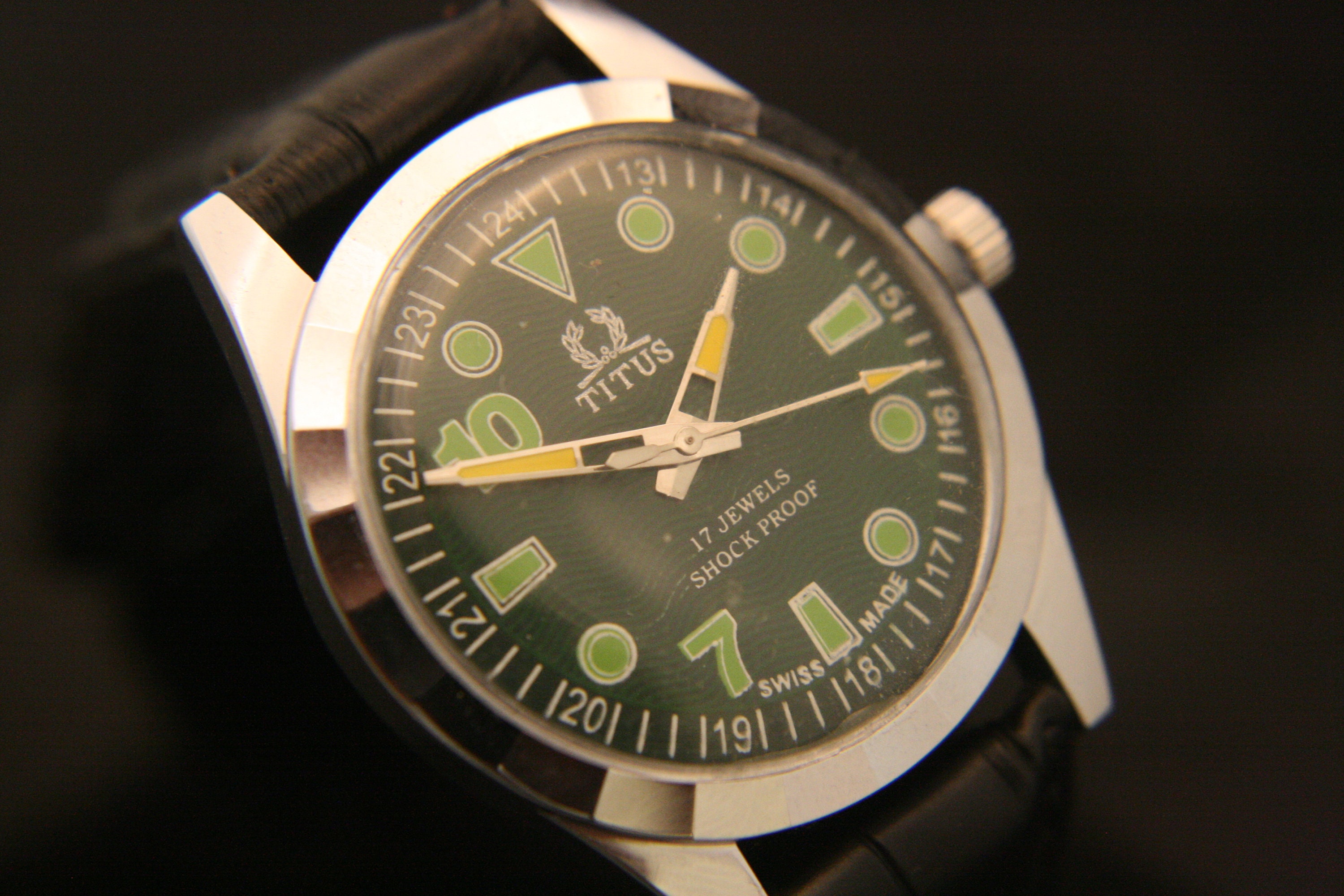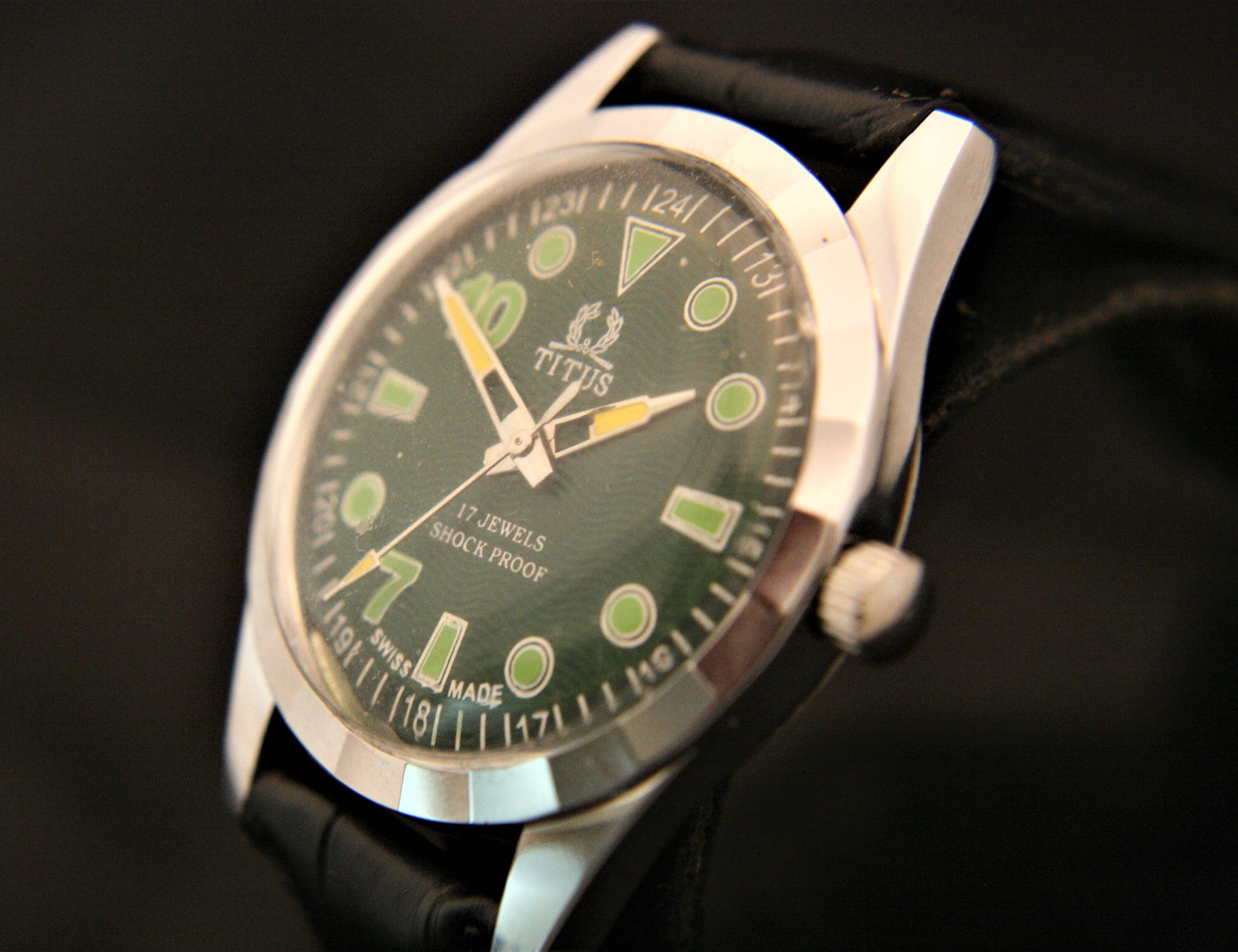 The beautiful green guilloche dial is complimented with bold, cut-out yellow hour and minute hands, yellow spear sweep second hand, green hour markers and numbers, and white outer chapter, all under a bright new crystal.