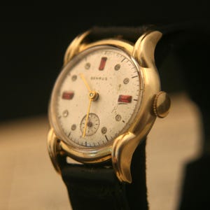 Manufactured in the 1950's, at the Maslennikov Watch Factory, the gold-plated case measures 30mm across, excluding crown and lugs, and surrounds a beautiful soft yellow dial complimented by gold hour and minute hands, raised gold numbers and markers, black outer chapter, and sub-second dial at 6 o'clock. Please note: The 30 mm case was a fashionable size for men during this era. However, the 1.3" size today is fashionable for ladies' as well.