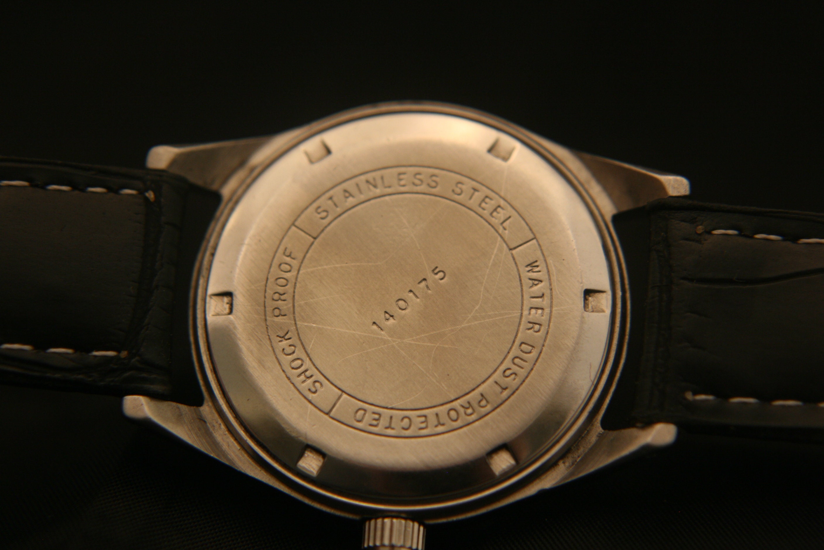 It has a screw-down back and has been fitted with a new, man-made, black leather strap with stainless buckle.