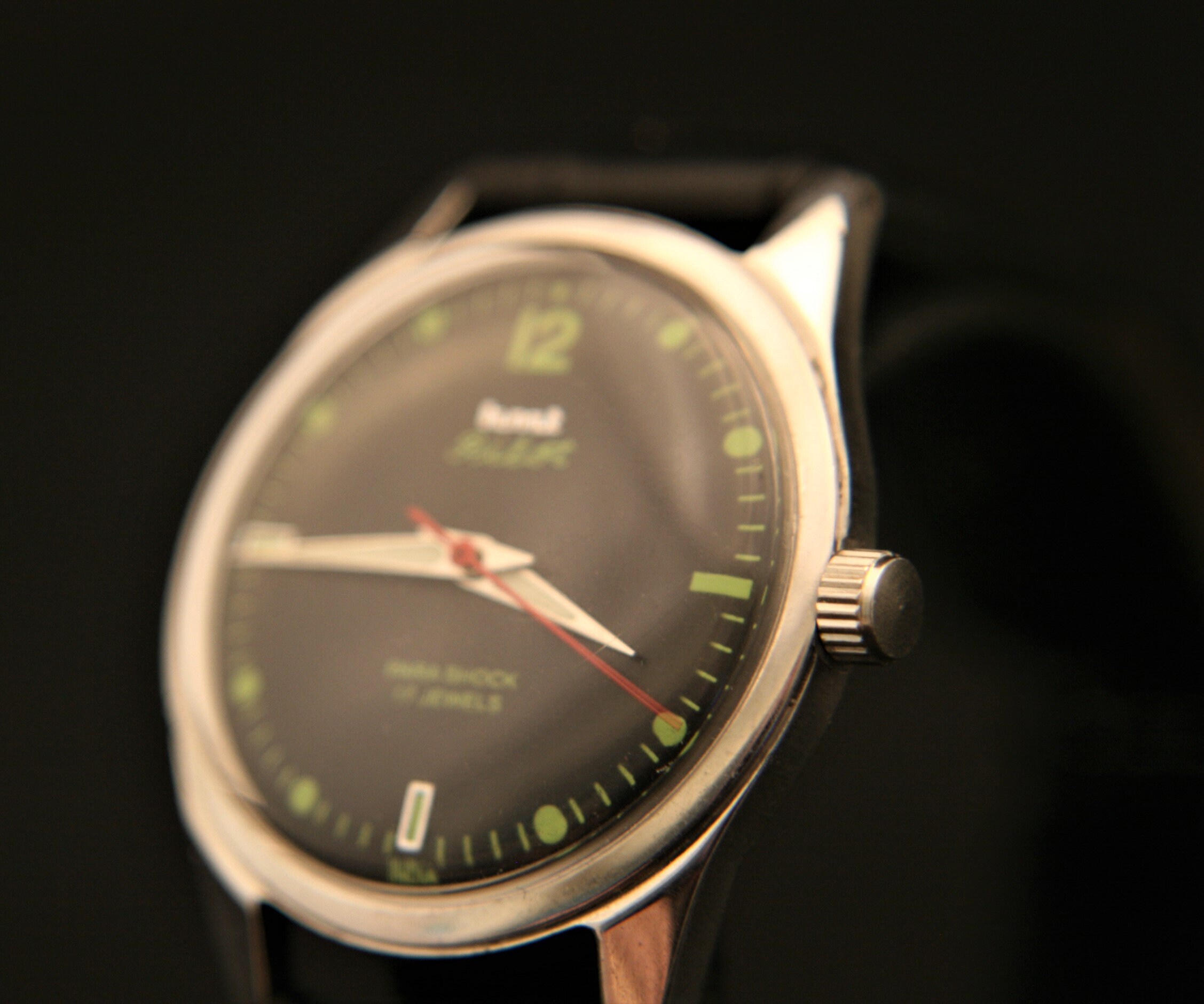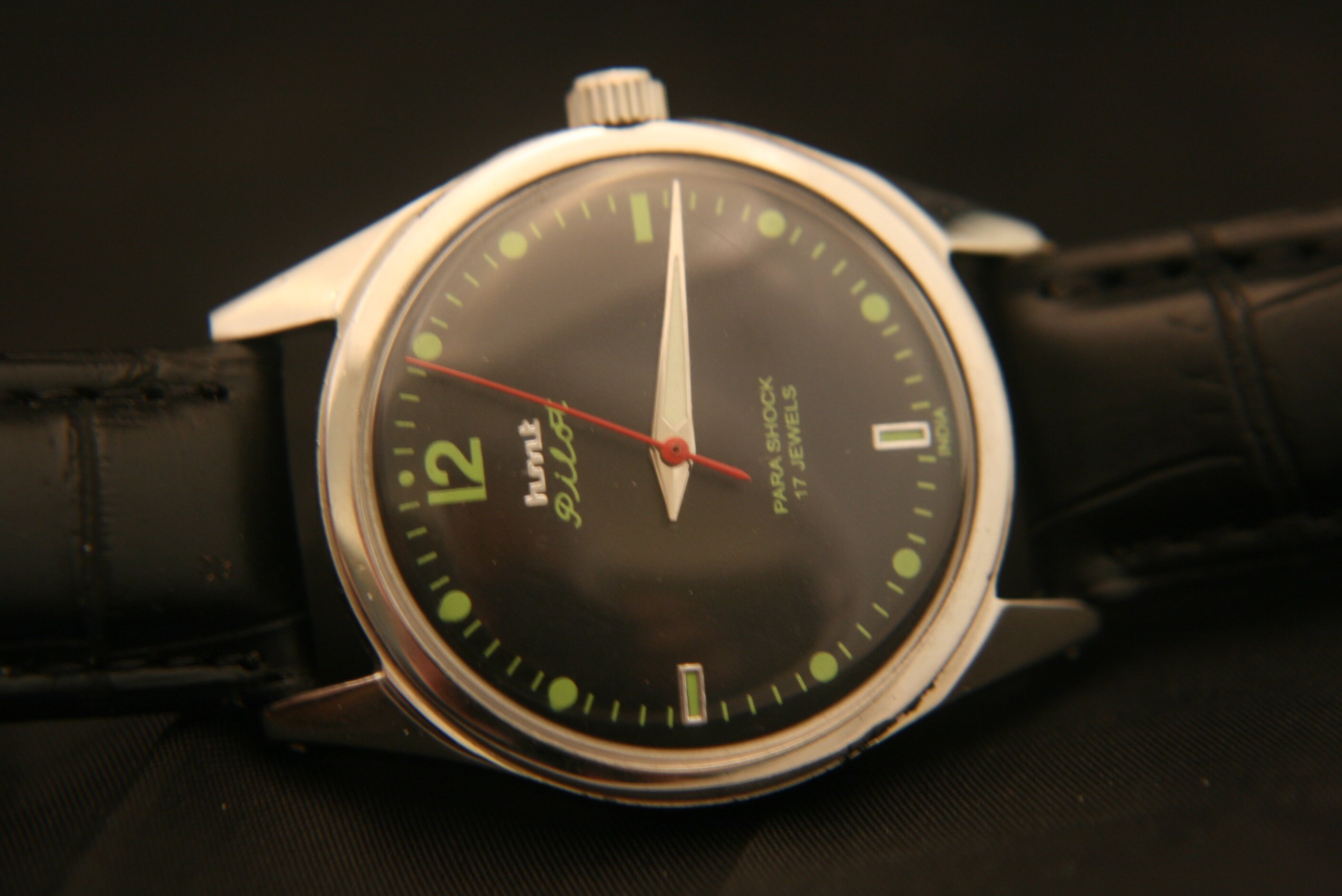 This is a unique restored and serviced HMT Pilot men's military wristwatch from the 1970's.