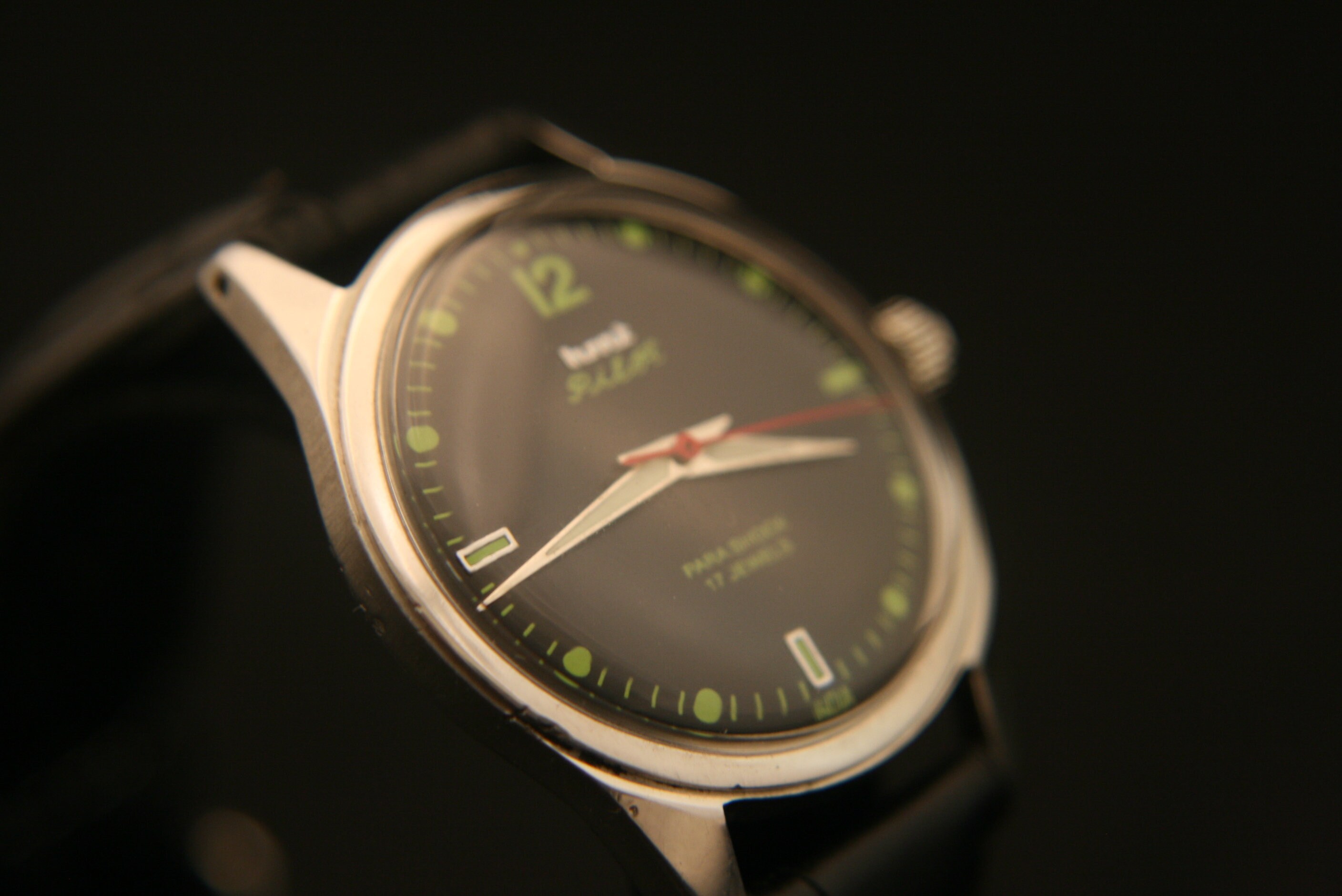 The Polished Stainless Steel bezel measures 1.37" / 34.8 mm in diameter, excluding crown and lugs, and surrounds a deep black dial complimented by silver luminous hour and minute hands, red center sweep, olive numbers, markers, and outer chapter
