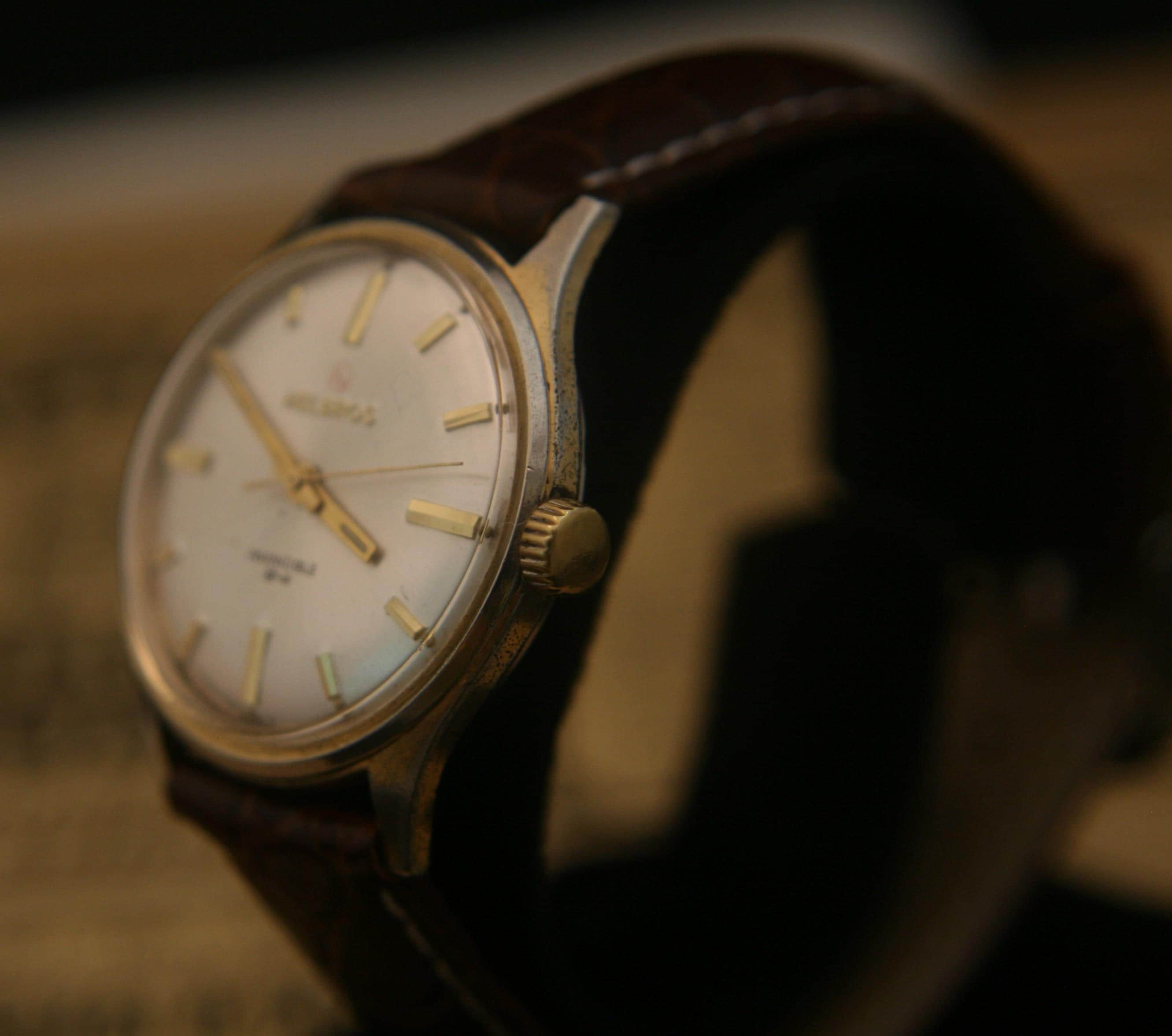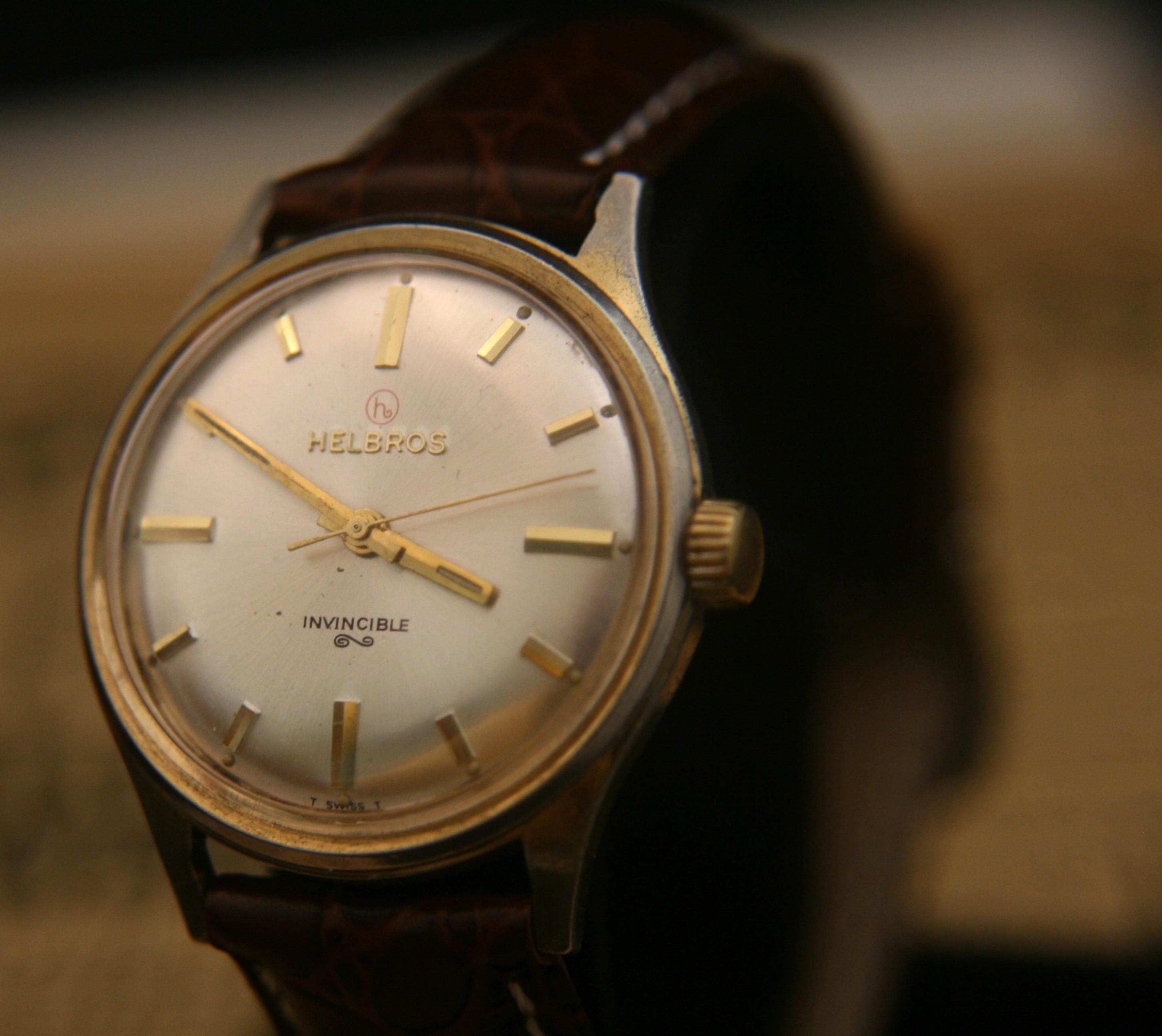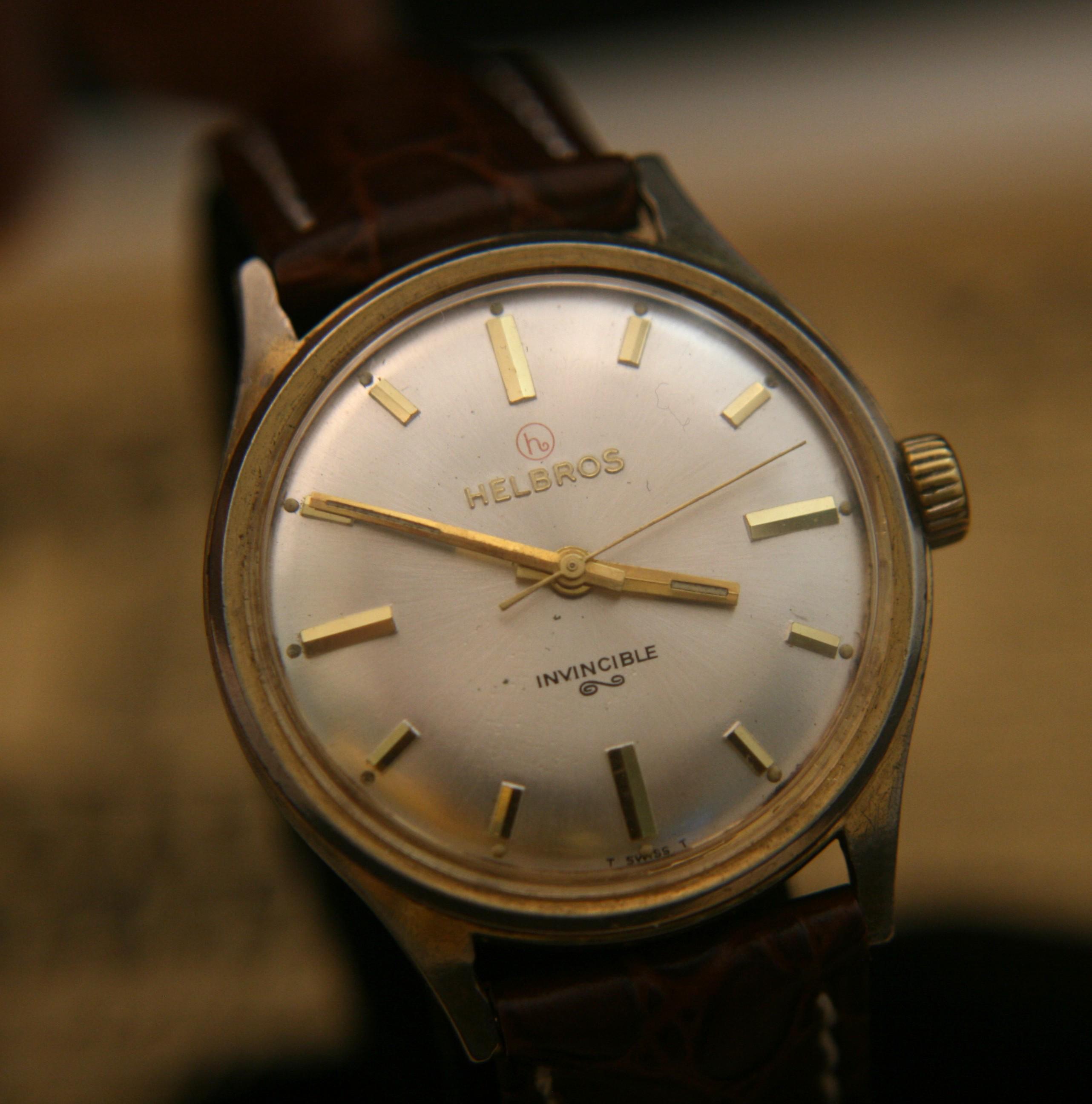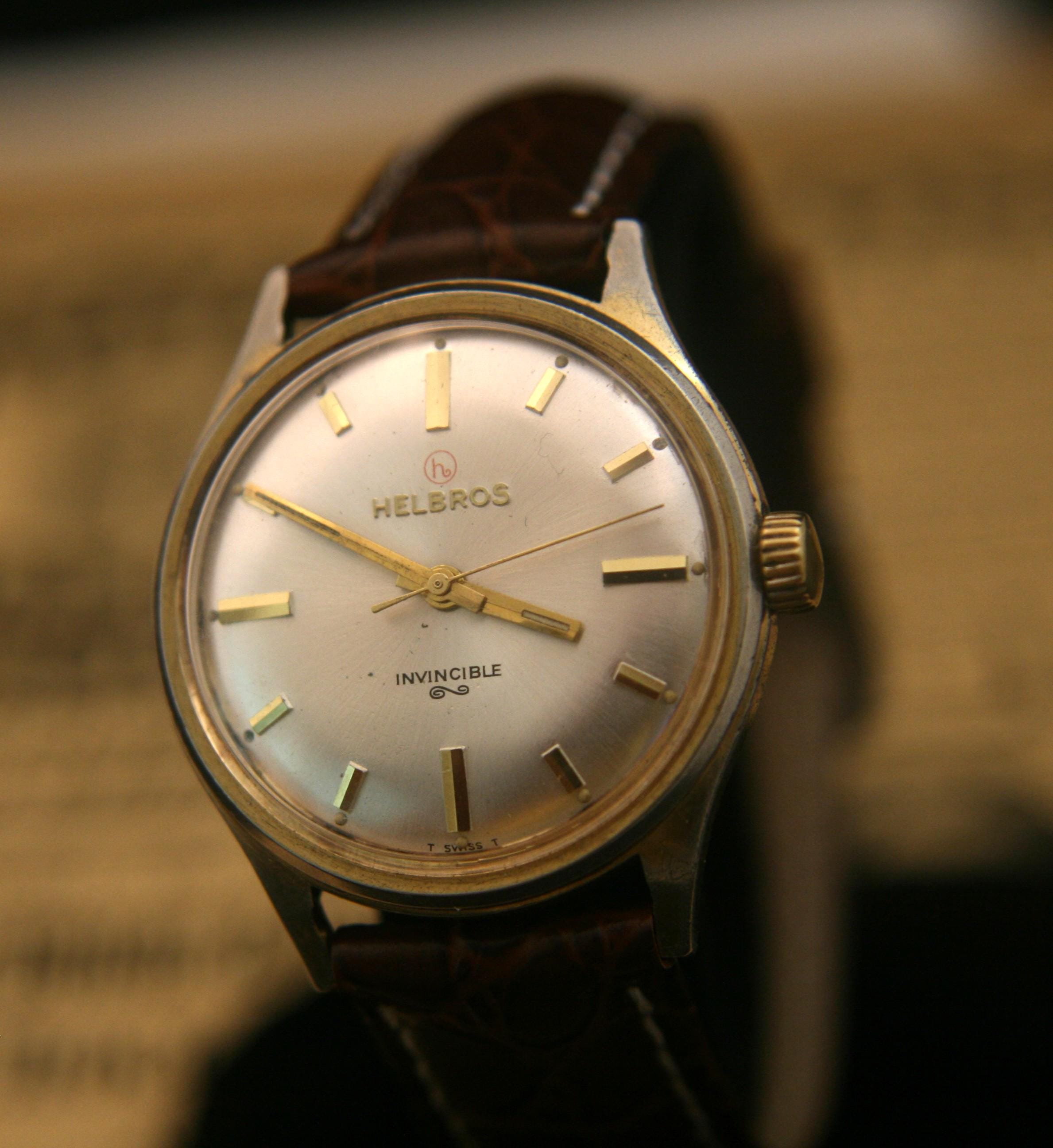 Manufactured in Switzerland in the 1960's by the Helbros Watch Company, this is an affordable, well-preserved vintage men's gold dress wristwatch.