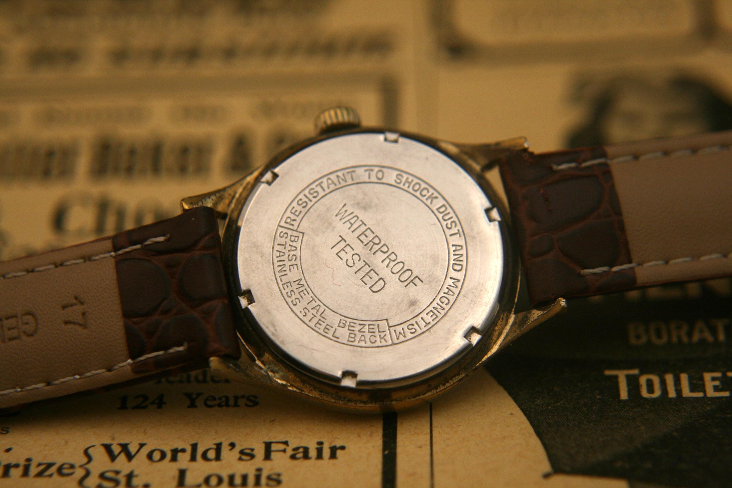 It has a screw-down, stainless steel back, and is matched with a supple new brown, genuine leather stitched strap with stainless buckle.