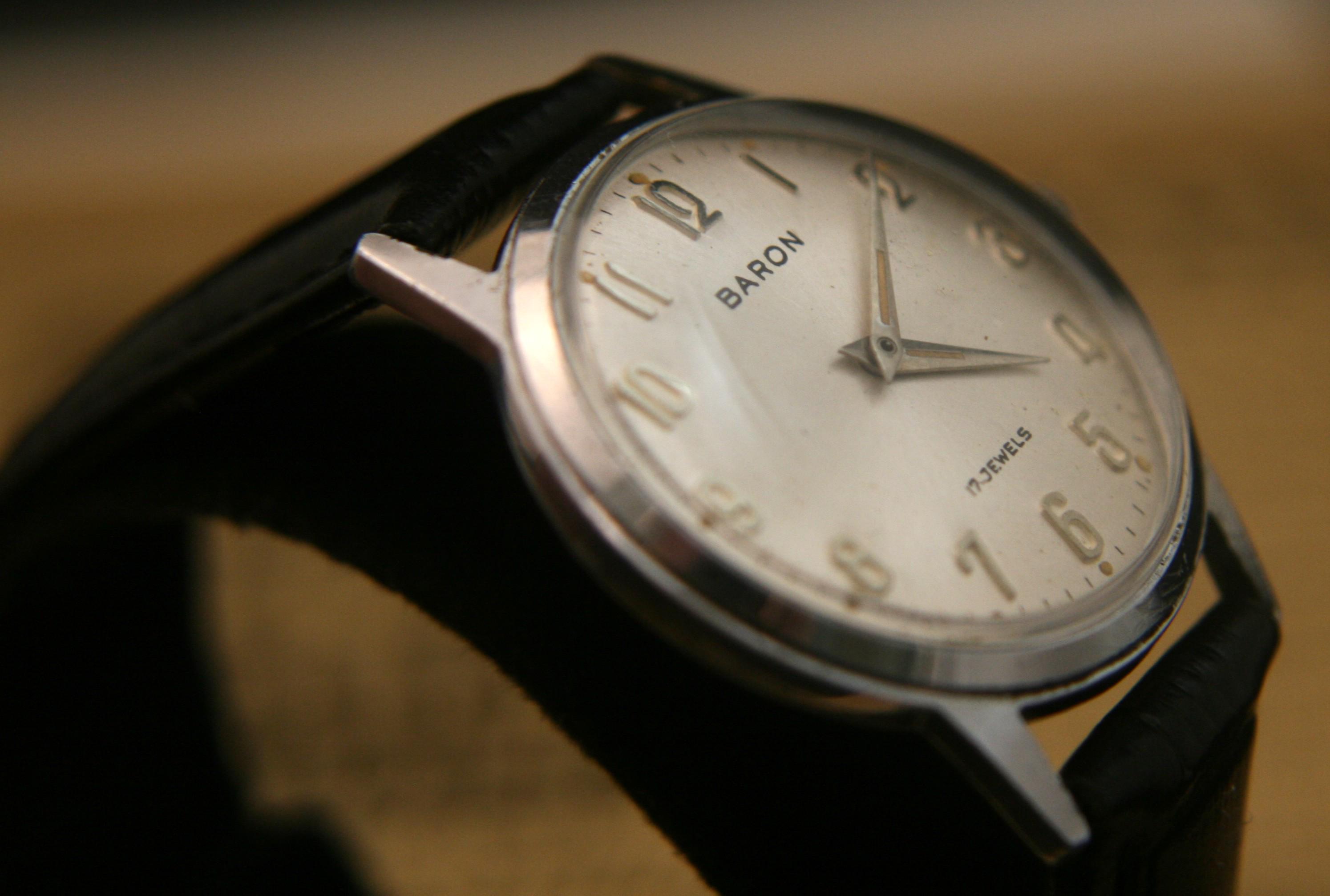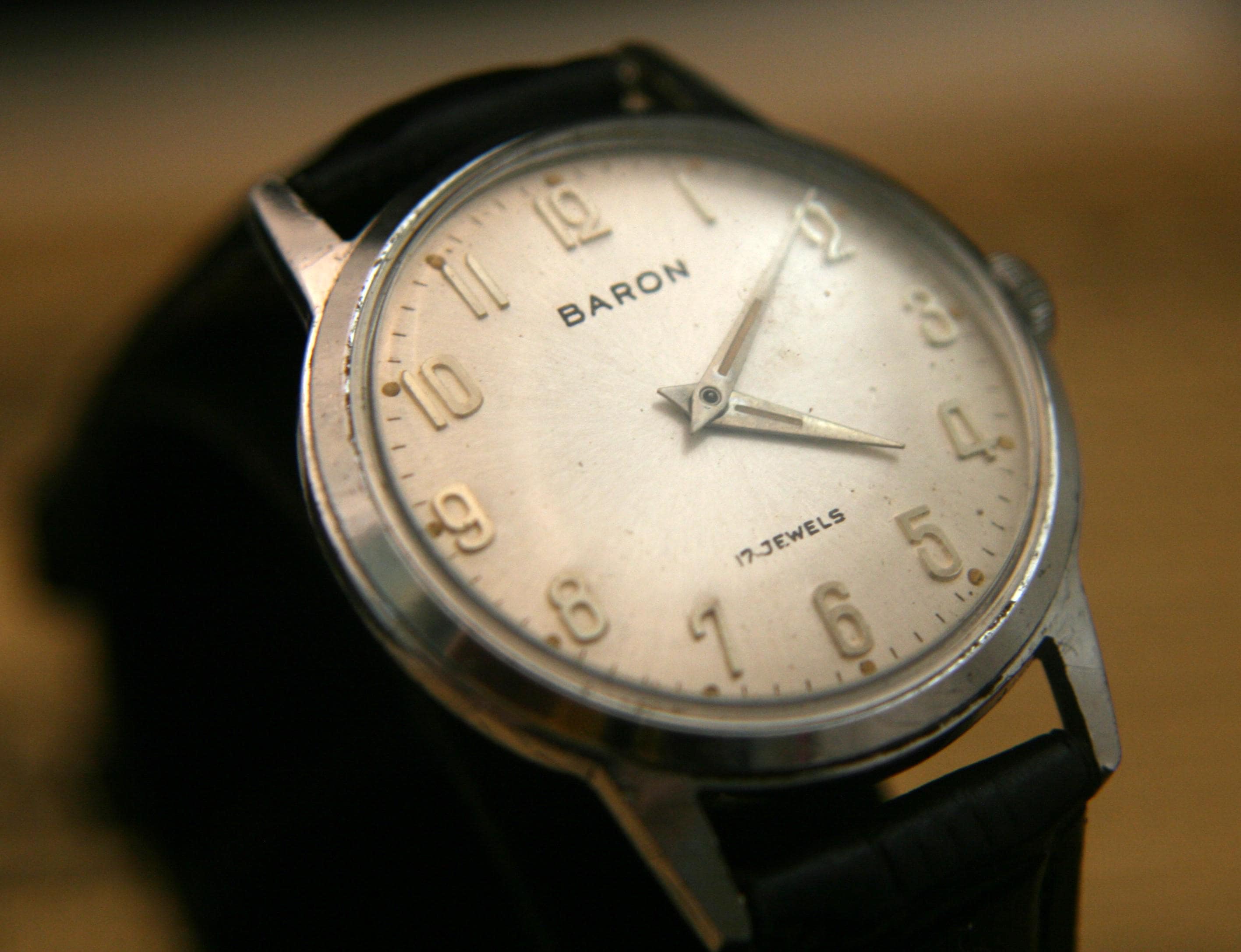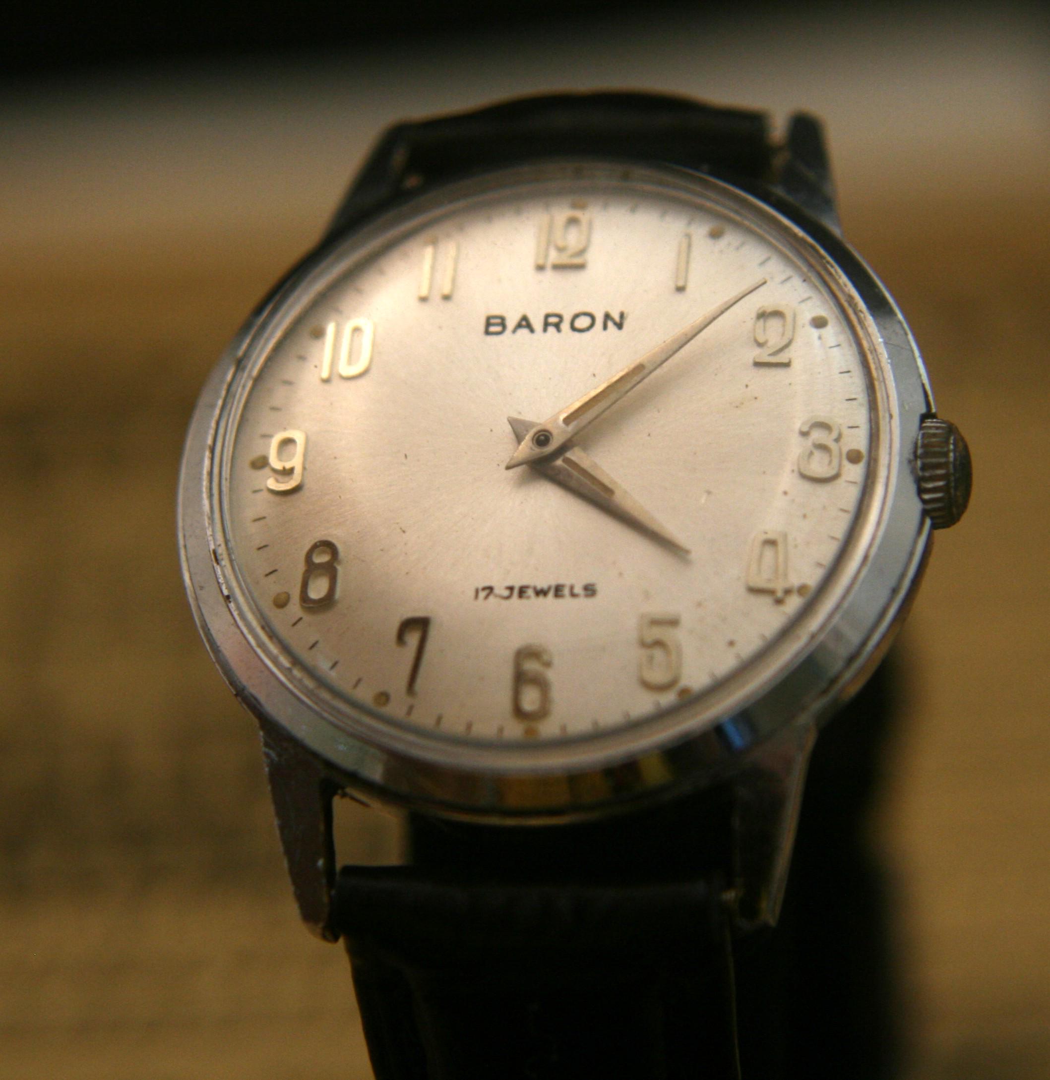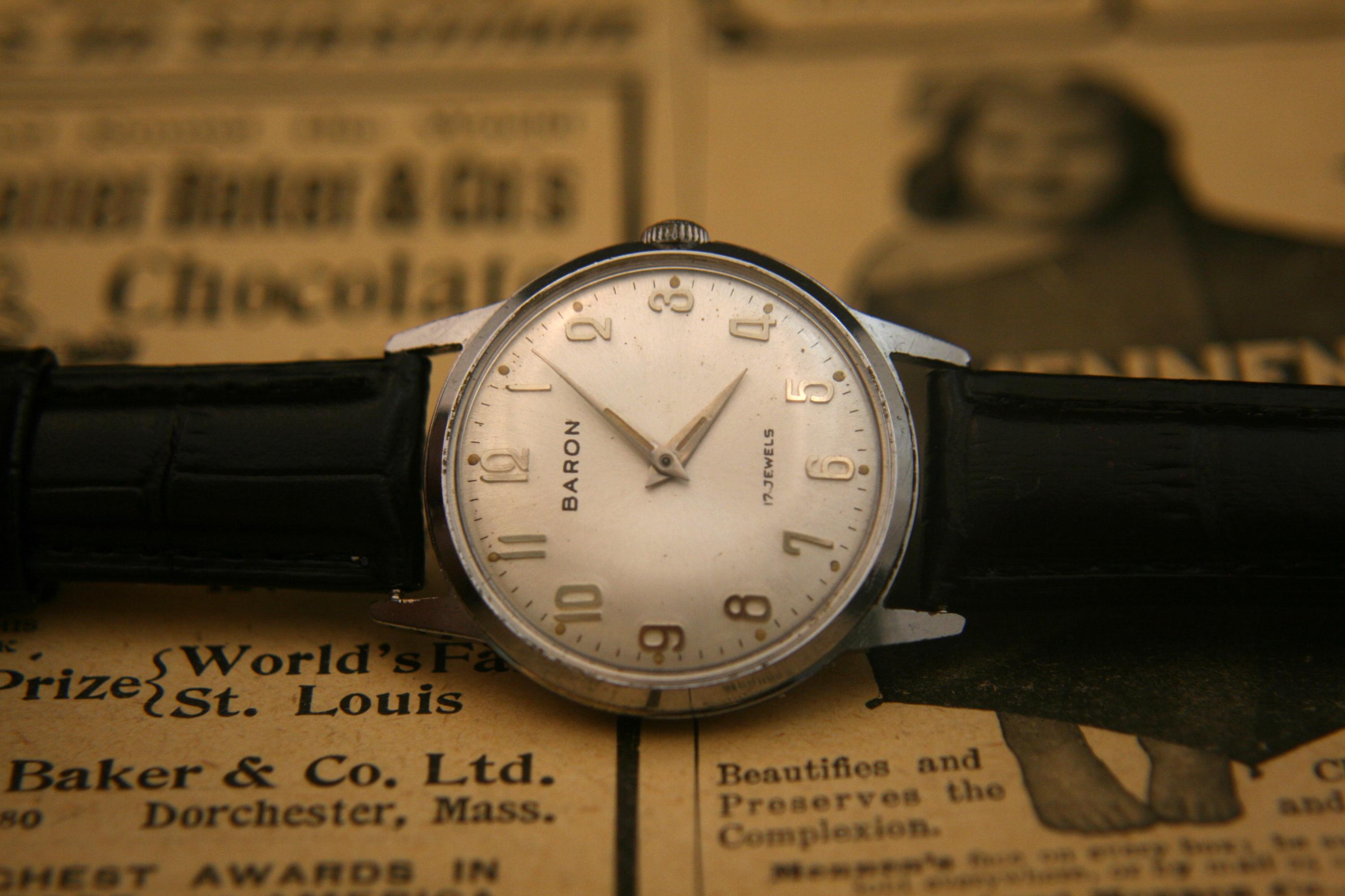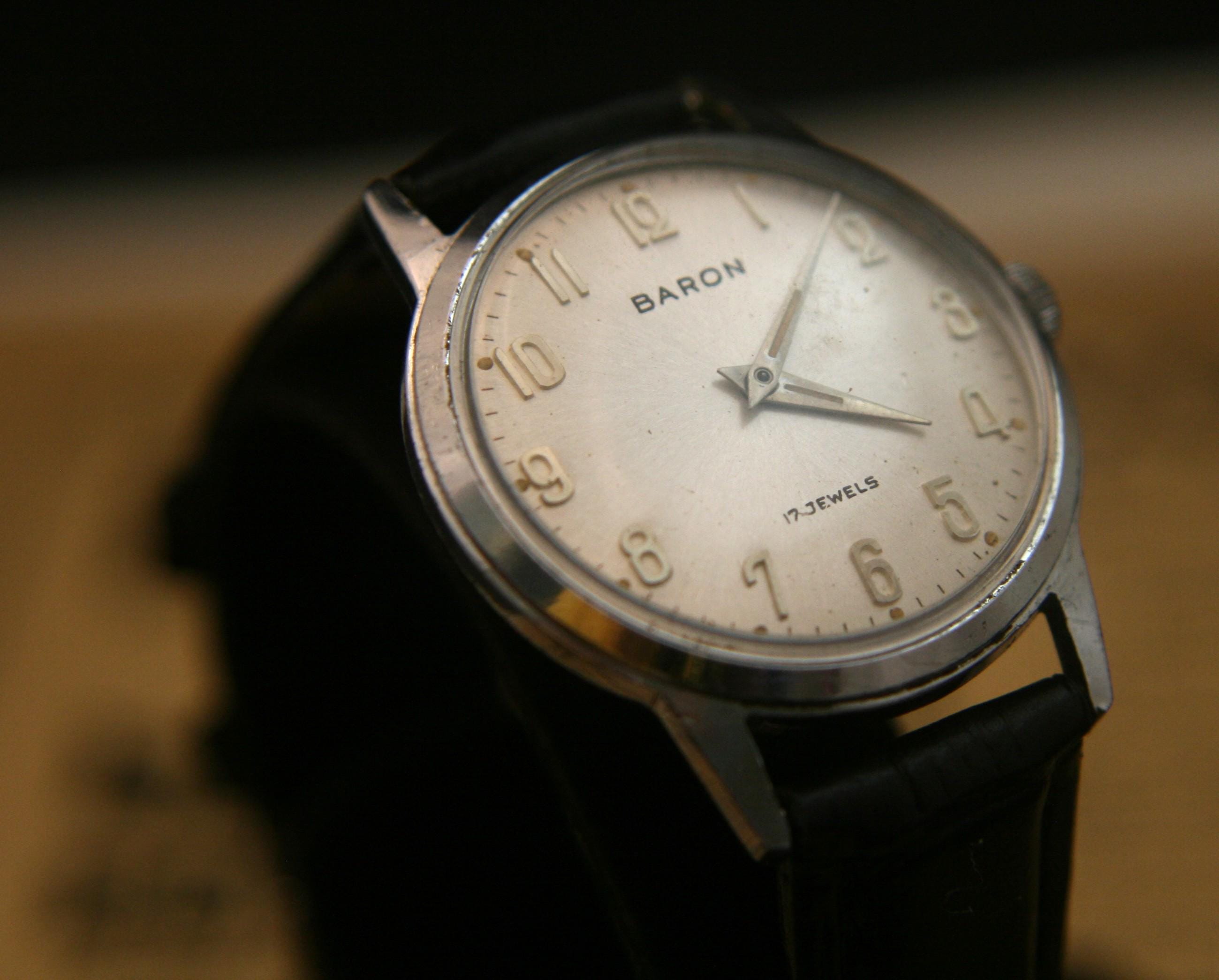 This is a well-preserved 17 jewel BARON men's wristwatch from the 1950's that would make an affordable addition to your watch collection or a great way to start one. It features a chrome plated case and back that measures 33 mm / 1/3" in diameter, excluding crown and lugs. The brushed silver dial is in great condition for a watch that is 70+ years old and is complimented by silver hour and minute hands, raised silver Arabic numbers, silver outer chapter. It is signed BARON, 17 jewels, all under a bright, clear new crystal! The manual wind movement sets and winds as it should, is running well and keeping very good time. It is shockproof with a snap-down back and is matched with a supple new black, genuine leather stitched and embossed 2-piece strap with stainless buckle.