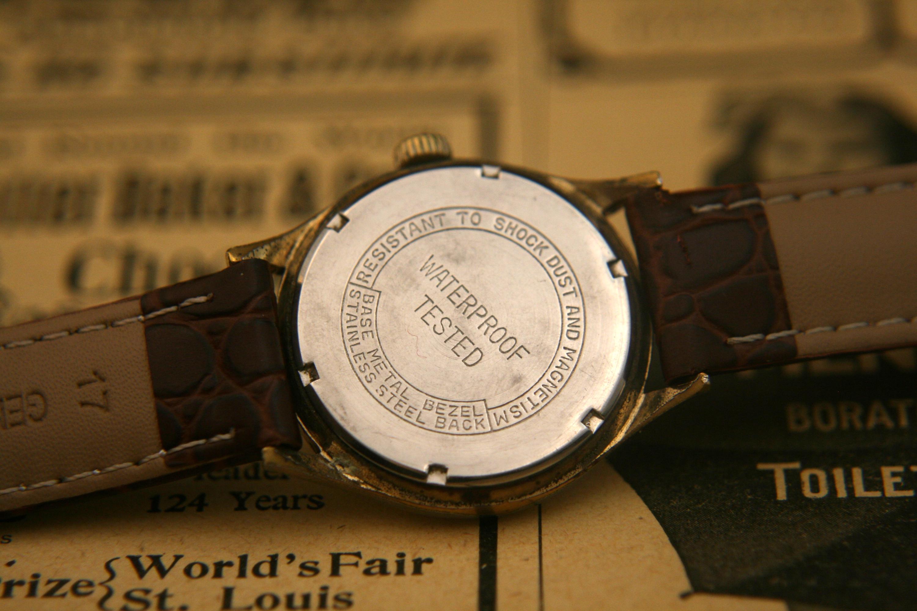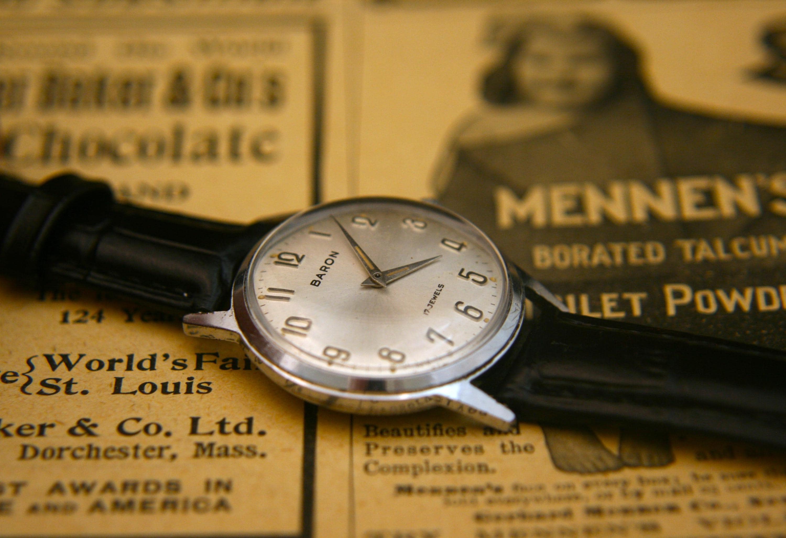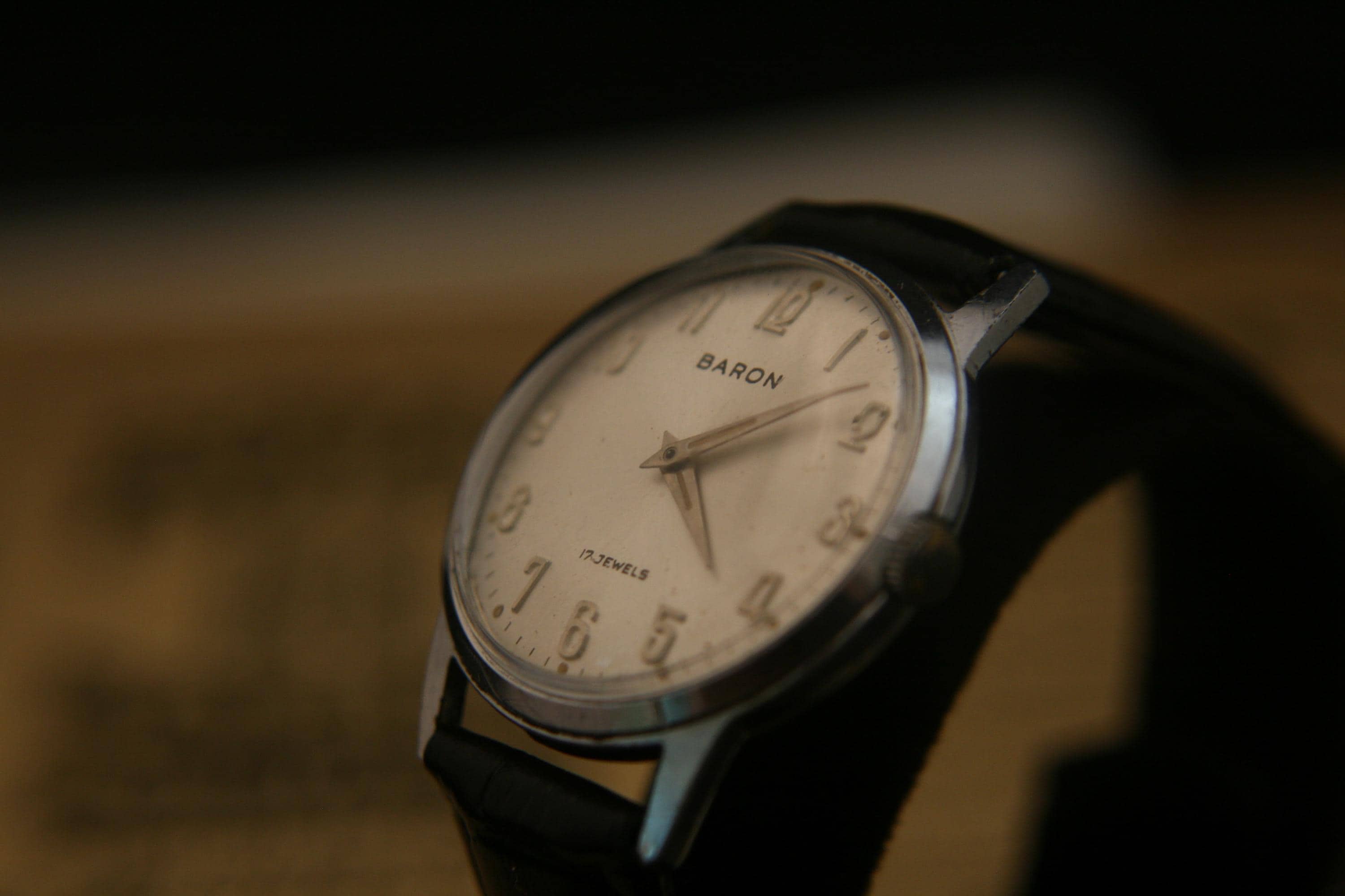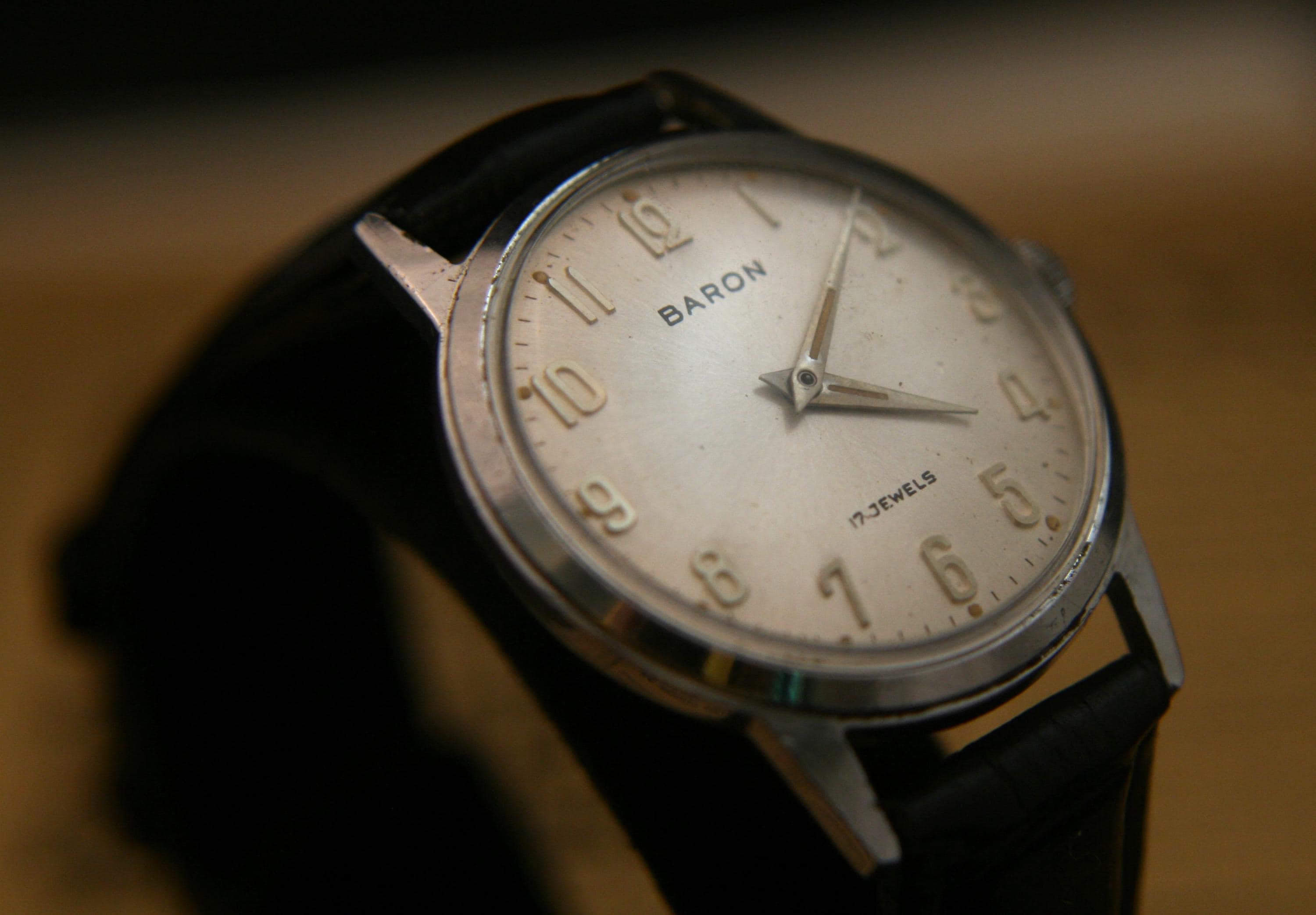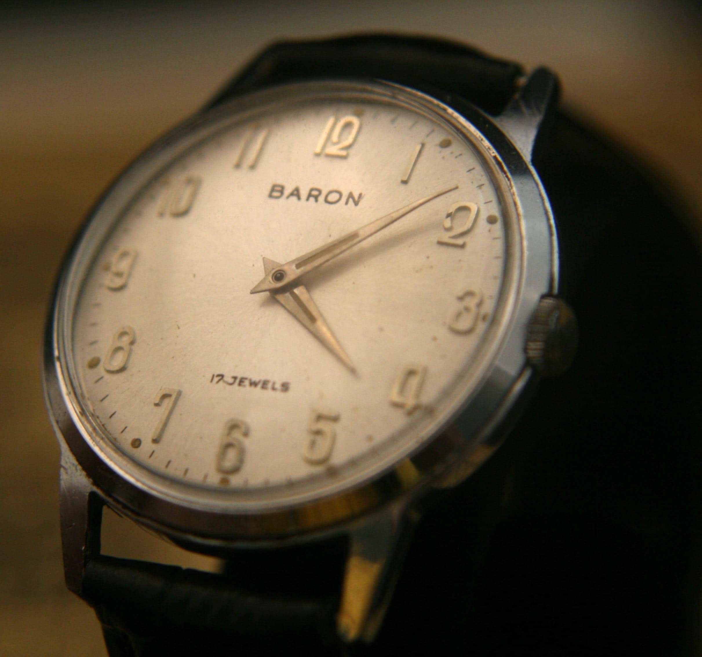 This is a well-preserved 17 jewel BARON men's wristwatch from the 1950's that would make an affordable addition to your watch collection or a great way to start one. It features a chrome plated case and back that measures 33 mm / 1/3" in diameter, excluding crown and lugs. The brushed silver dial is in great condition for a watch that is 70+ years old and is complimented by silver hour and minute hands, raised silver Arabic numbers, silver outer chapter. It is signed BARON, 17 jewels, all under a bright, clear new crystal! The manual wind movement sets and winds as it should, is running well and keeping very good time. It is shockproof with a snap-down back and is matched with a supple new black, genuine leather stitched and embossed 2-piece strap with stainless buckle.
