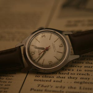The chrome plated brass case measures 32 mm / 1.2" in diameter, excluding crown and lugs and surrounds a beautiful parchment dial complimented by, once luminous, but now dimmed, black syringe hour and minute hands, red center sweep, black outlined Arabic numbers, back outer chapter, all under a bright, clear, new crystal.