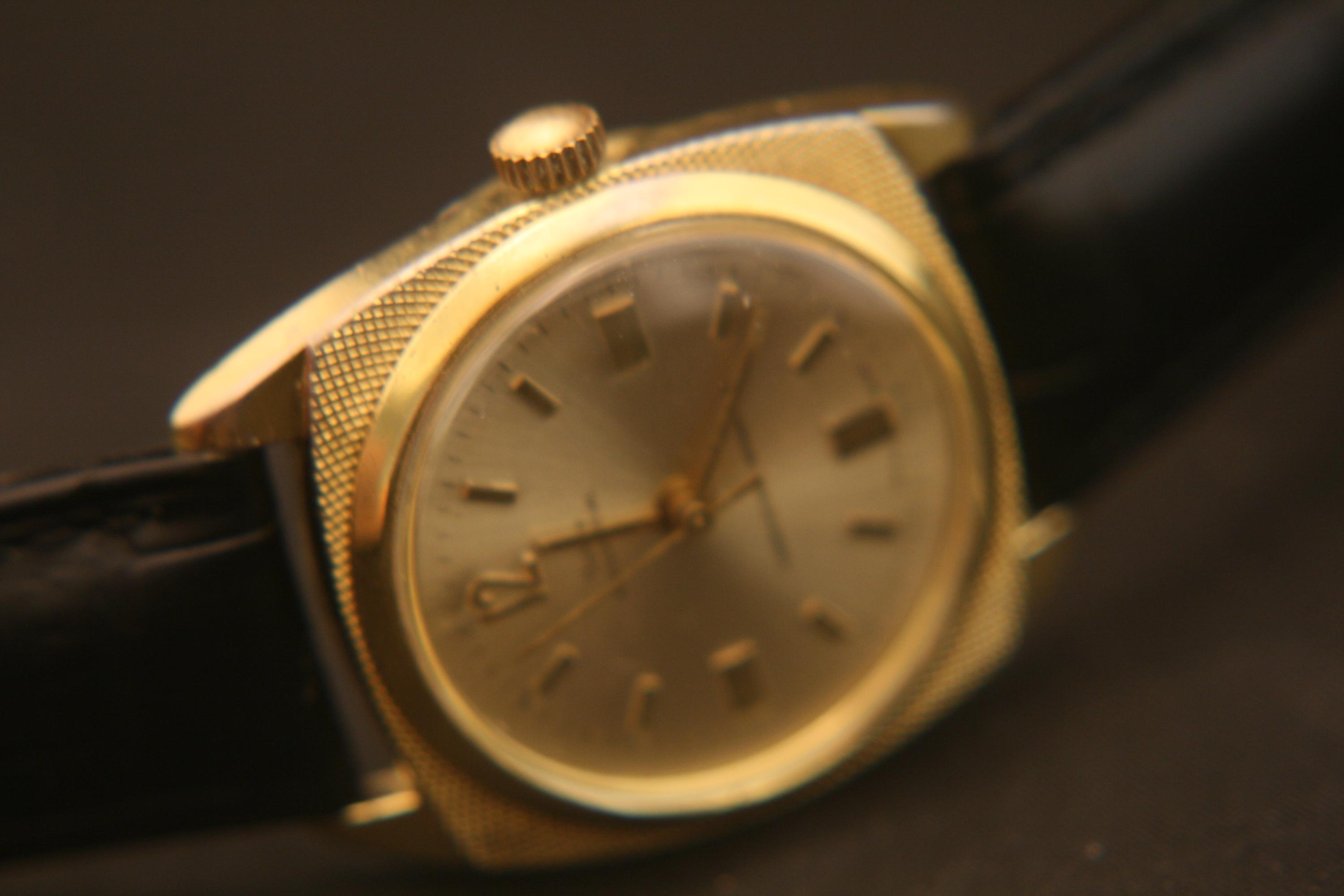 Manufactured in Switzerland it features a large 10 RGP bright and matte fancy case that measures 31.0 mm / 1.26 " square case, excluding crown and lugs.