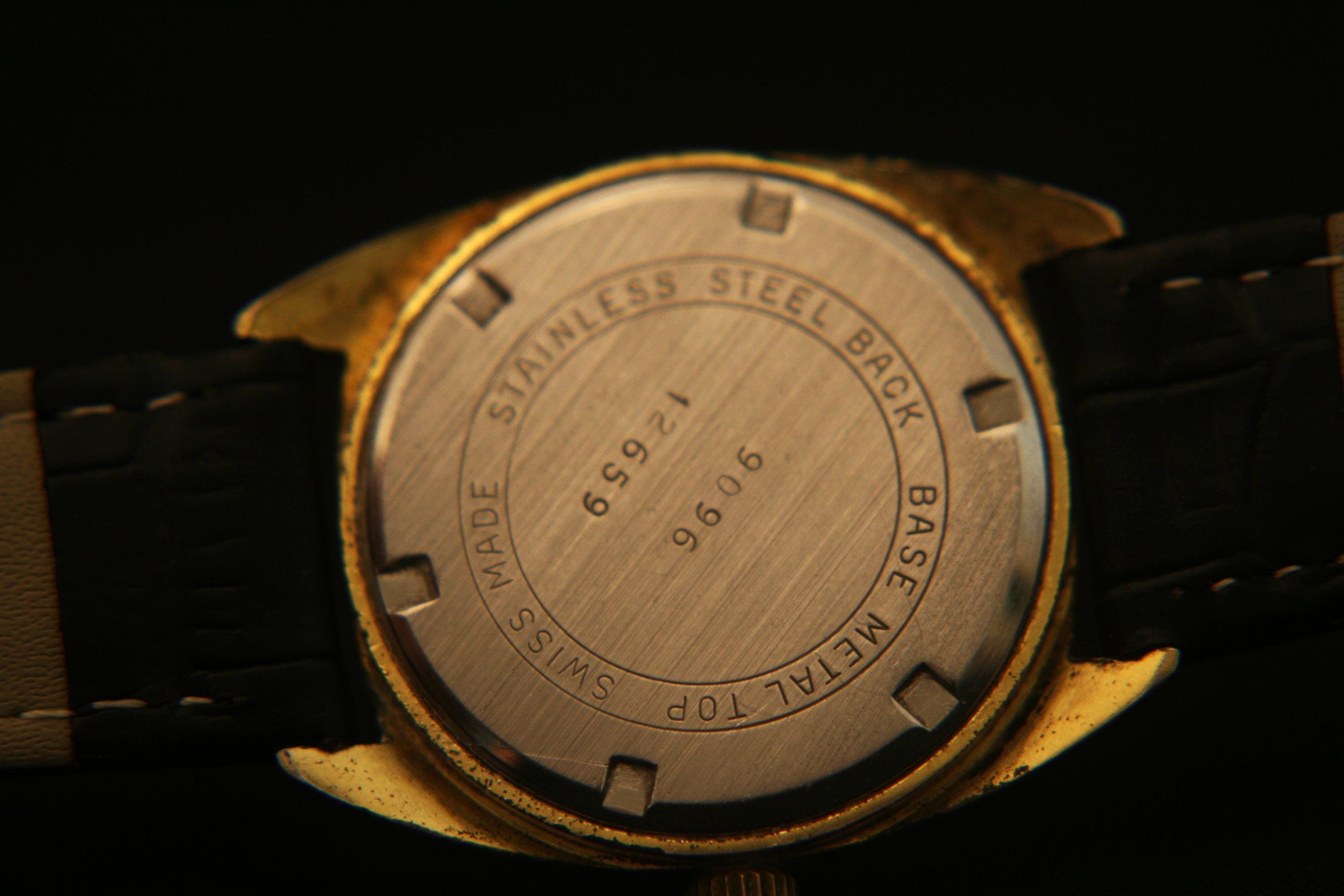 It has a stainless steel, screw-down back, and has been paired with a new, black, embossed genuine leather 18 mm strap with gold buckle which suits it perfectly.