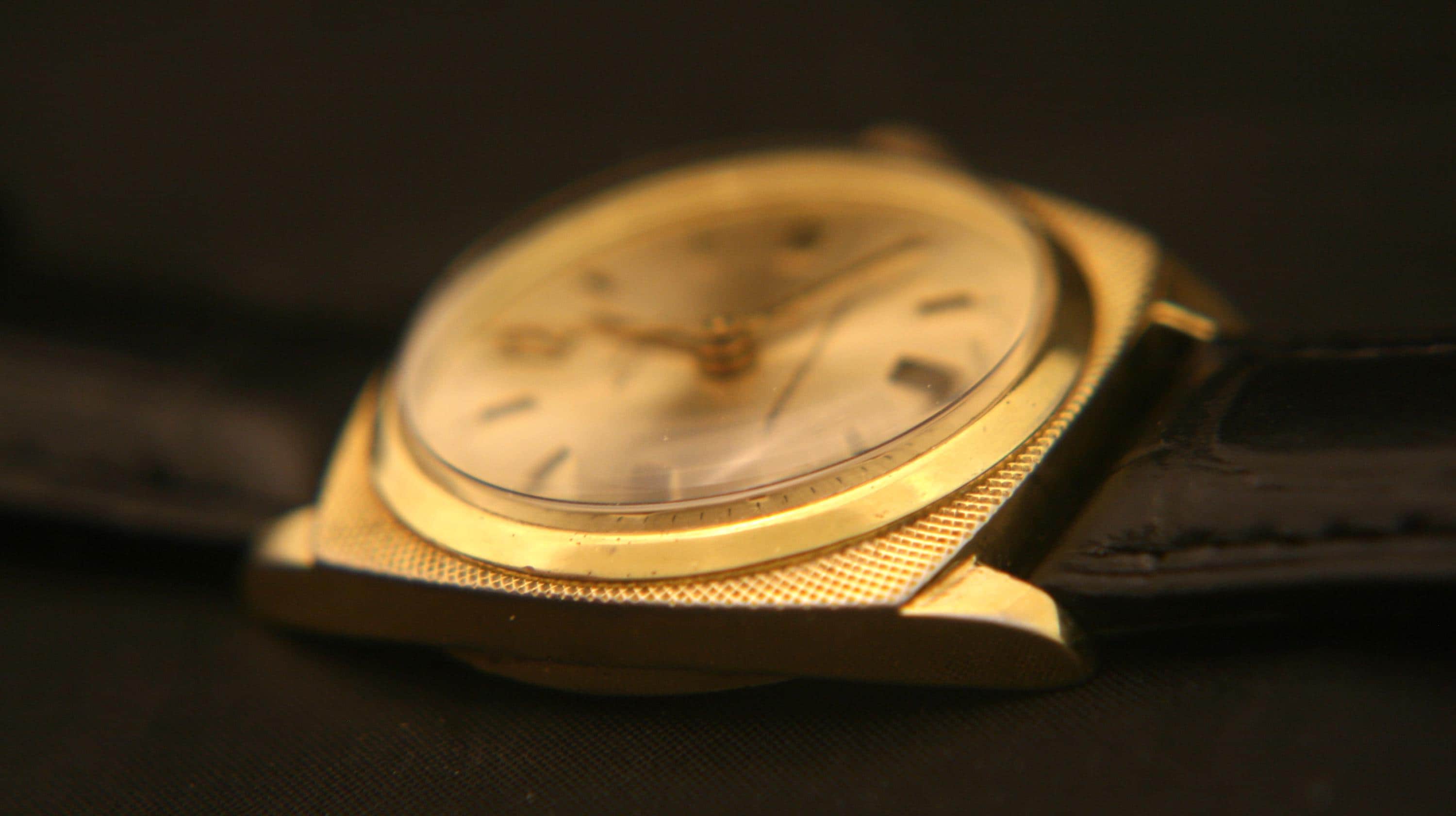 It surrounds a pristine soft gold dial complimented by gold stick hour and minute hands, gold central second, and raised gold baton markers and # 12.