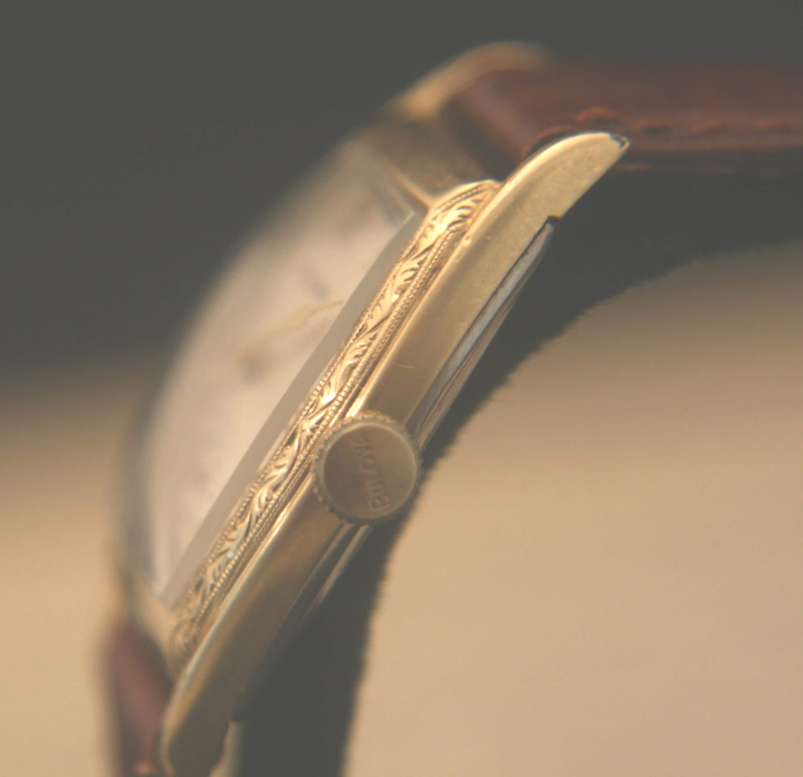 The 10K rolled gold plate tonneau fancy case, with beautifully engraved border. measures 22.4 mm X 20.2 mm, excluding signed crown and lugs.