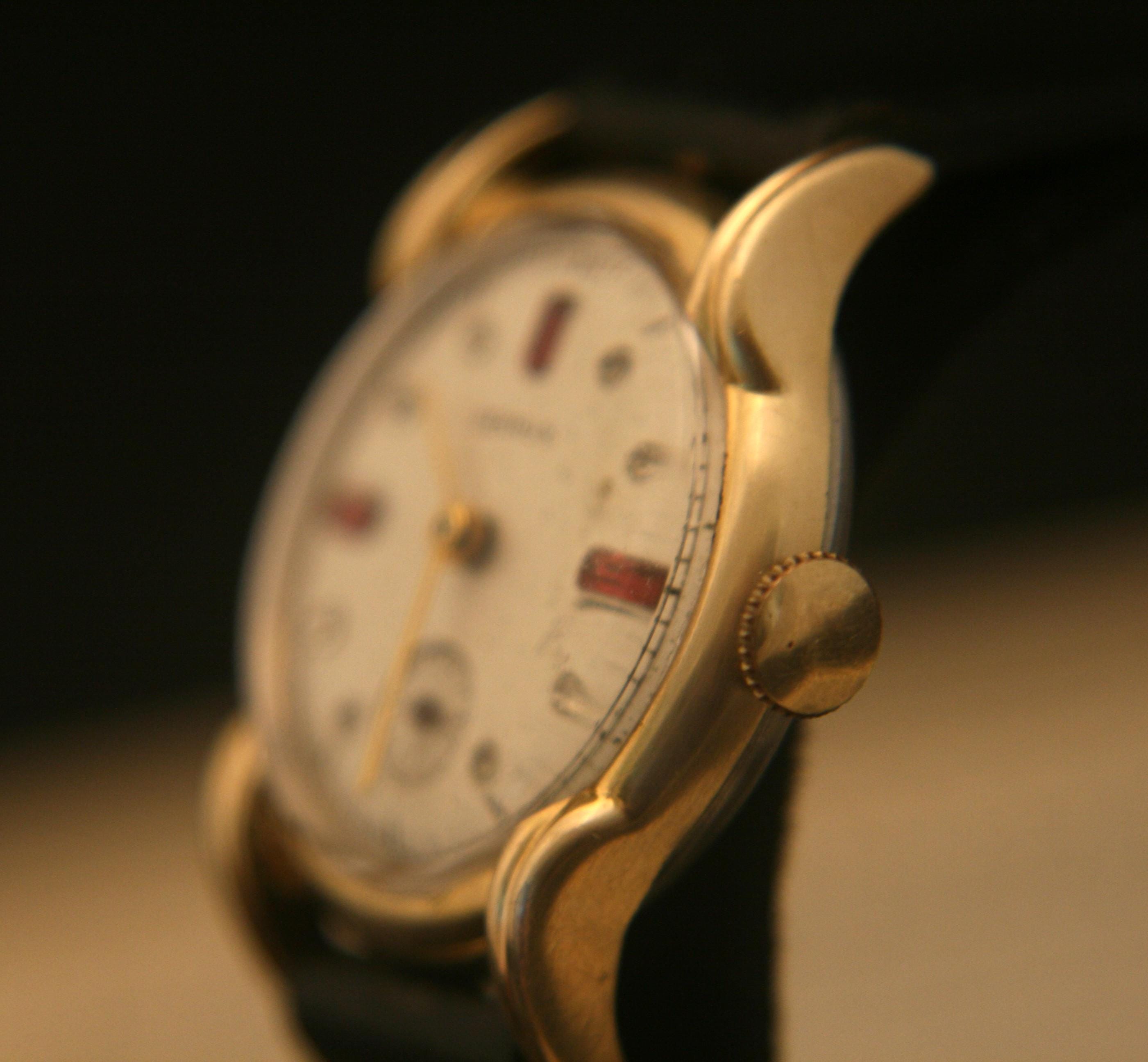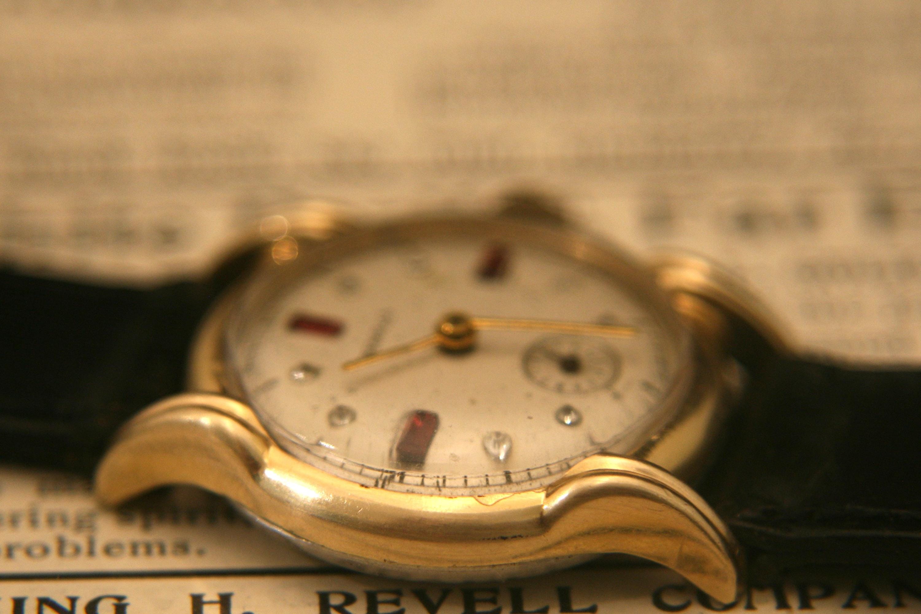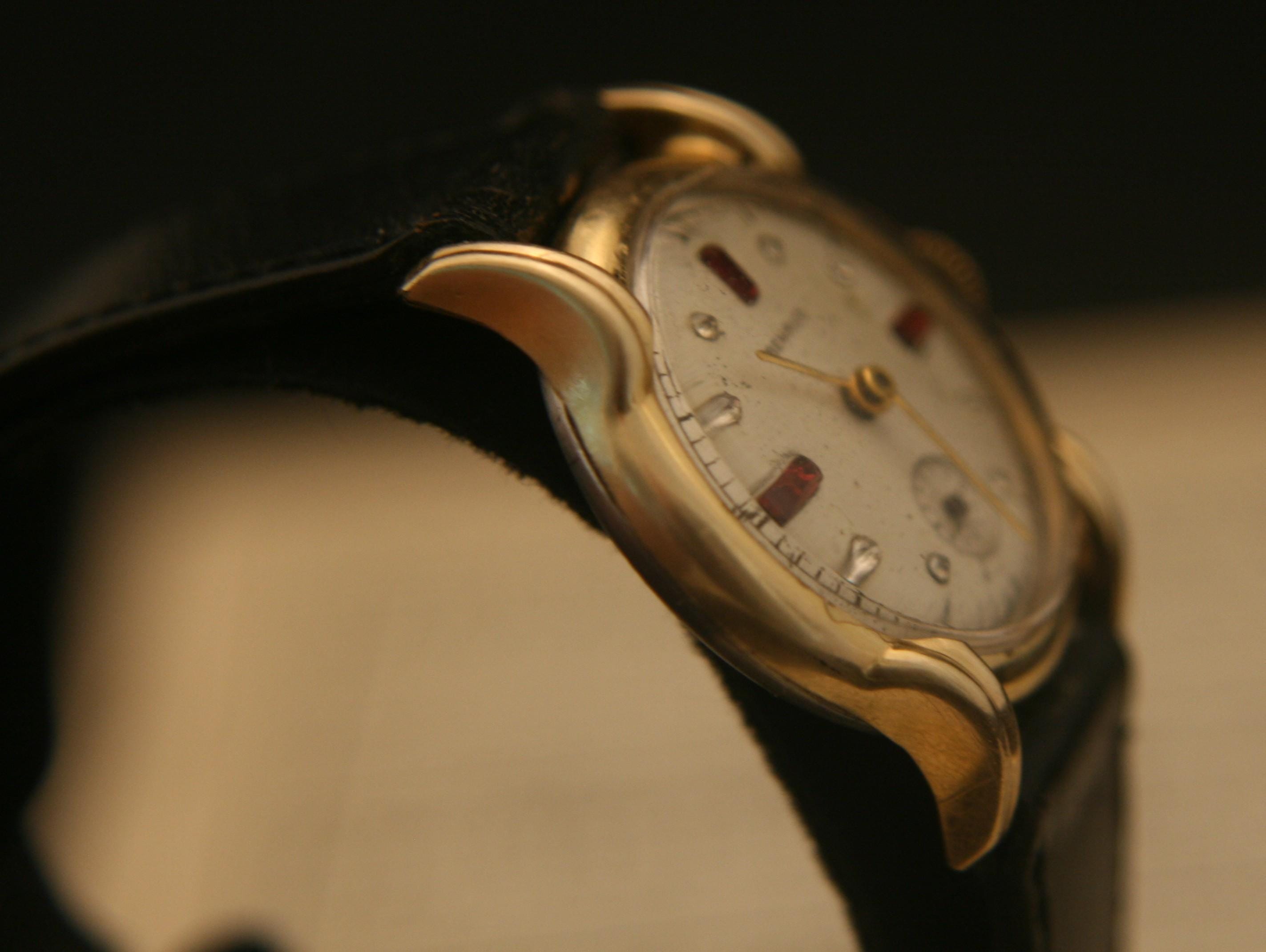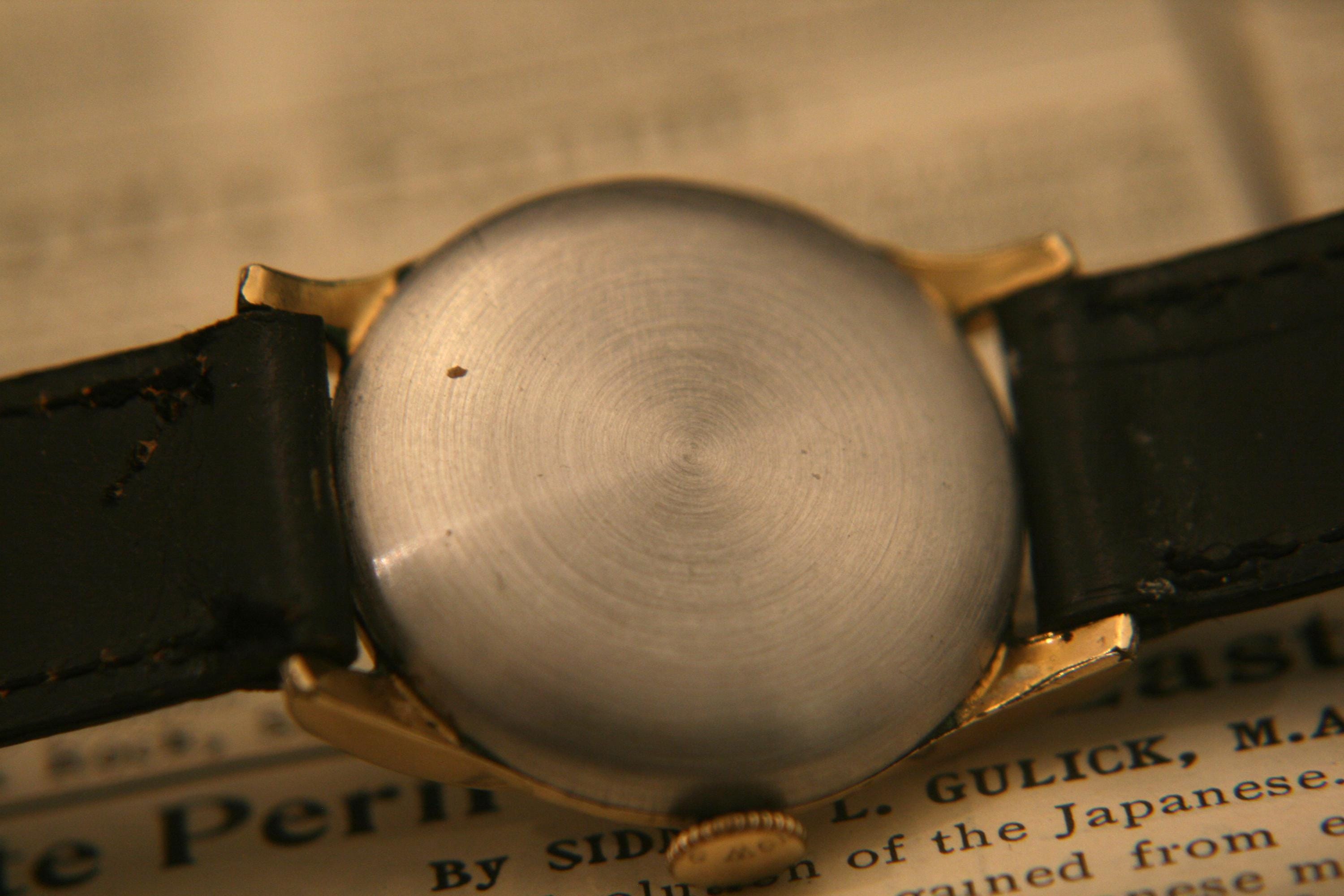 It features a 10K rolled gold, case with fancy horned lugs that measures 29.8 mm / 1.17" in diameter, excluding crown and lugs.