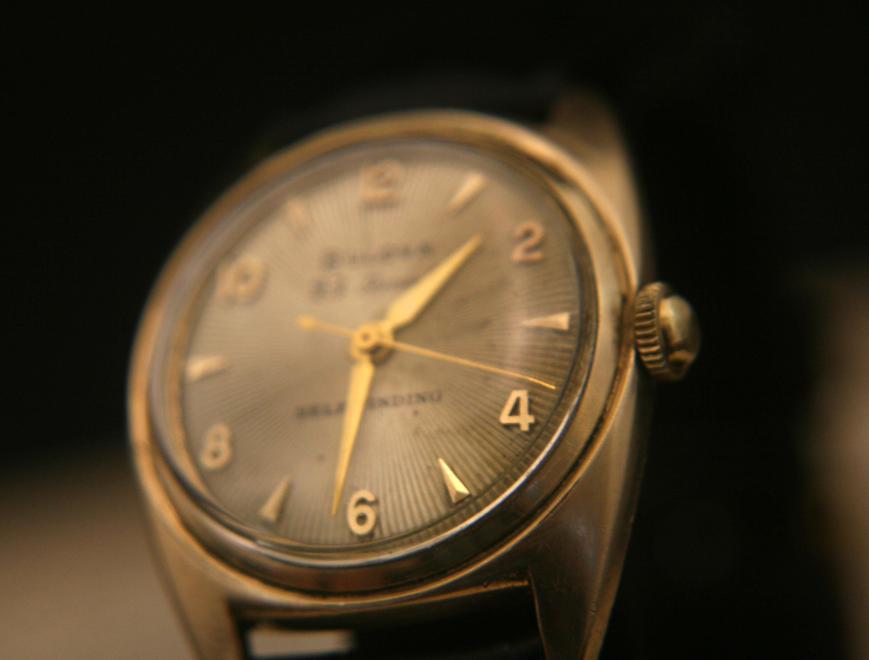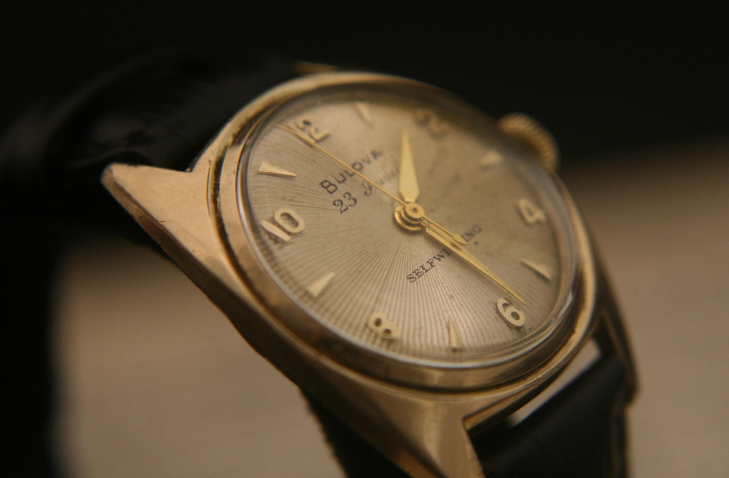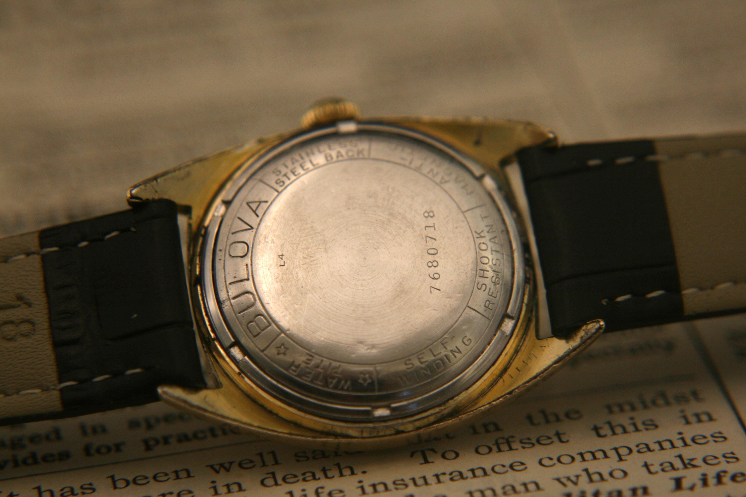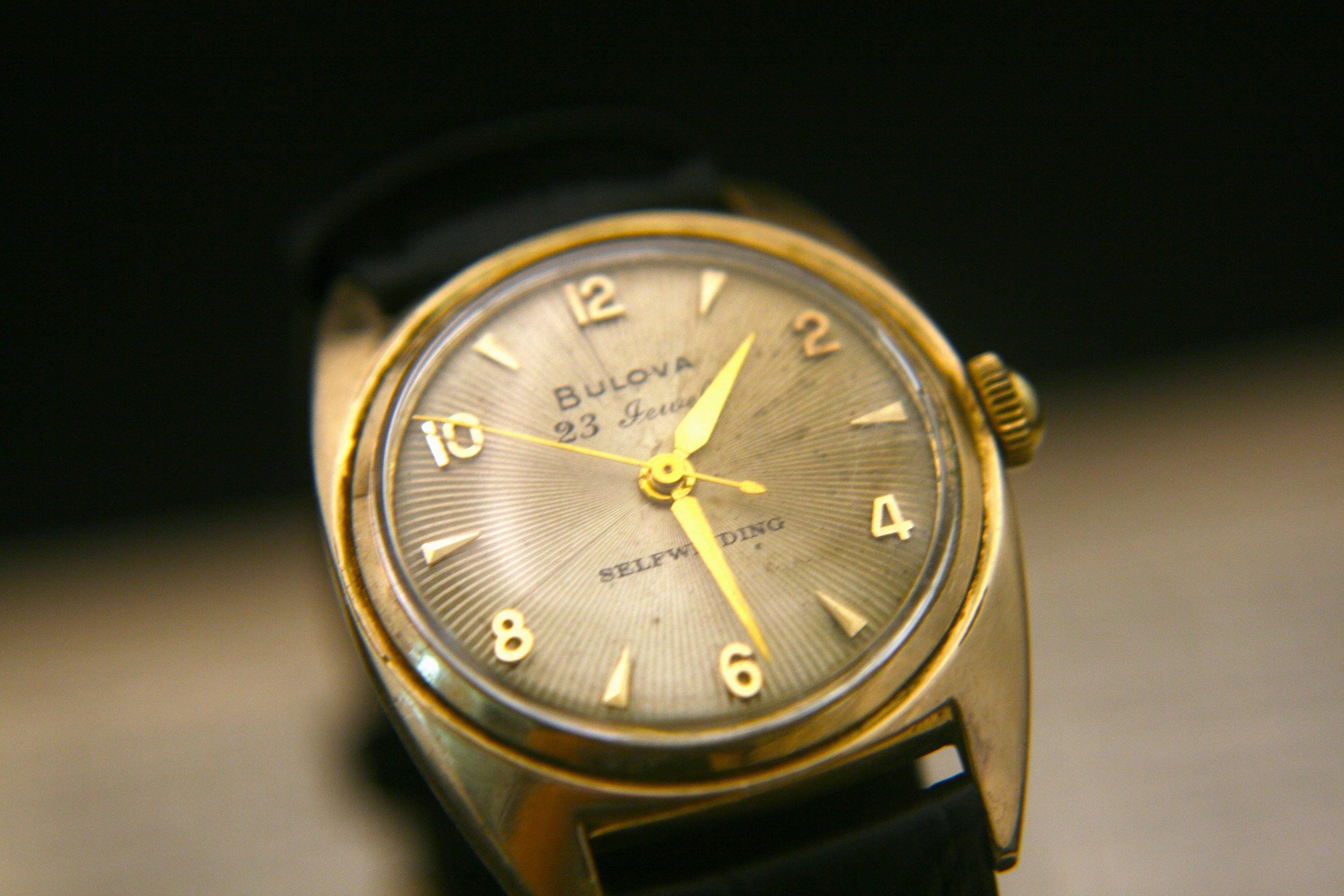 We are delighted to offer this handsome men's vintage 1954 gold American made Bulova 23 jewel, self winding wristwatch.