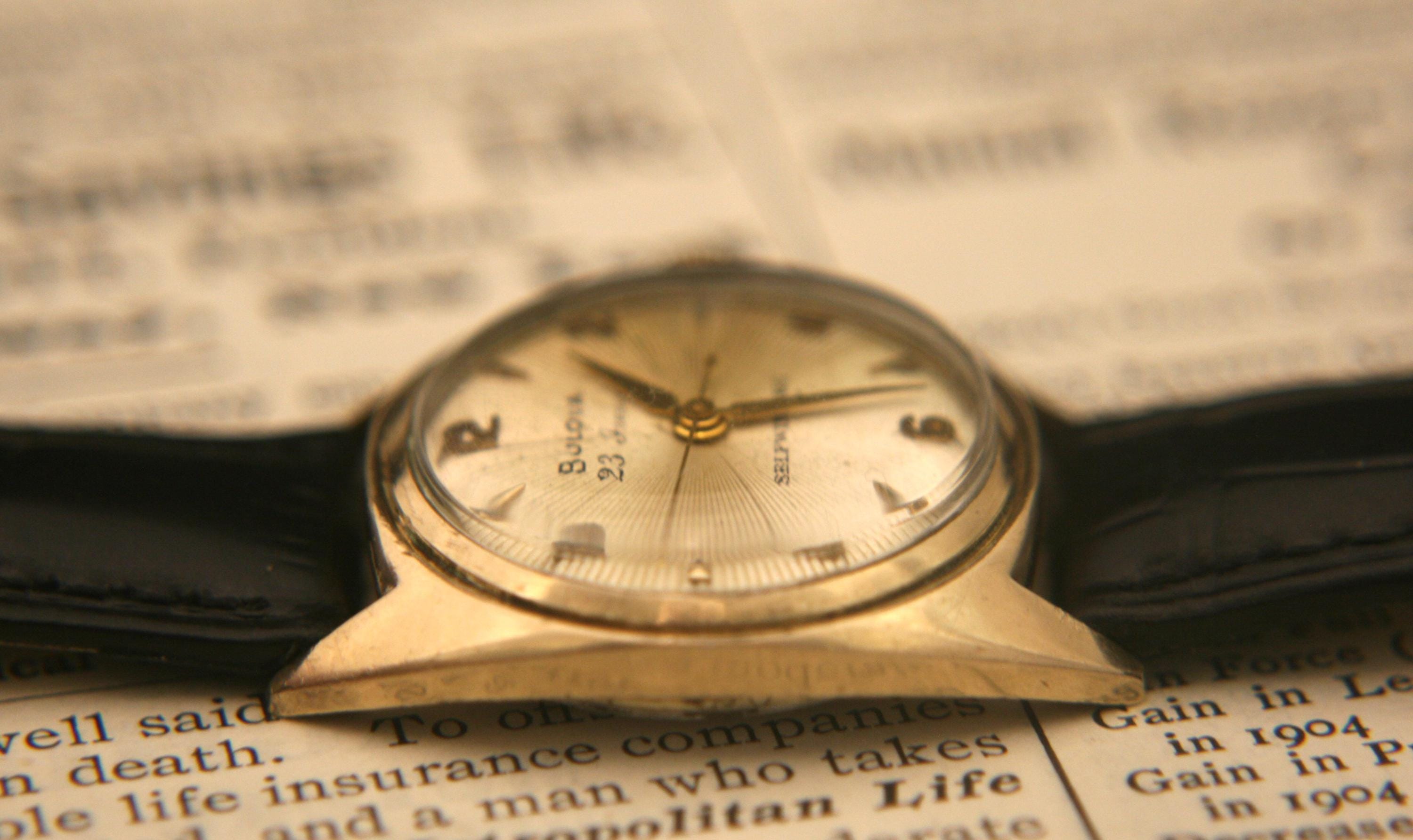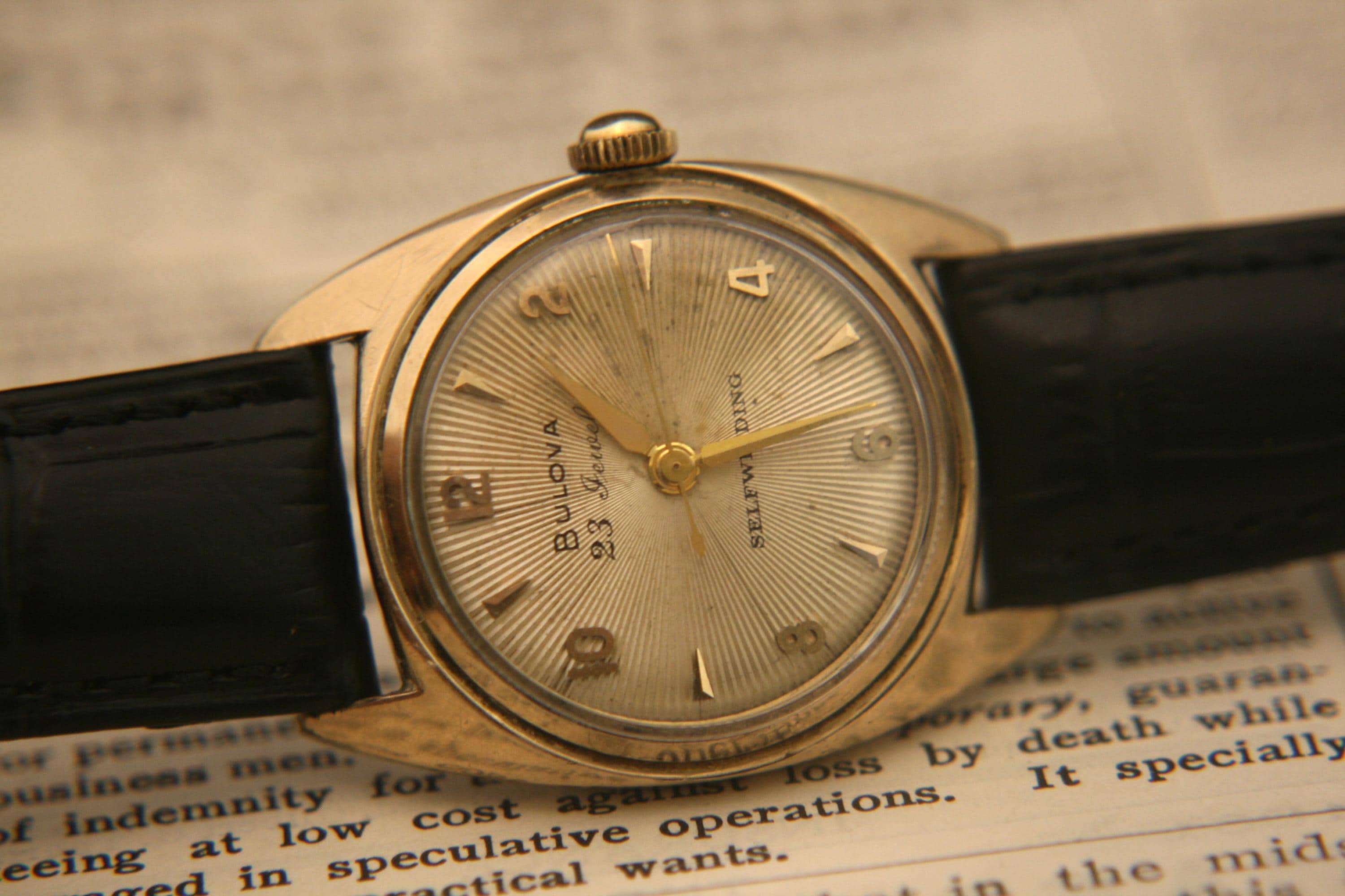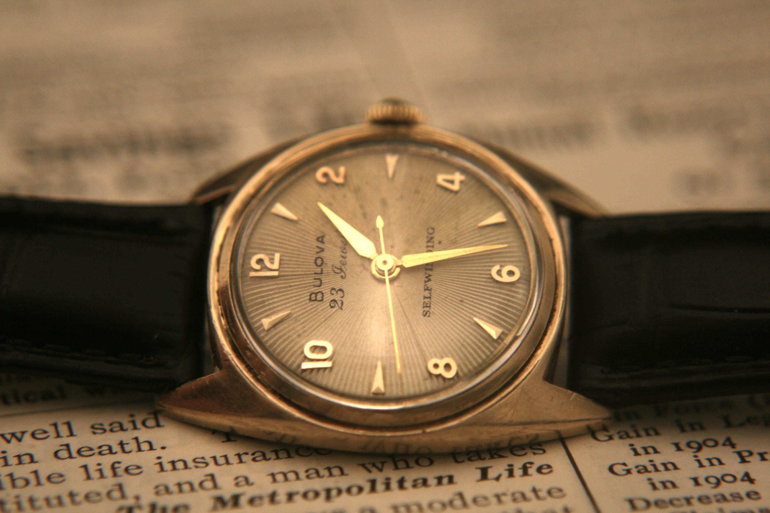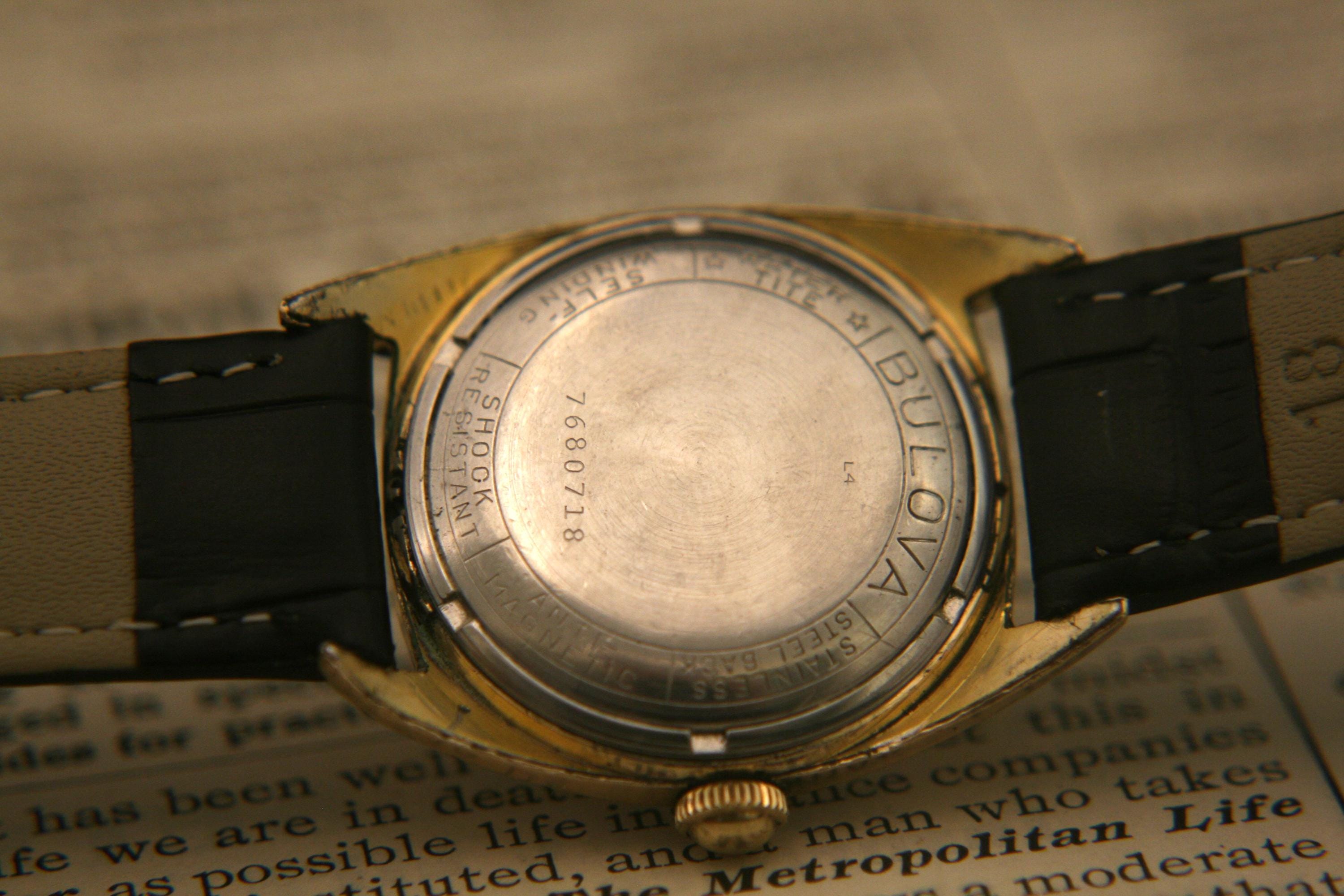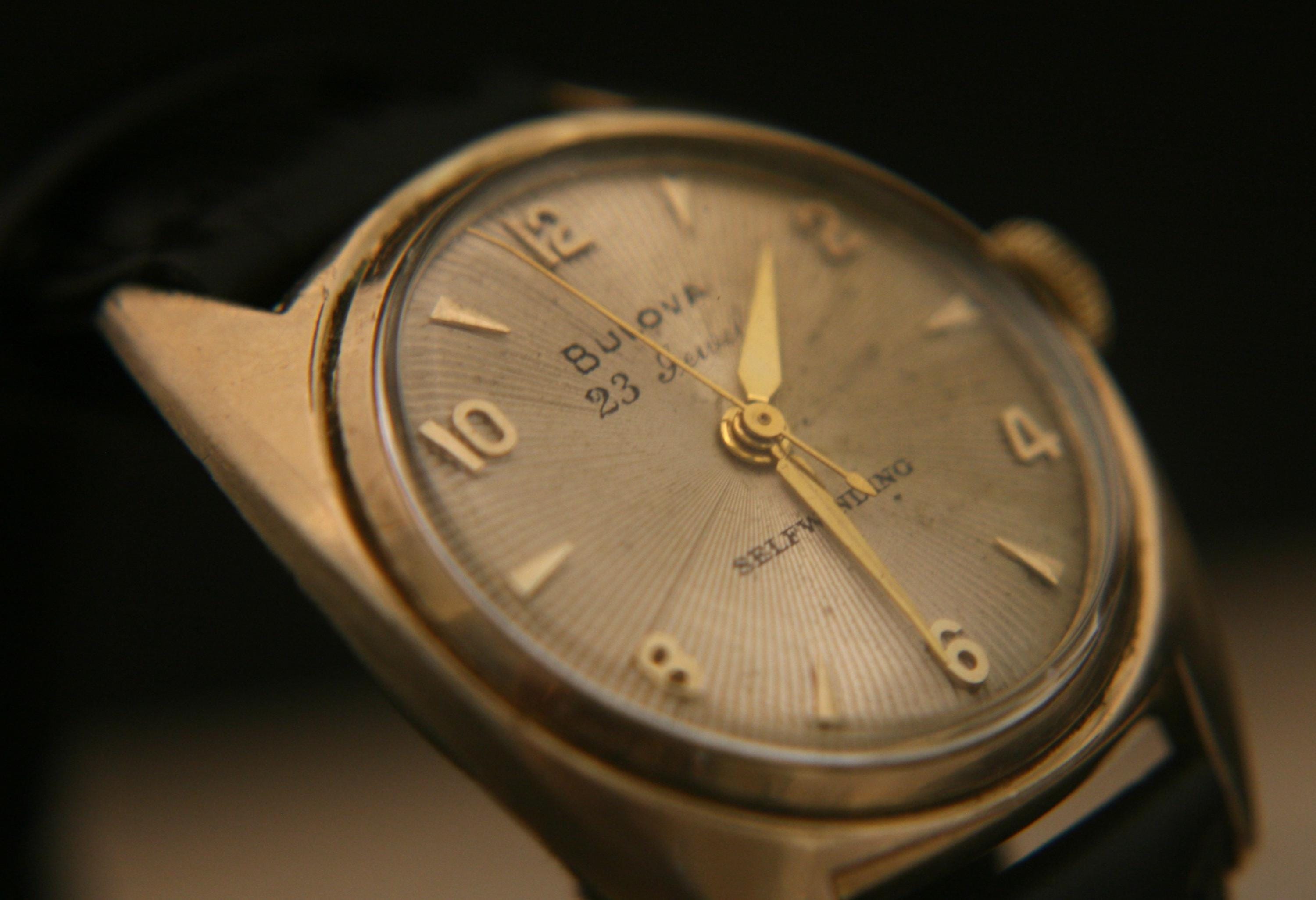 We are delighted to offer this handsome men's vintage 1954 gold American made Bulova 23 jewel, self winding wristwatch.