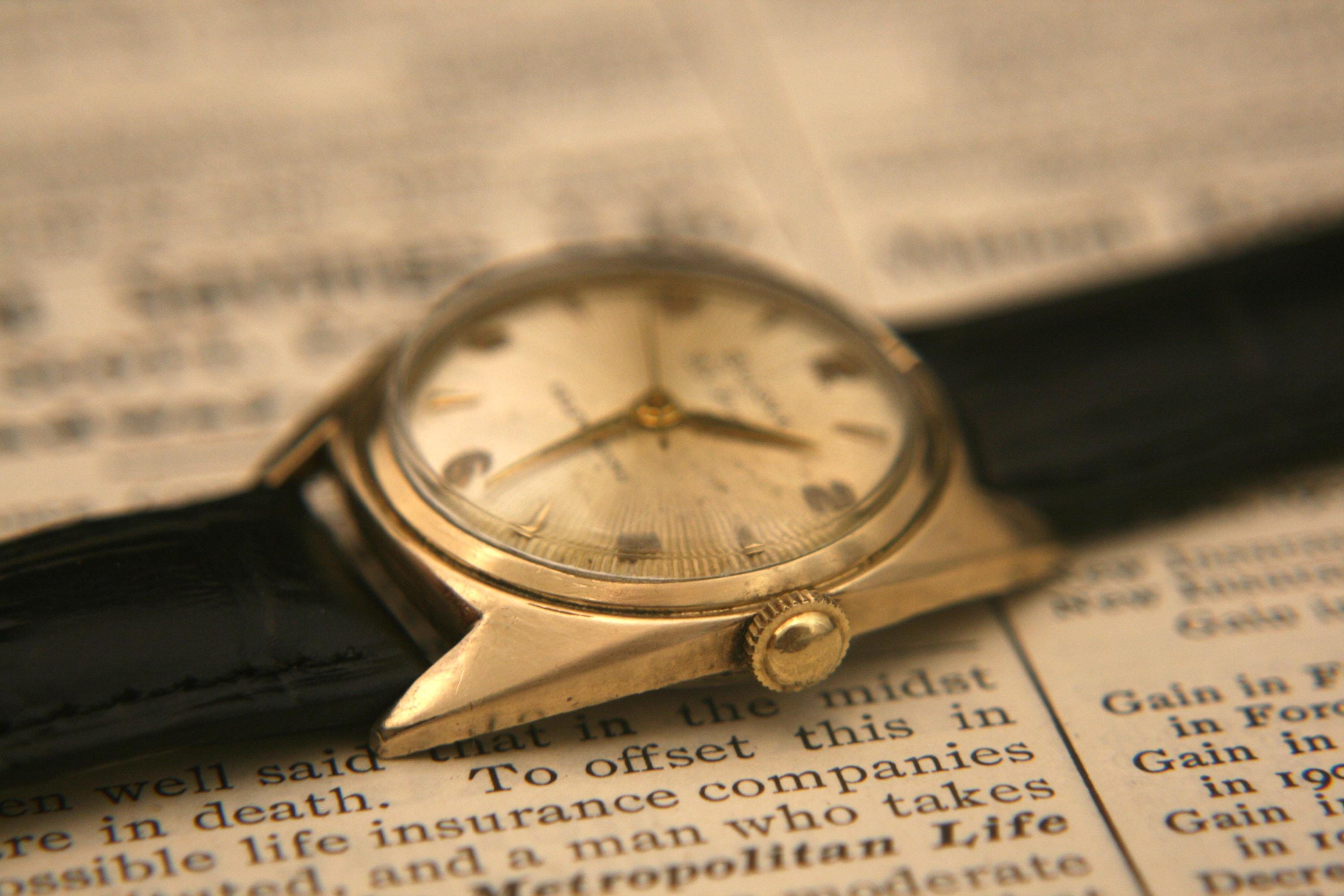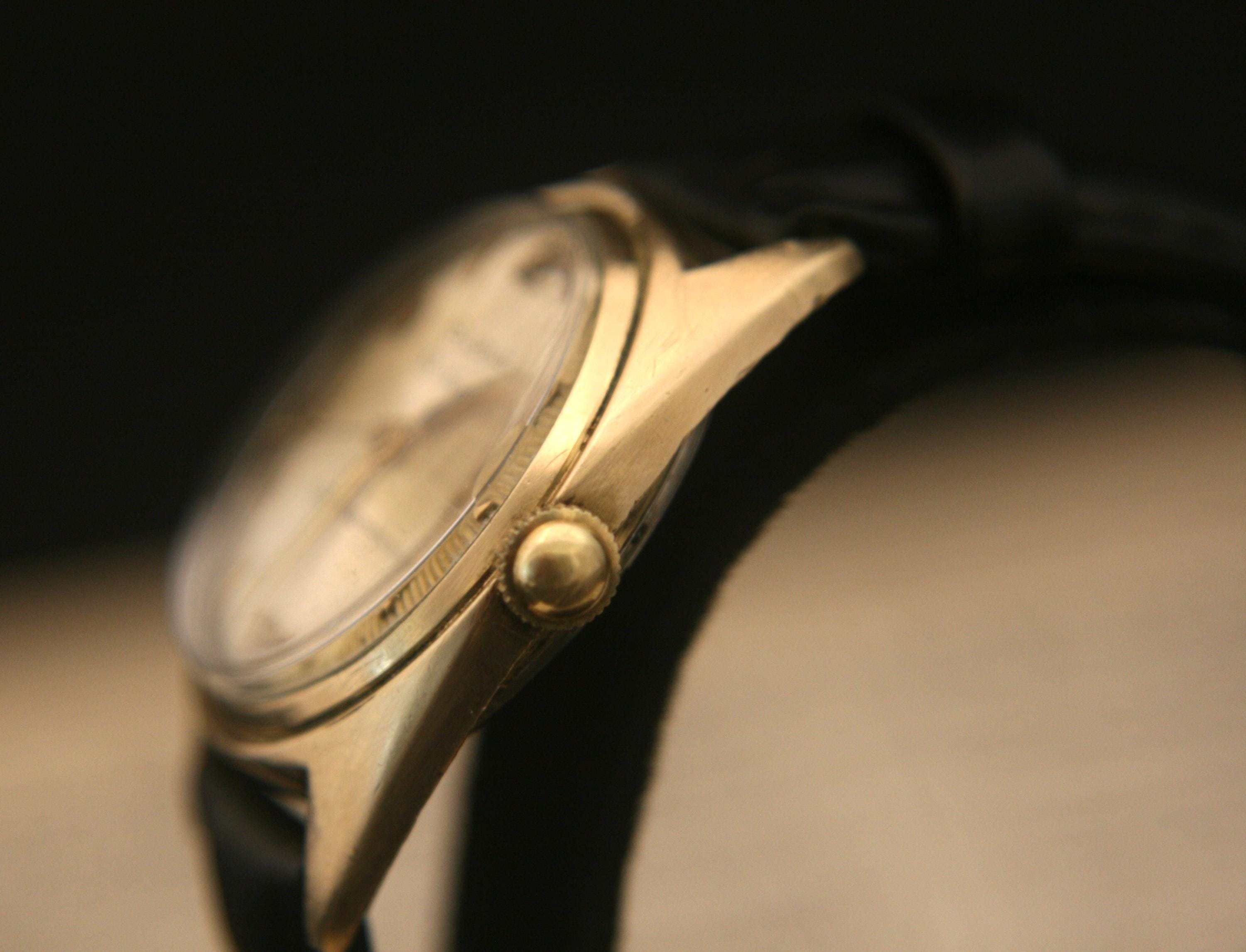 It features a 10K rolled gold case that measures 30.2mm (1.19") in diameter, excluding crown and lugs, that surrounds a very nice evenly-aged gold sunburst dial complimented by gold sword hour and minute hands, gold center sweep second hand, raised gold numbers and baton markers, all under a bright new crystal.