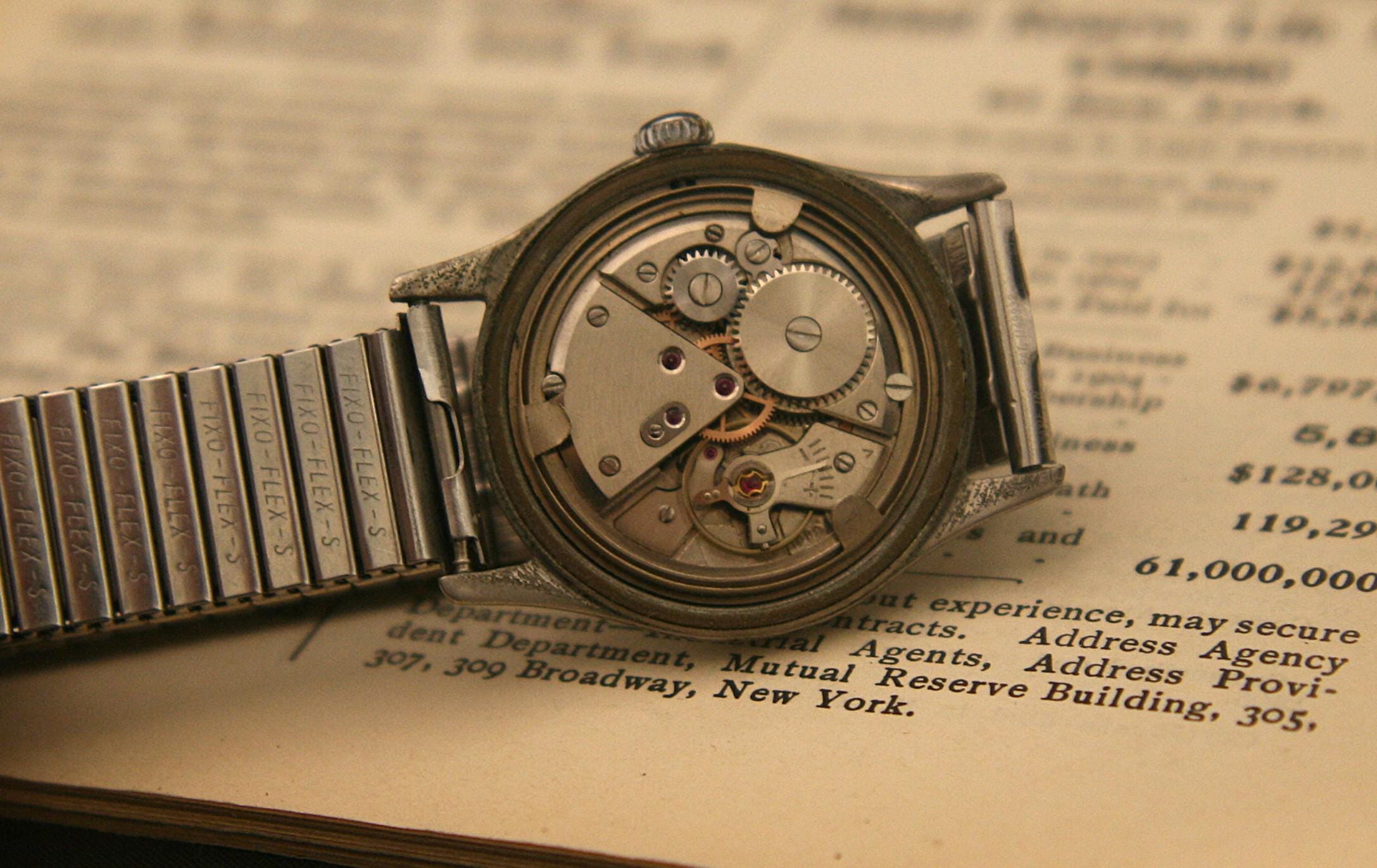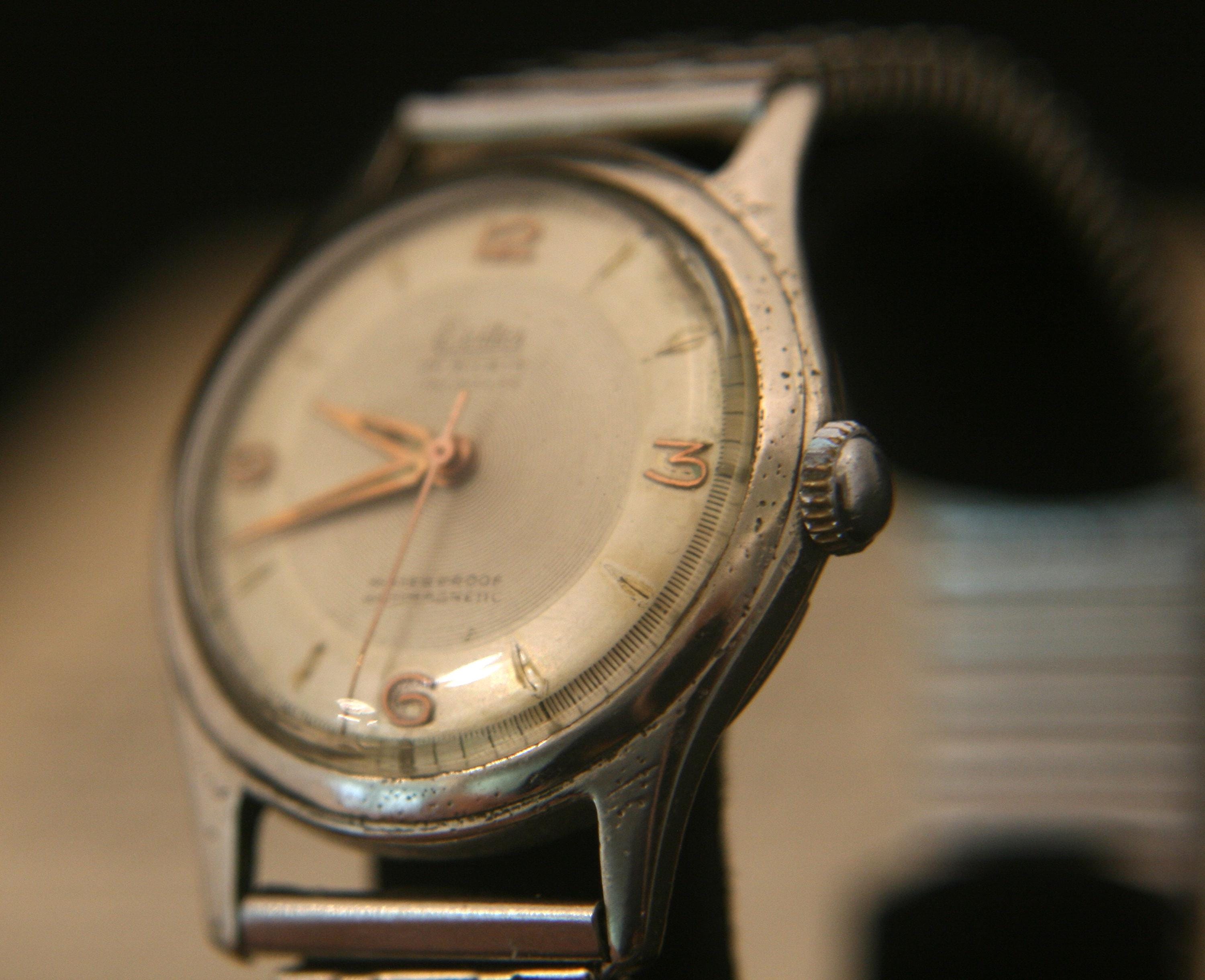 It is antimagnetic with a stainless, screw-down back and matched with a vintage stainless steel flex bracelet.
