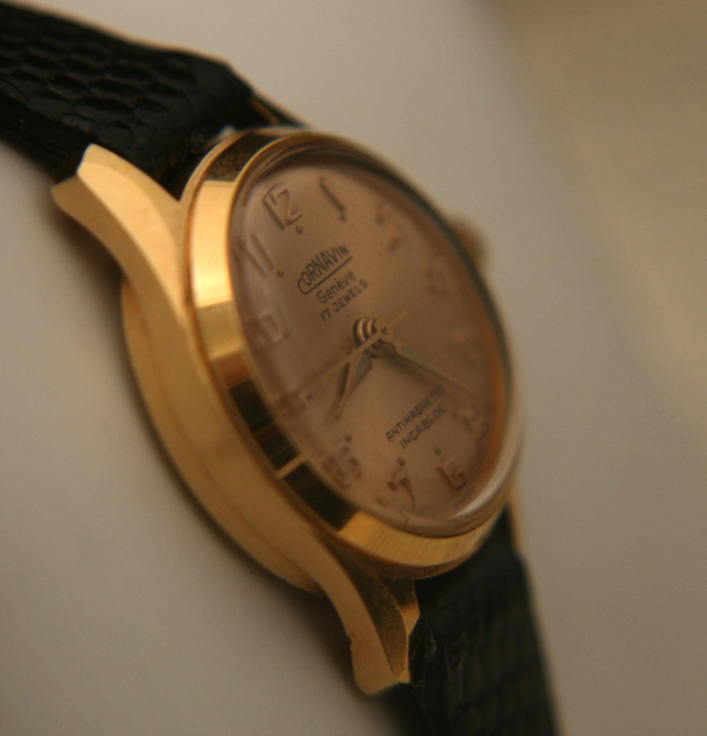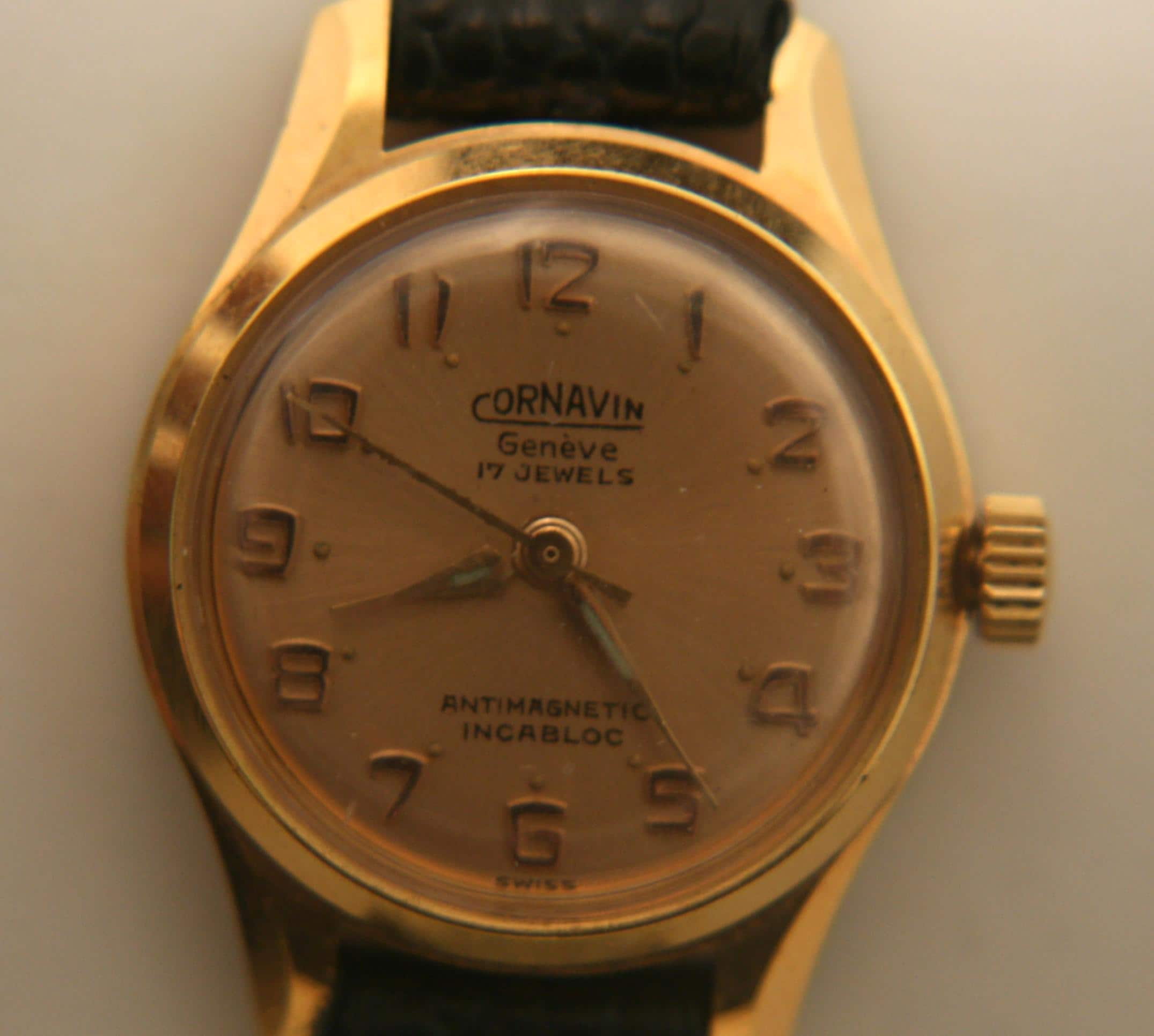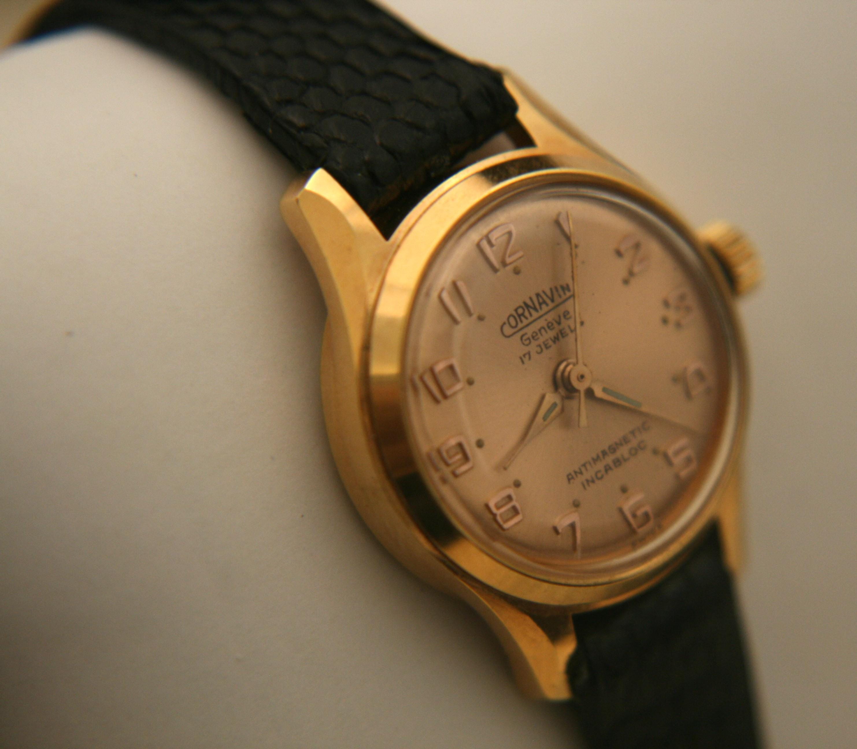 Manufactured in Switzerland by the Cornivan Geneve, this well-preserved timepiece features a 10K rolled gold plate case measures 22.7 mm / 0/.89" in diameter, excluding crown and lugs.