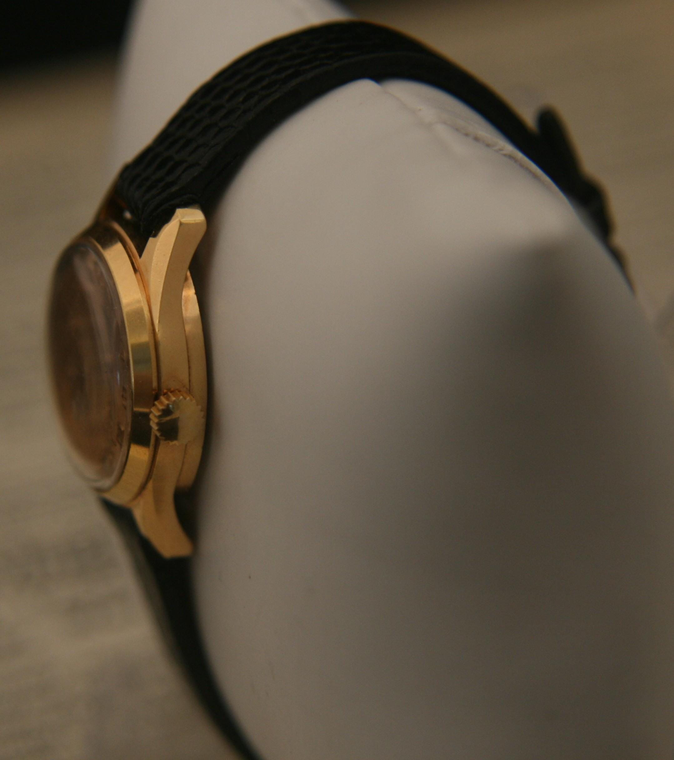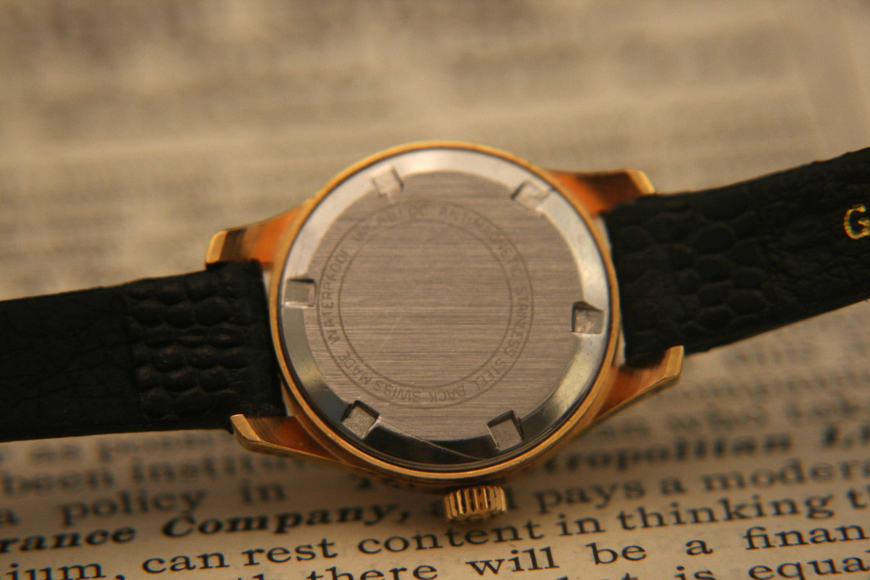 It is antimagnetic with a stainless steel, screw-down back and has been fitted with a supple new black, genuine leather 2-piece strap with gold buckle.