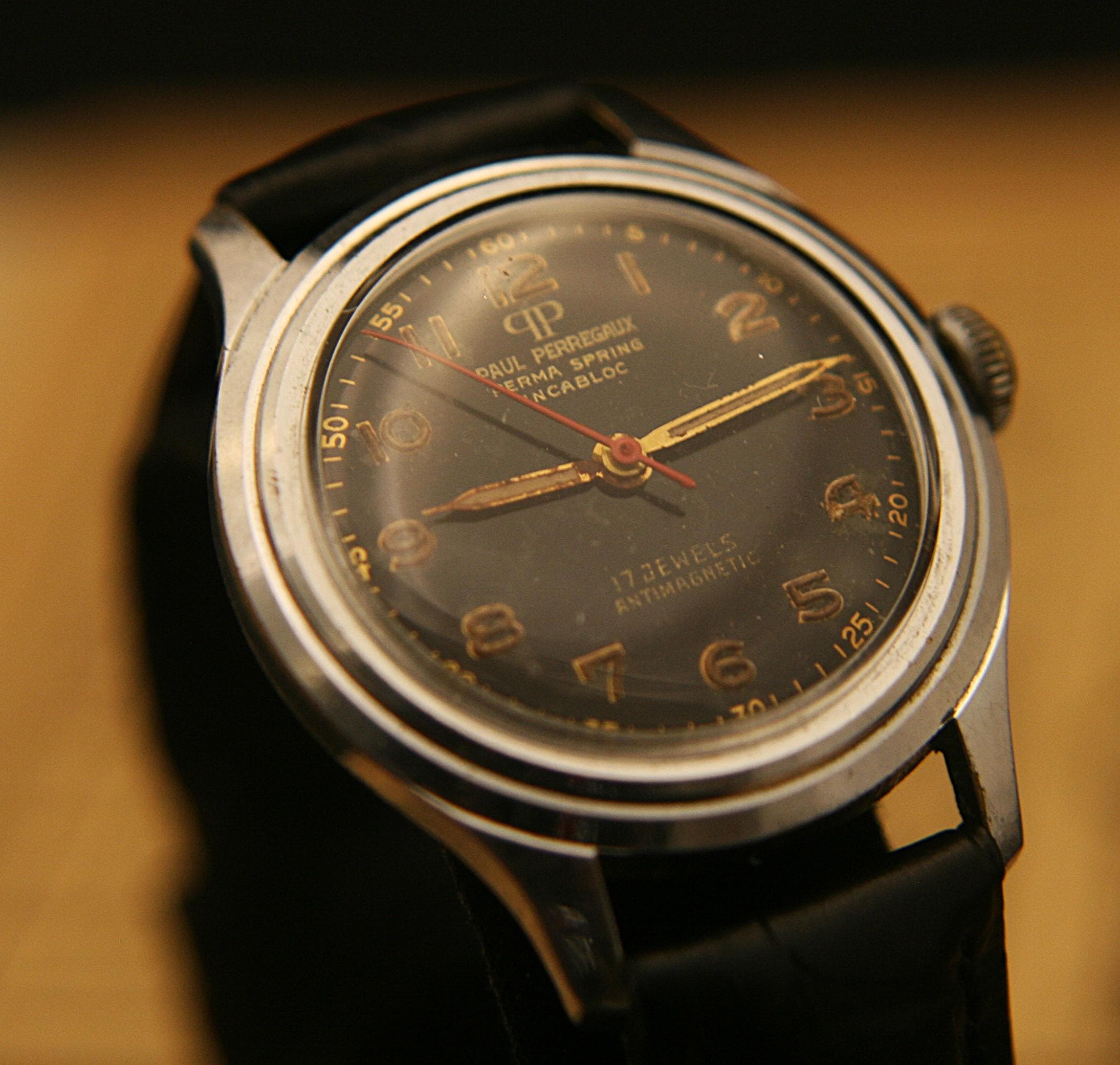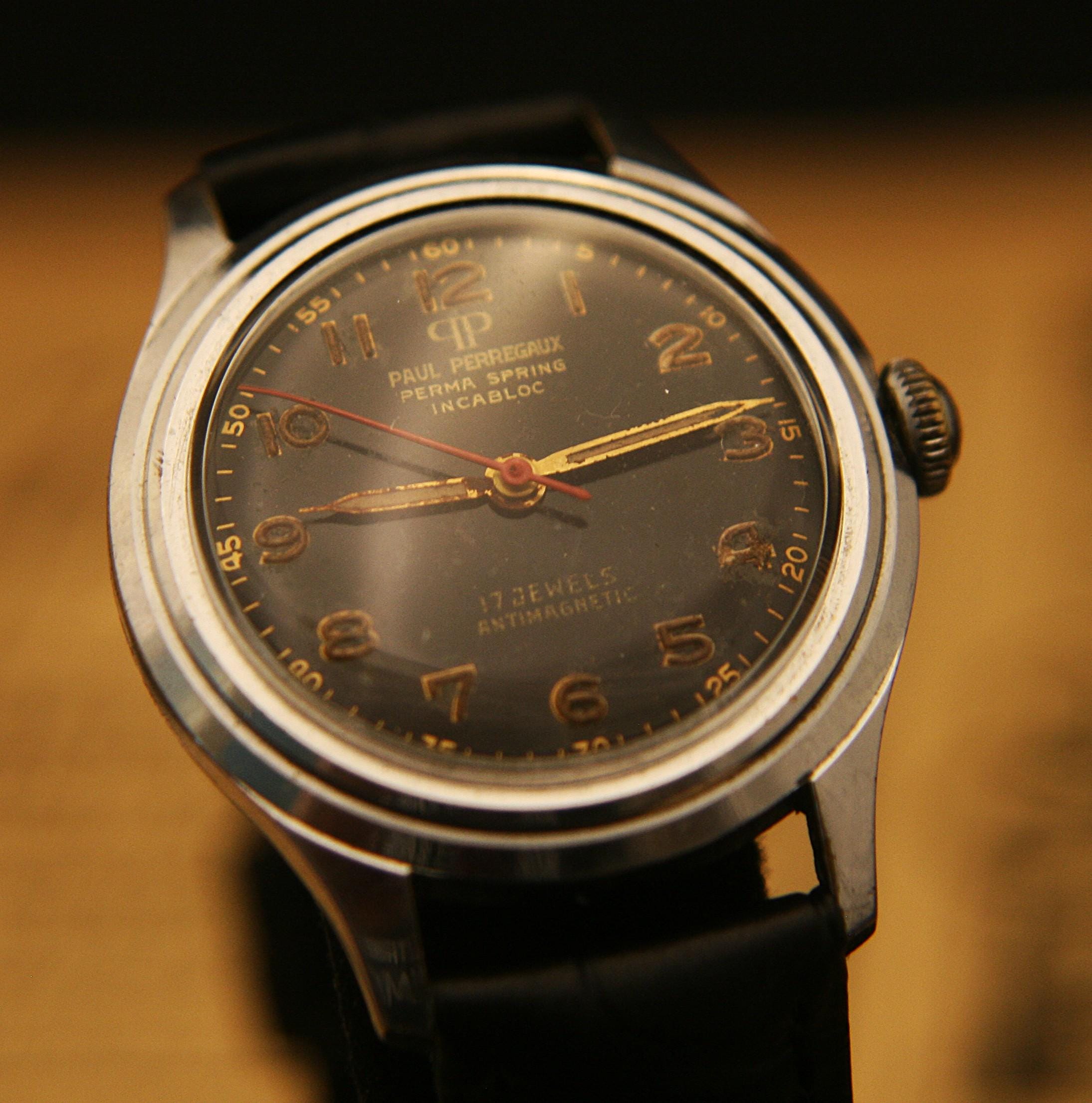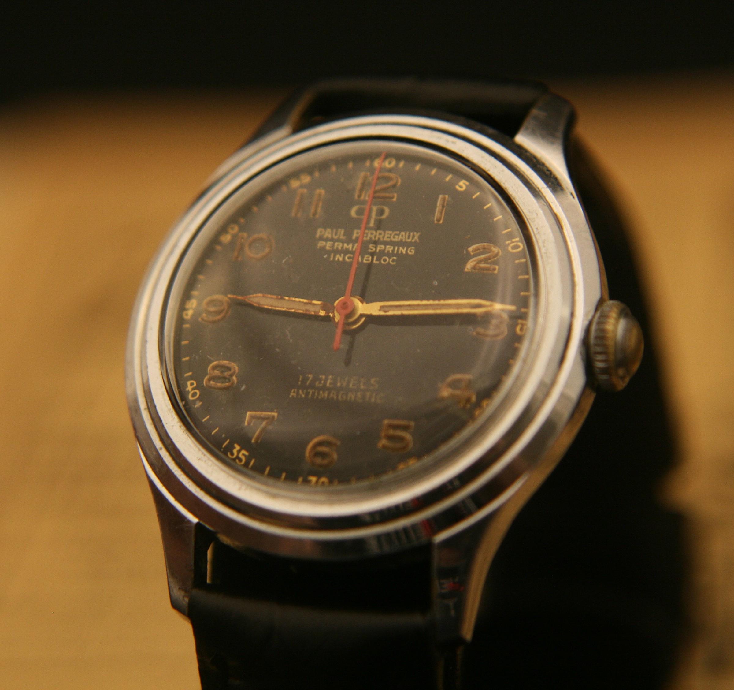 Manufactured is Switzerland in the 1940's it features an all polished stainless steel case that measures 32 mm /1.25" in diameter, excluding crown and lugs, that surrounds deep black military dial complimented by, once luminous, but now dimmed, gold hour and minute hands, red center sweep second hand, raised gold Arabic numbers, and outer chapter. It is signed "Paul Perregaux", Perma Spring, Incabloc, 17 jewels, Incabloc, and Antimagnetic.