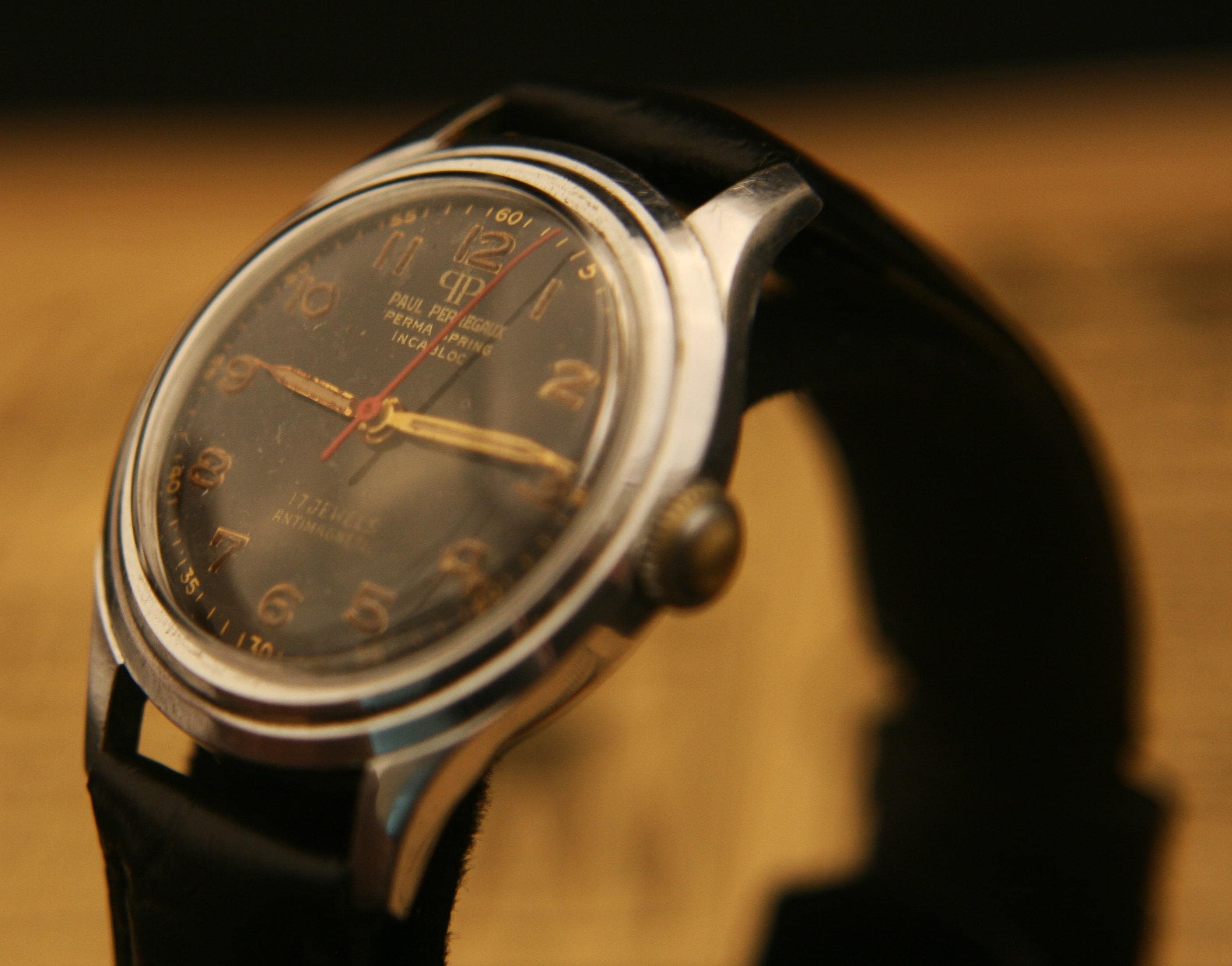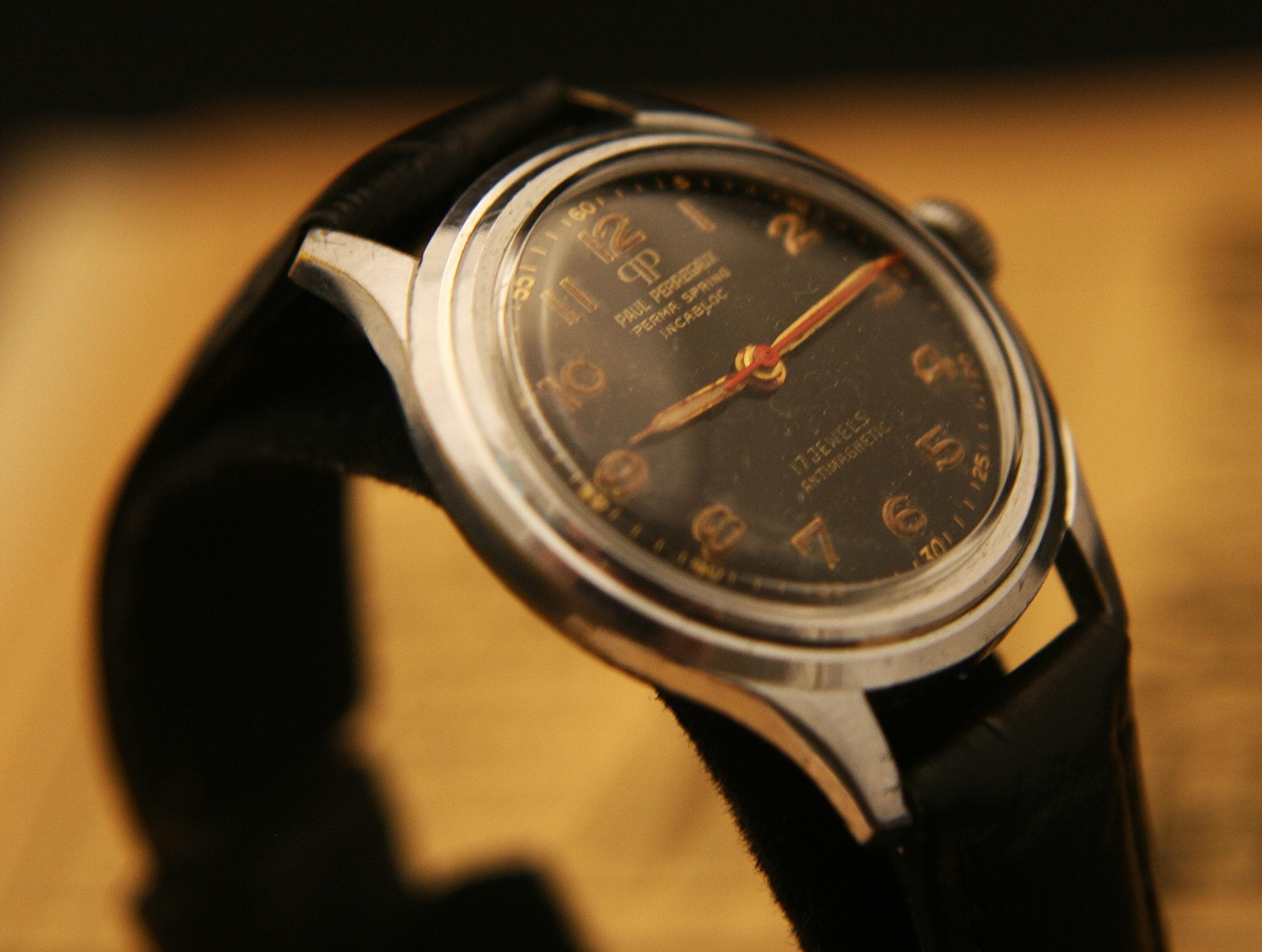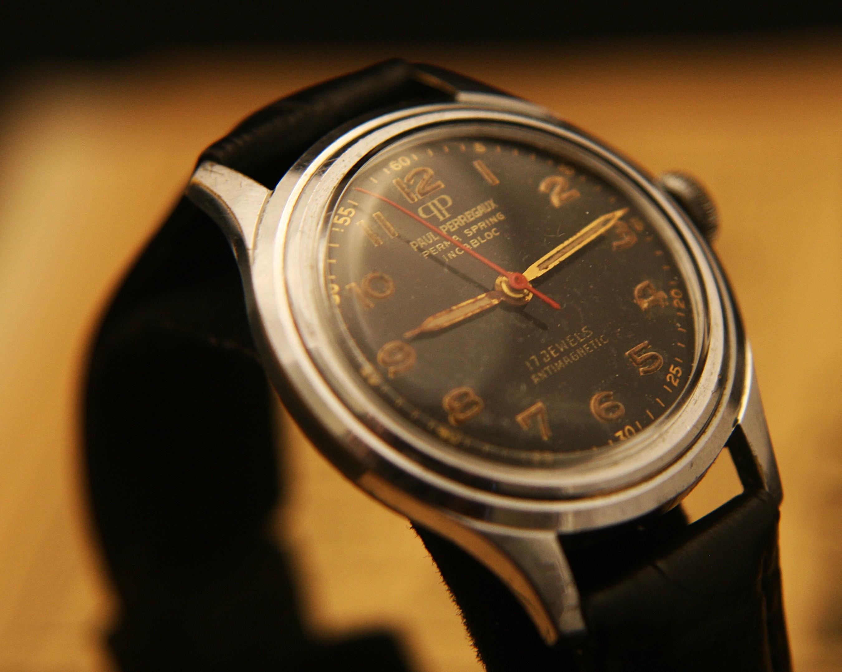Manufactured is Switzerland in the 1940's it features an all polished stainless steel case that measures 32 mm /1.25" in diameter, excluding crown and lugs, that surrounds deep black military dial complimented by, once luminous, but now dimmed, gold hour and minute hands, red center sweep second hand, raised gold Arabic numbers, and outer chapter. It is signed "Paul Perregaux", Perma Spring, Incabloc, 17 jewels, Incabloc, and Antimagnetic.