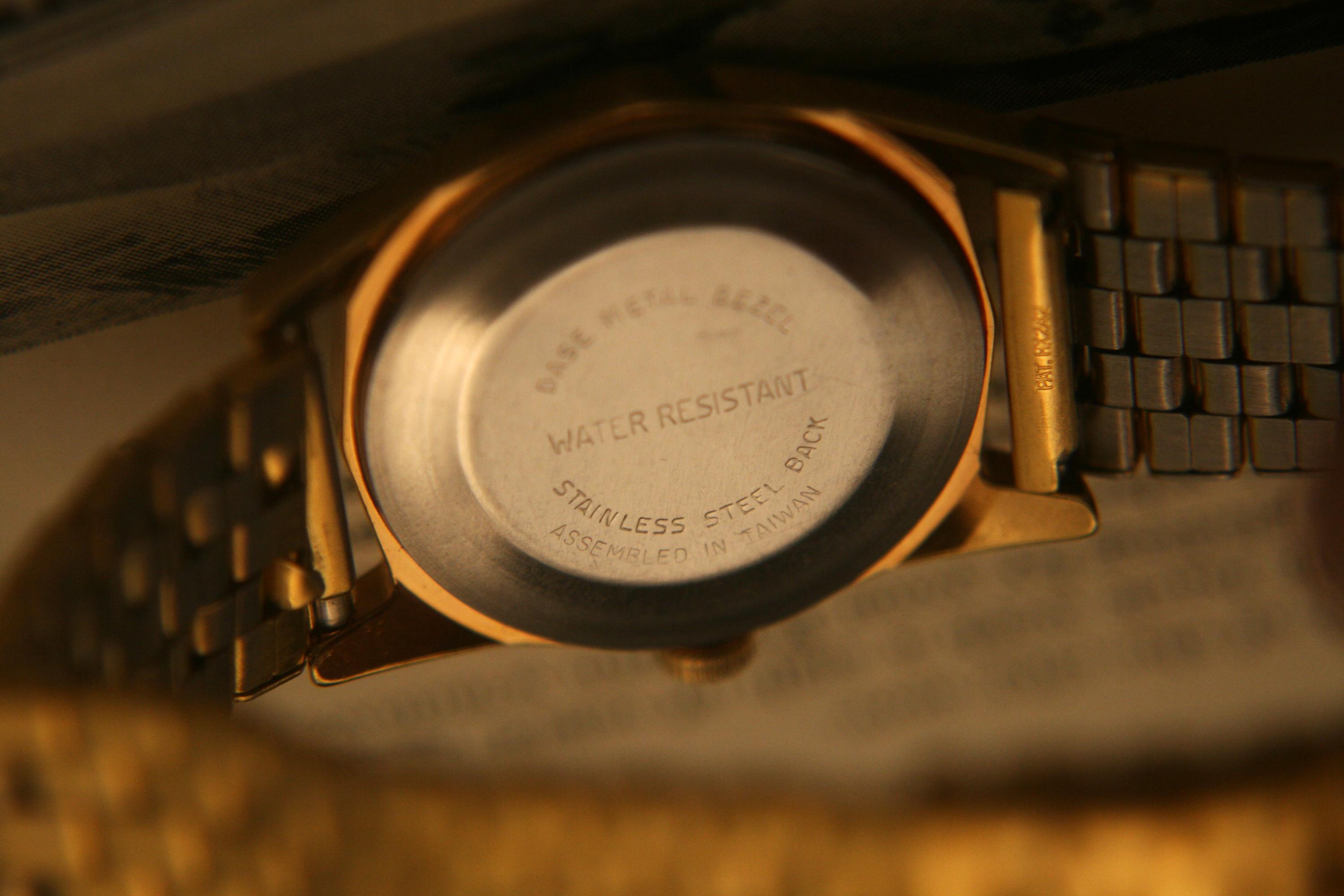 It has a stainless steel, snap-down back, and is matched with a adjustable gold-plated bracelet that suits it perfectly!
