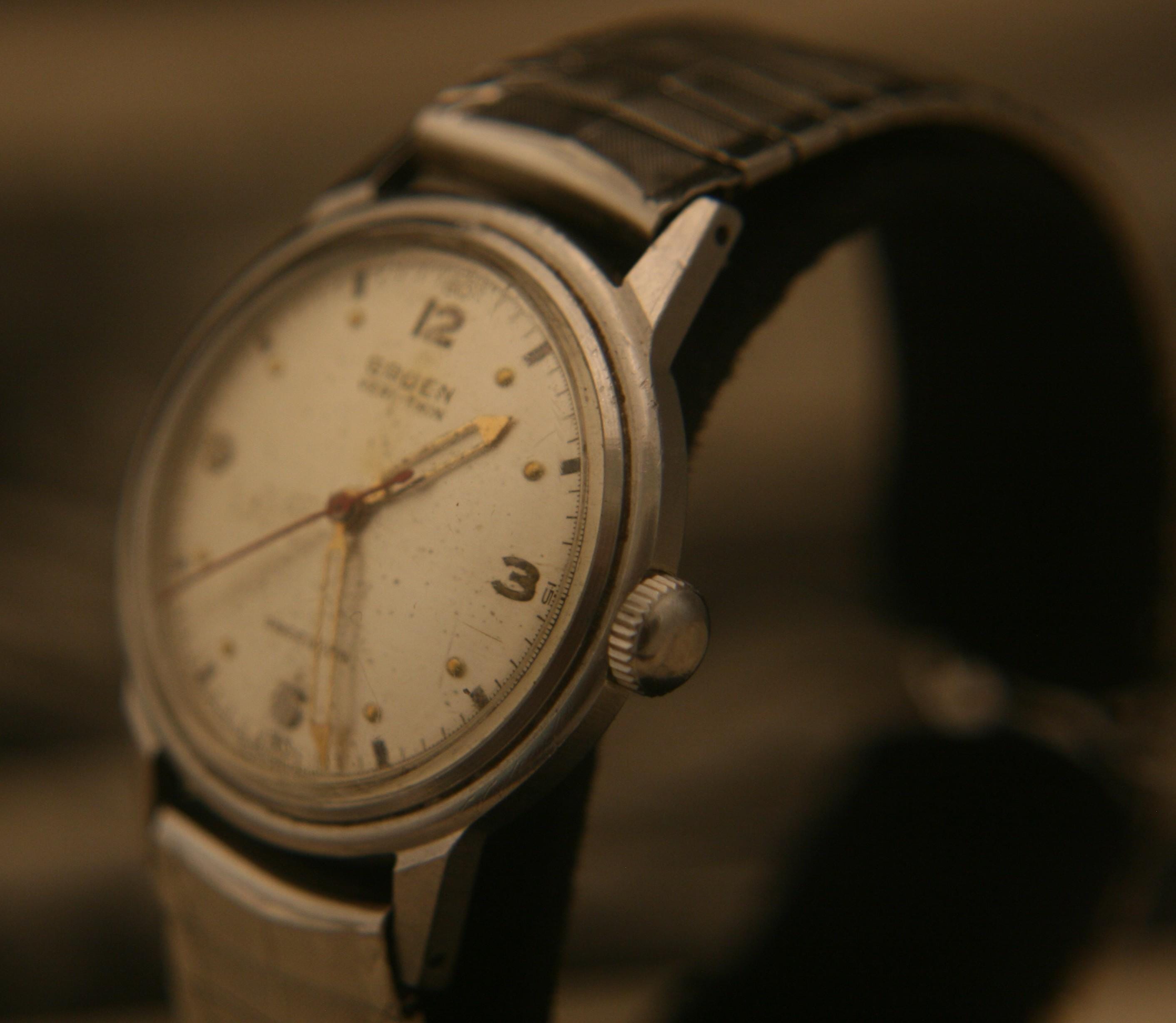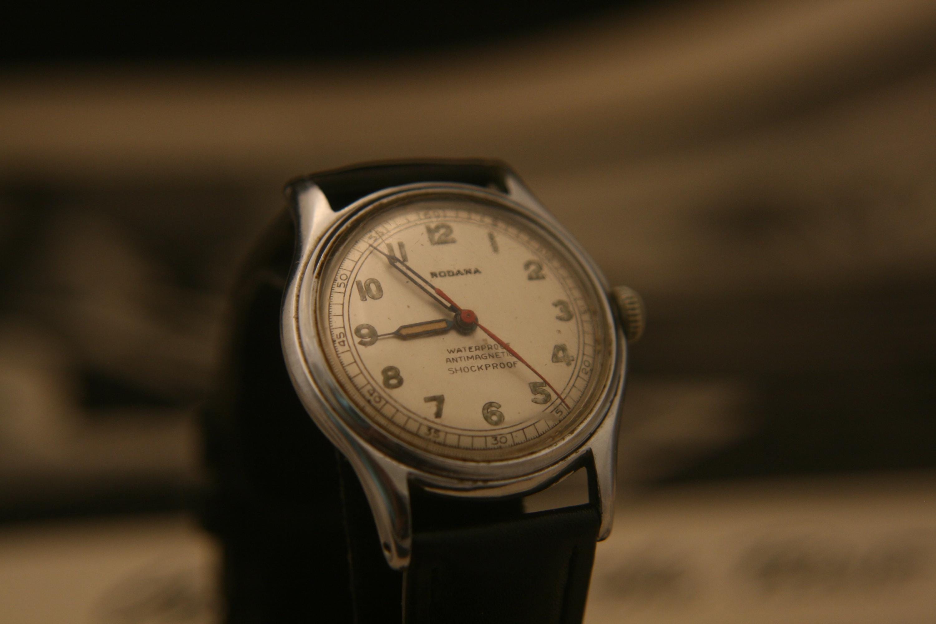 Manufactured is Switzerland in the 1940's it features a stainless-steel case that measures 31.6 mm / 1.24" in diameter, excluding crown and lugs, and surrounds an evenly-aged soft silver dial complimented by cut-out gold syringe hour and minute hands, red sweep second hand, raised gold numbers and markers, and a well-defined black outer-chapter.