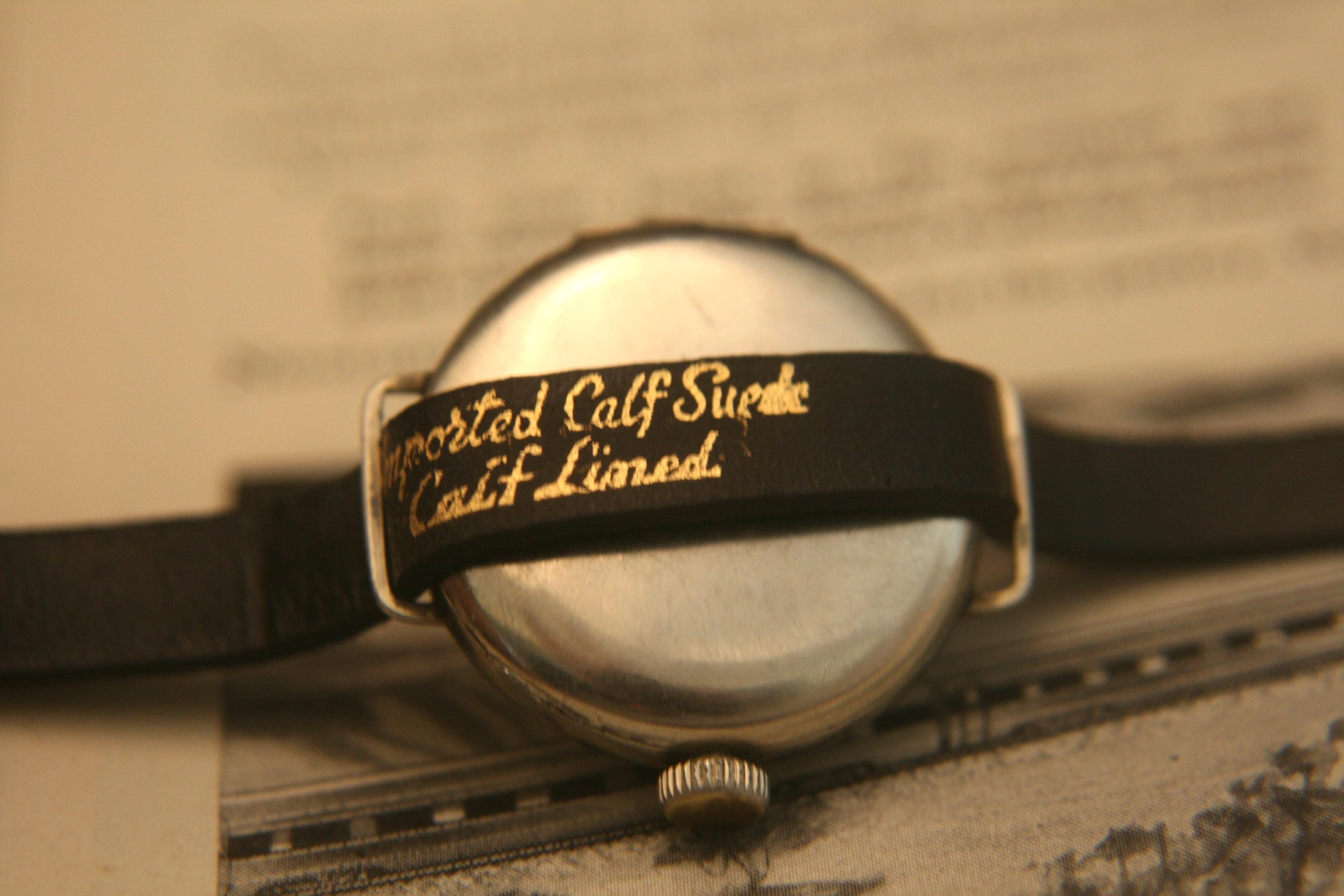 It has a hinged nickel silver back and is matched with a 1-piece leather strap.