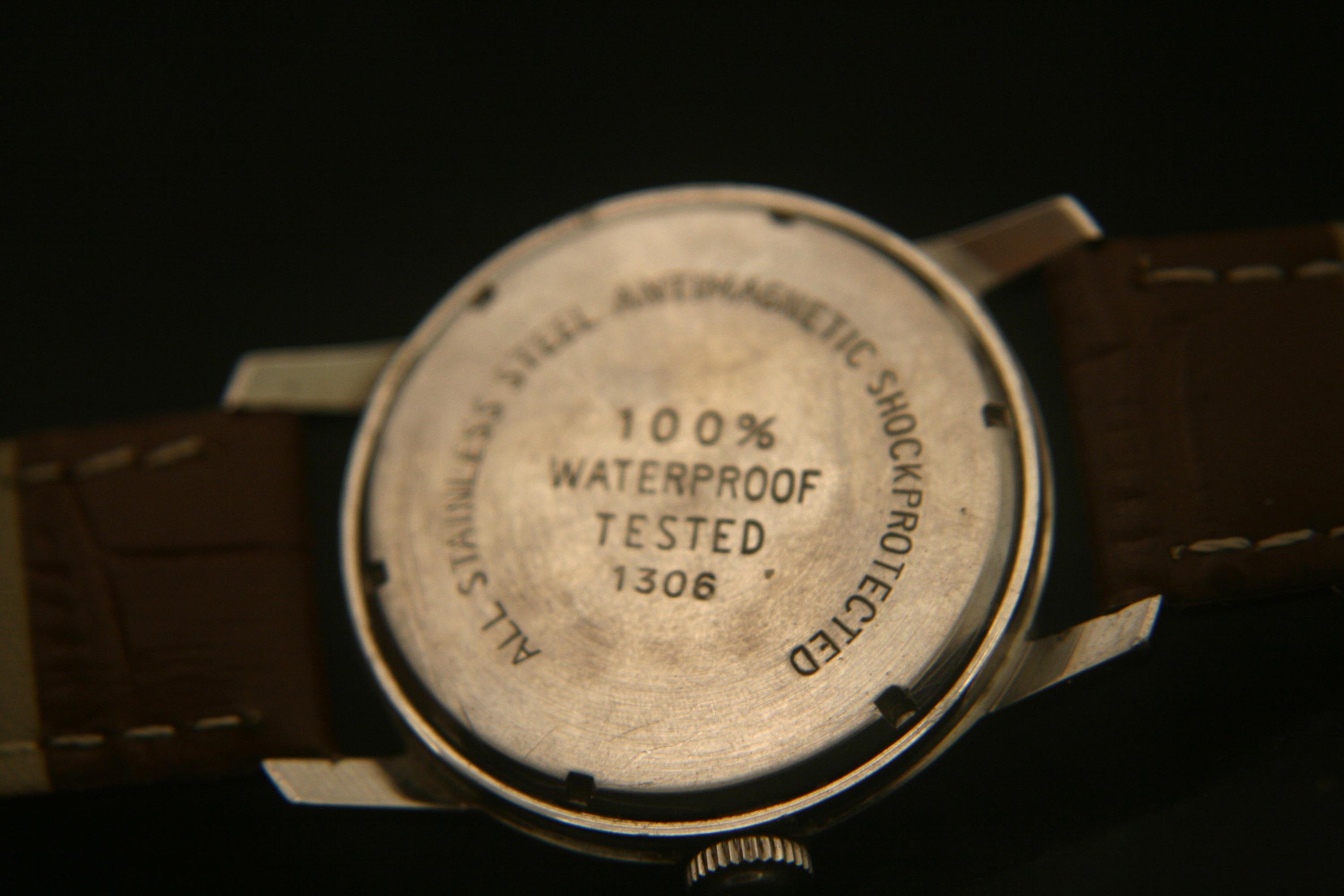 It has a screw-down back and has been fitted with a new genuine leather stitched and embossed 2-piece strap with stainless buckle which will fit up to an 8" wrist.