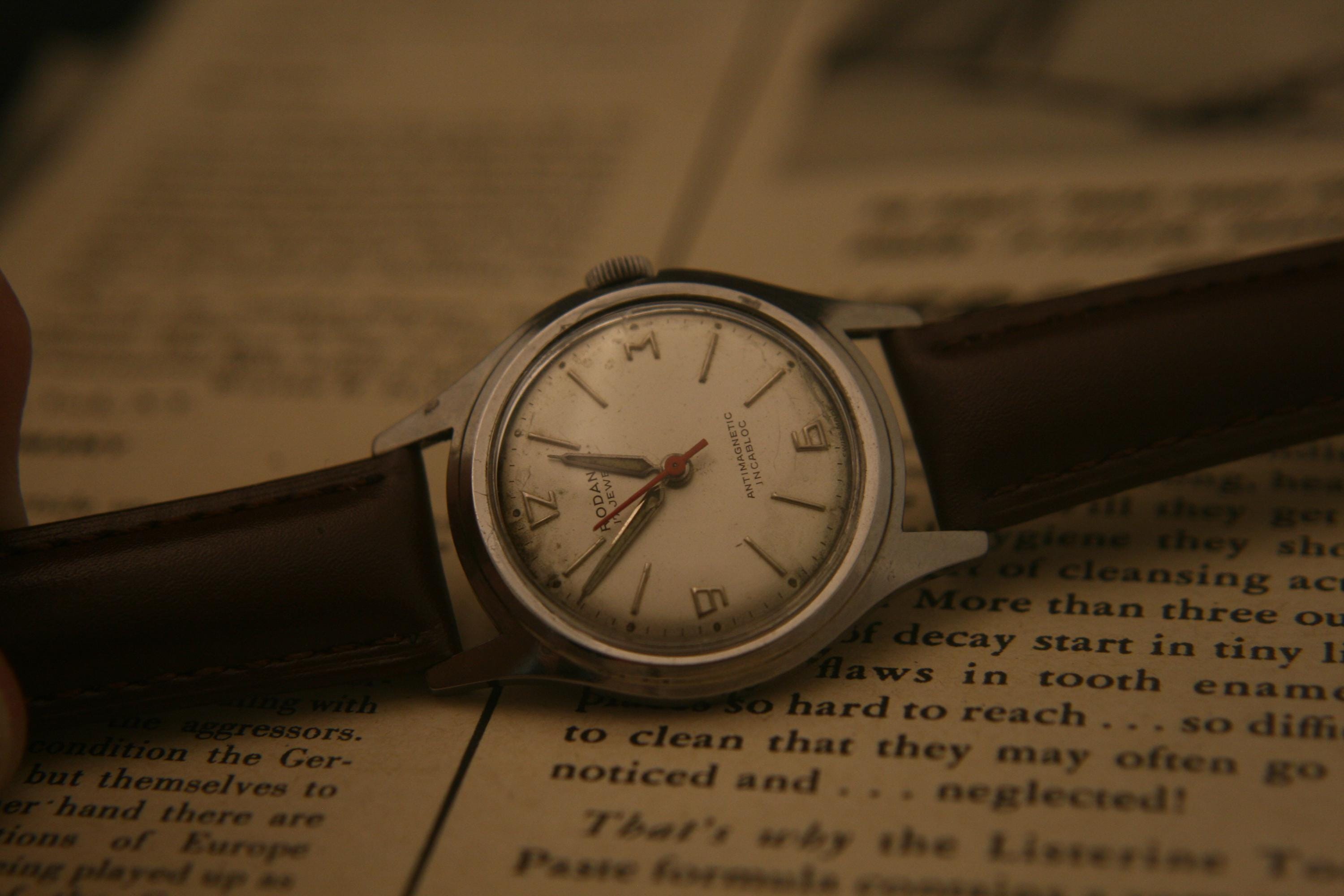 It features beautiful, polished all stainless-steel case and back that surrounds a light beige dial which shows some light aging from about 65 years of service.