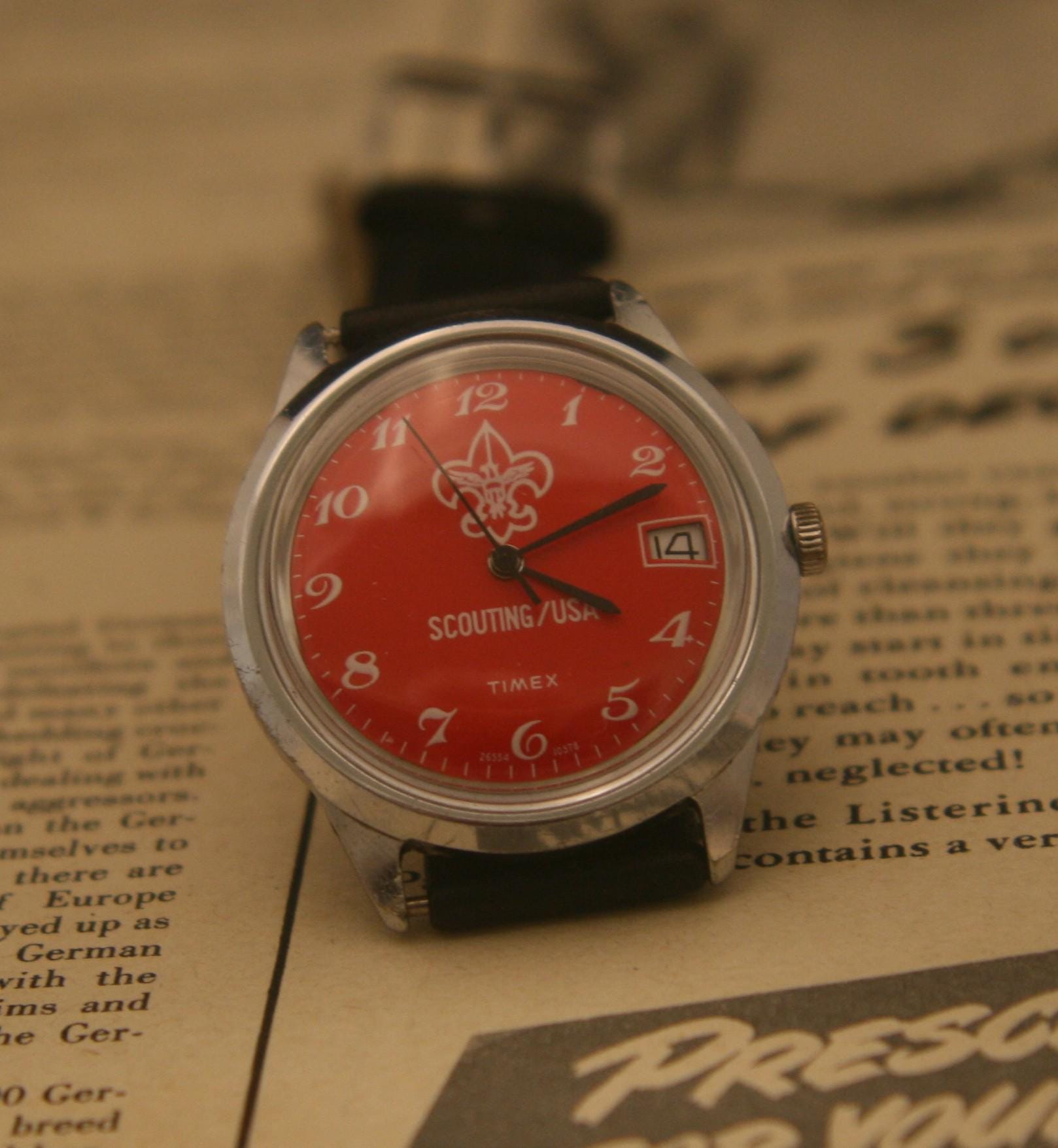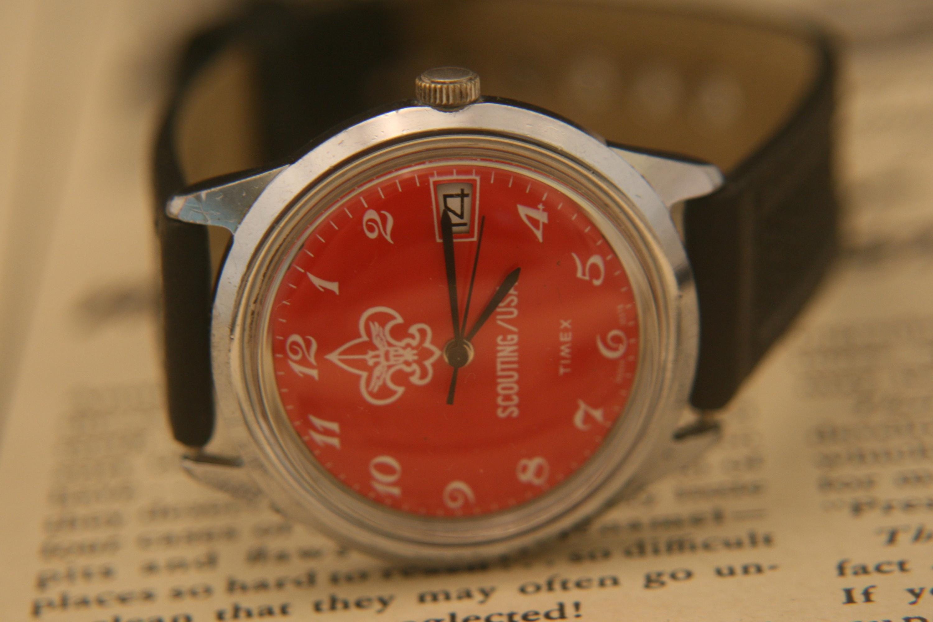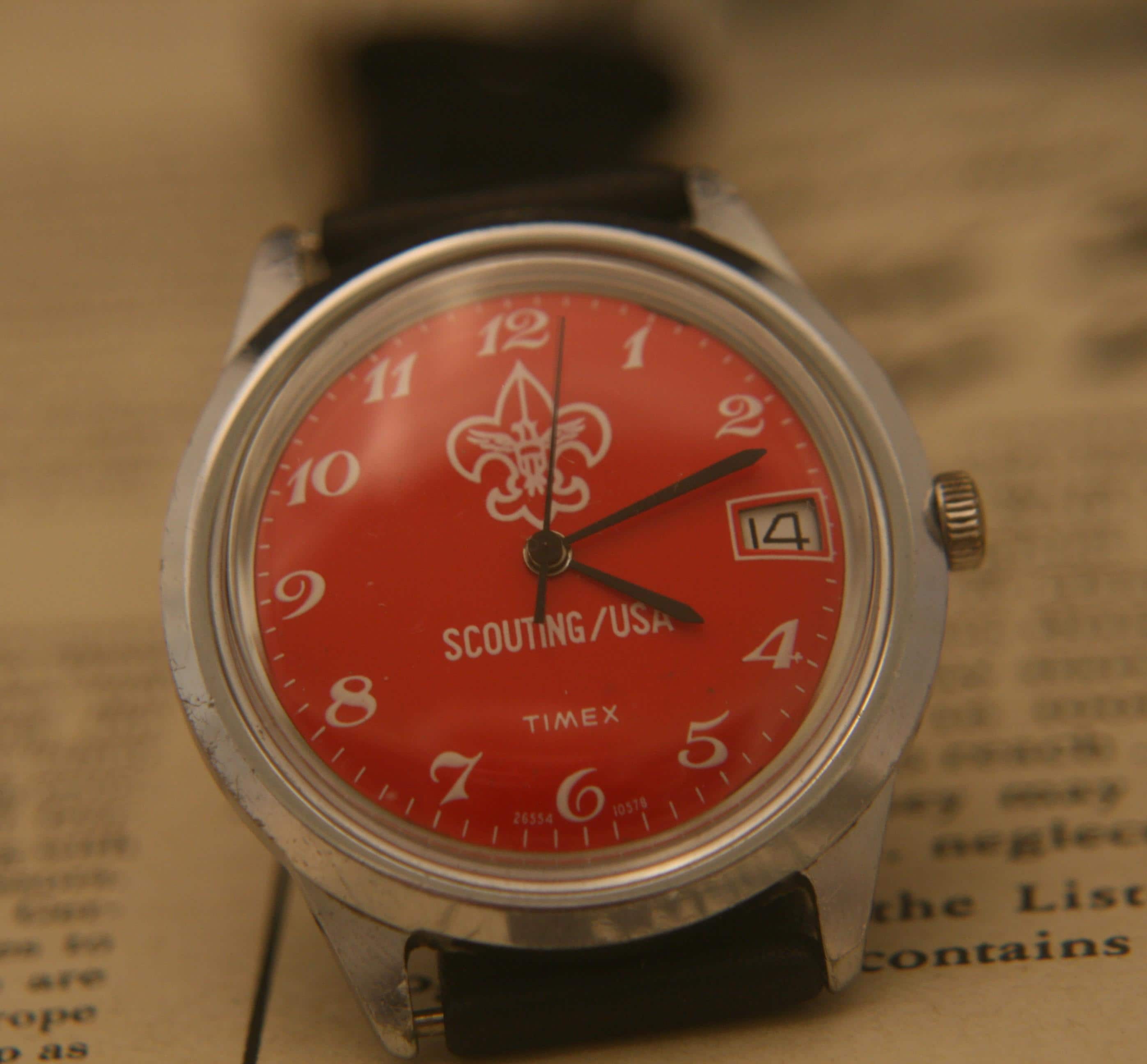 This is a very rare vintage "Boy" Scouting USA 1978 Timex Marlin calendar wristwatch in excellent condition. .