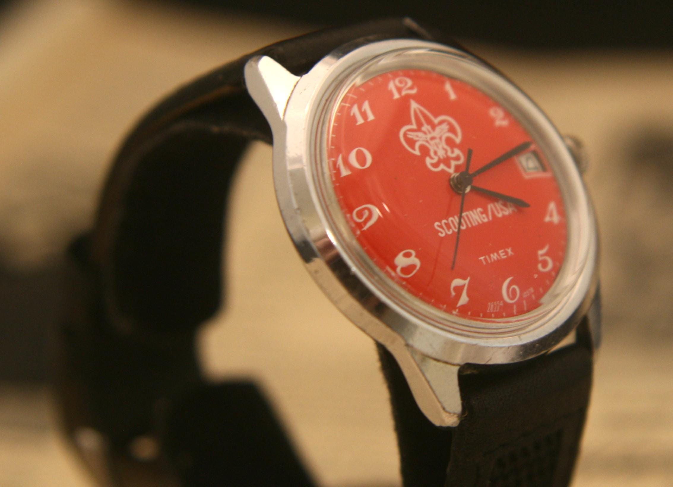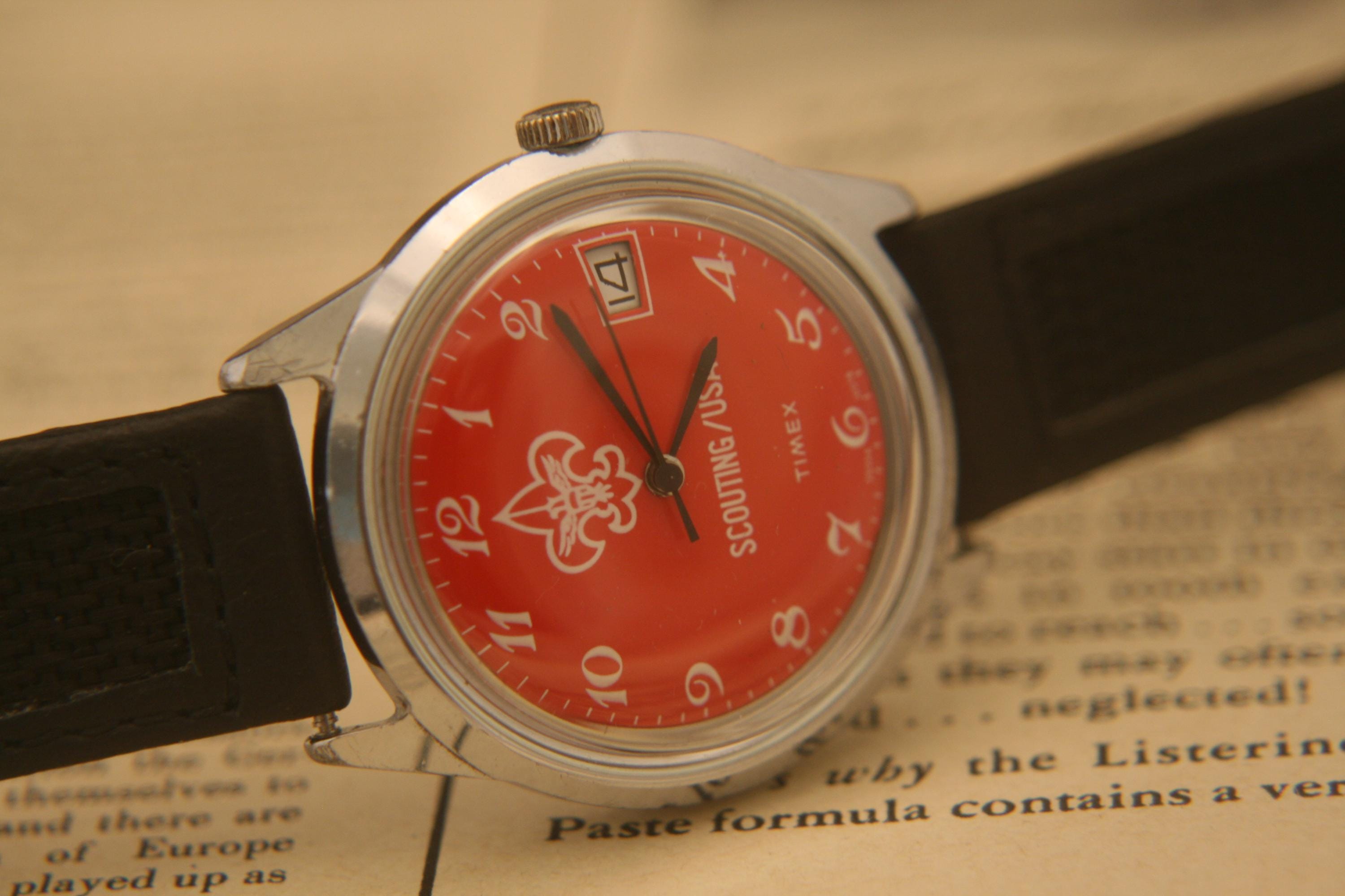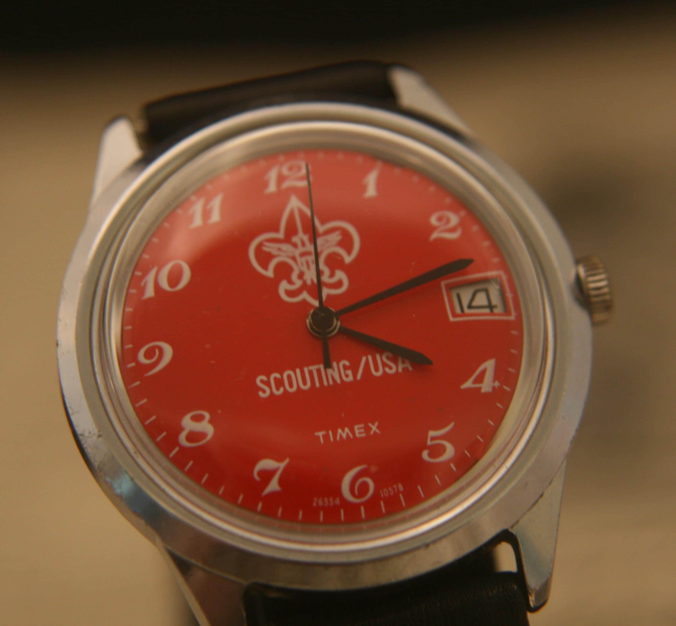 This is a very rare vintage "Boy" Scouting USA 1978 Timex Marlin calendar wristwatch in excellent condition. .