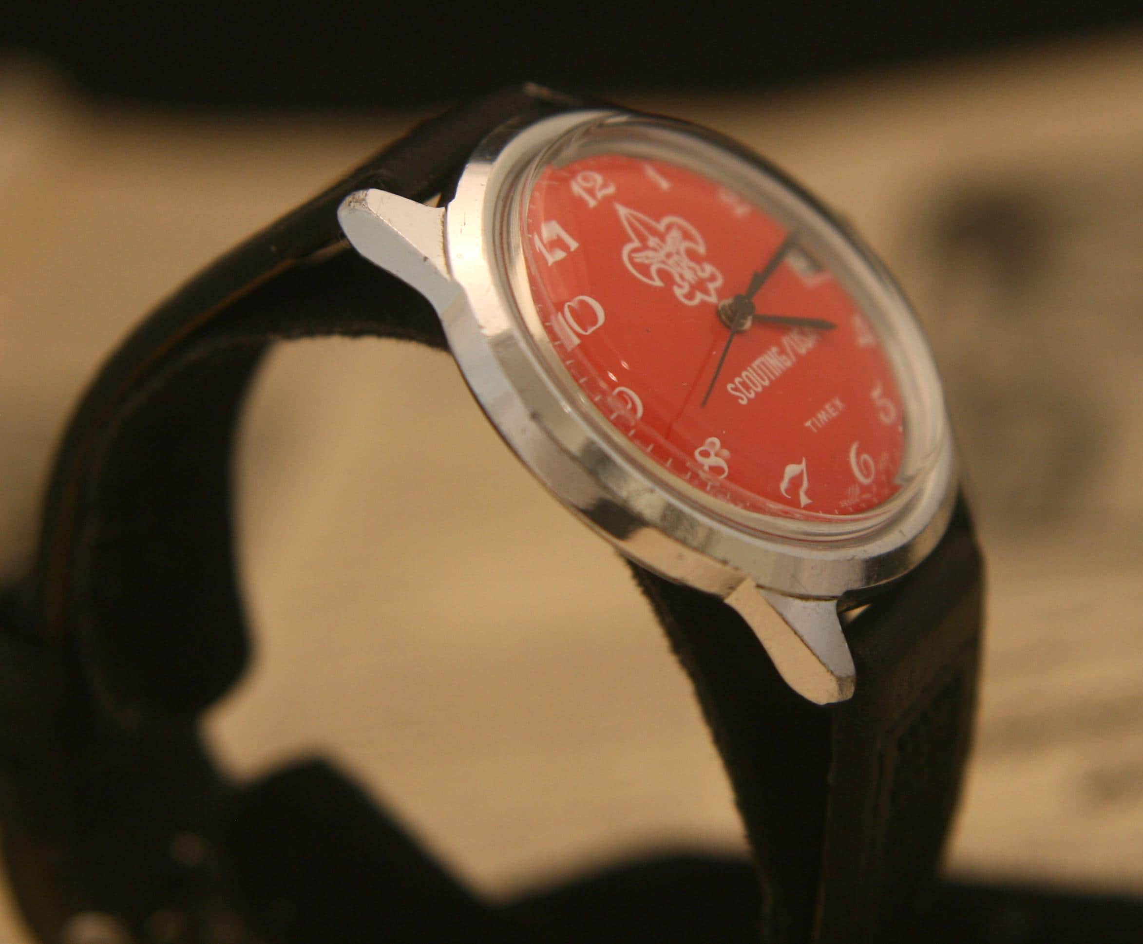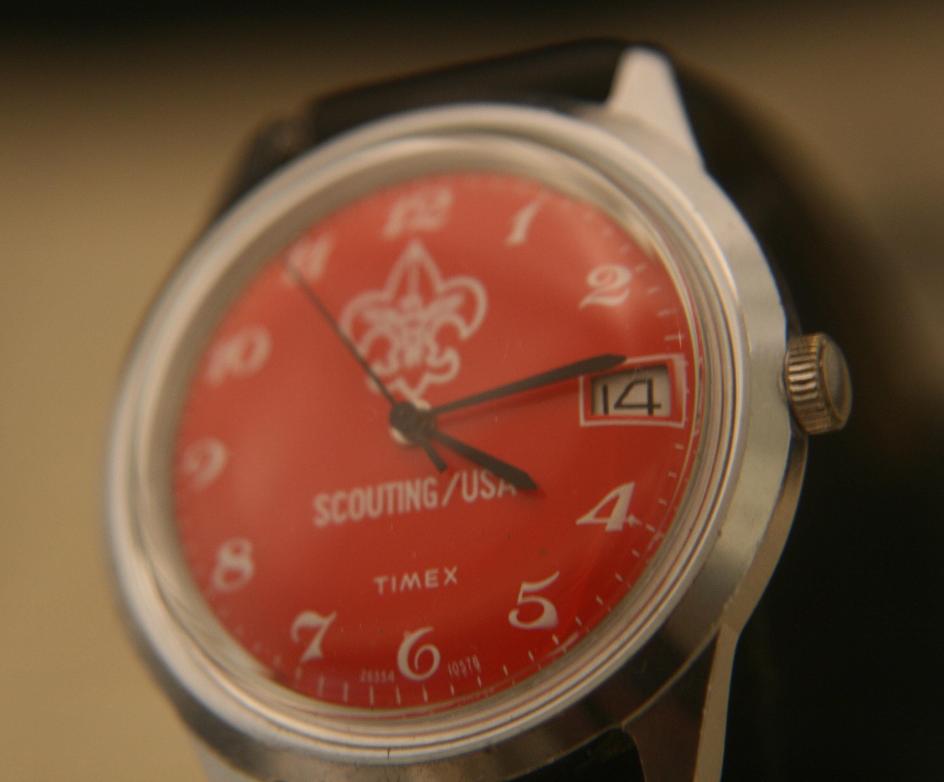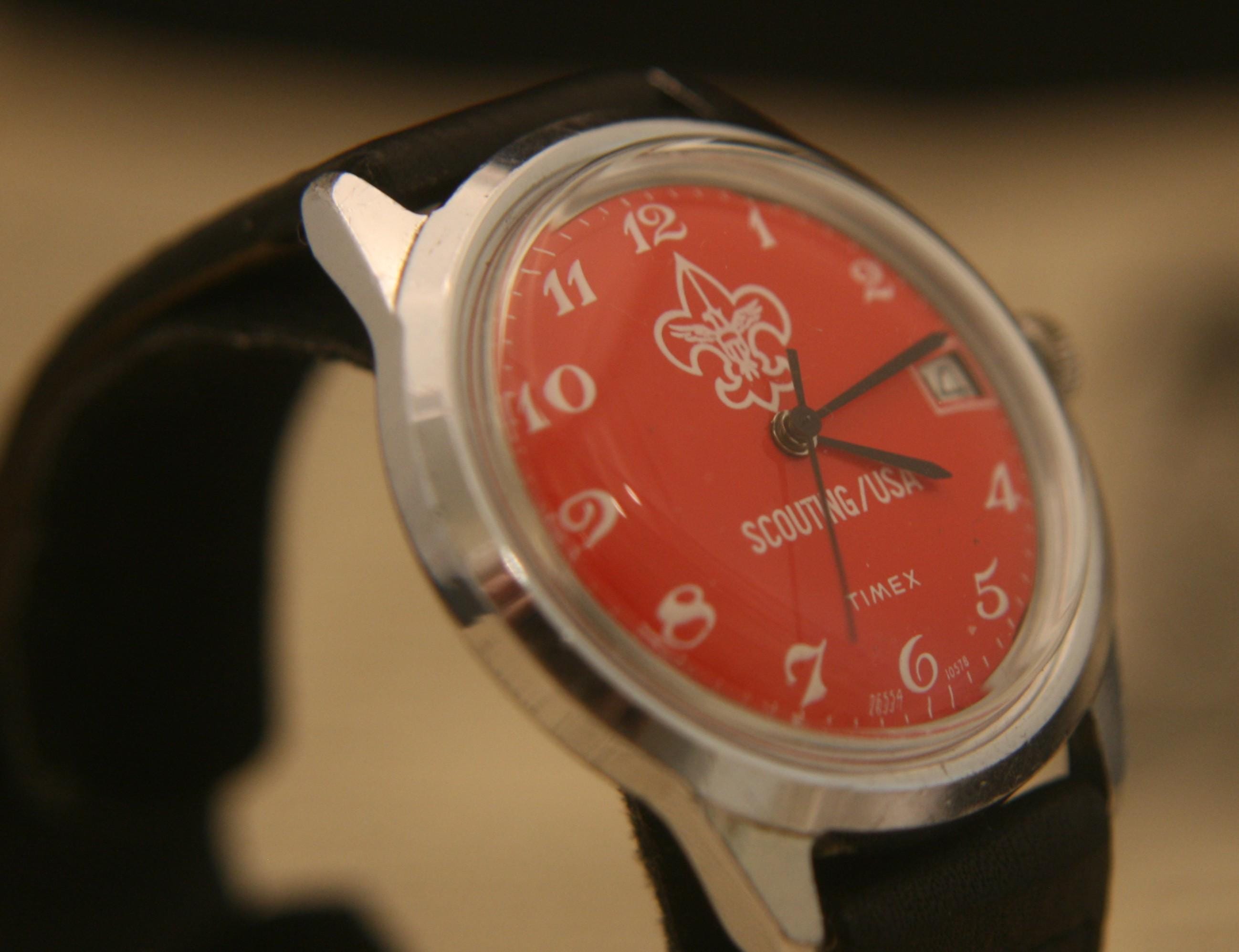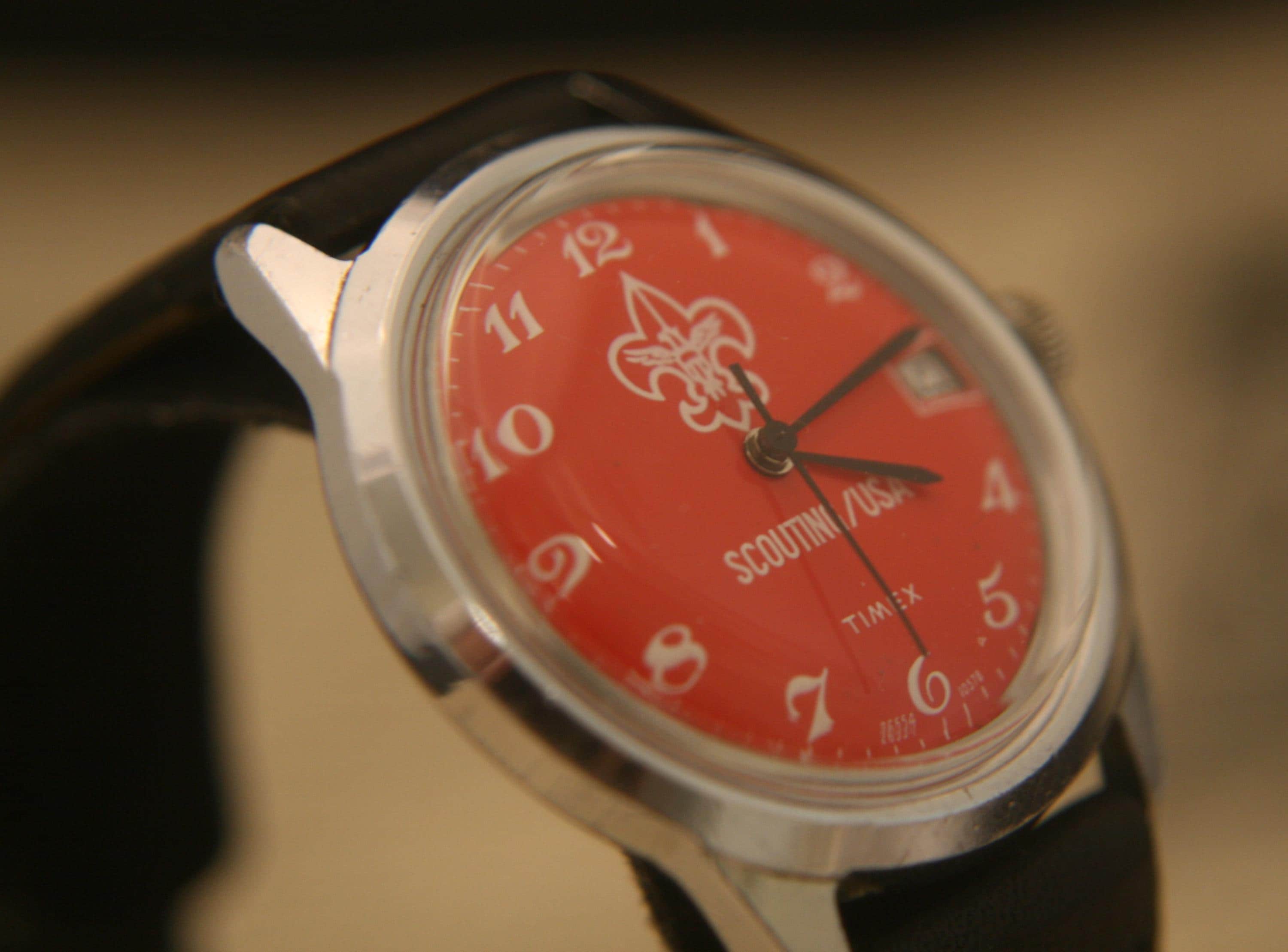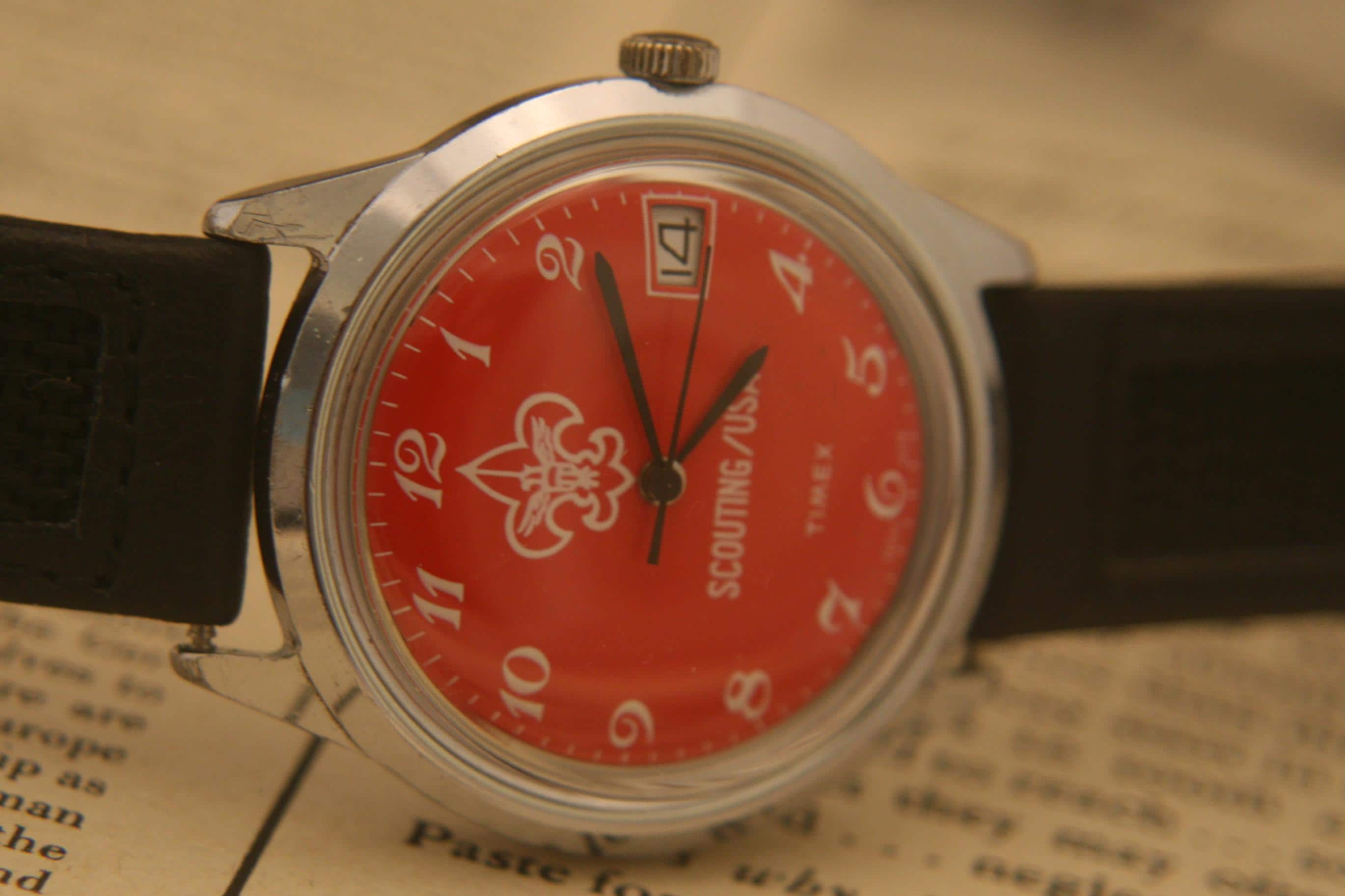 It features a 36.4 mm / 1.43" chrome plated case, excluding crown and lugs, that surrounds a pristine red dial that contrasts beautifully against black hour, minute, and sweep second hands, large white numbers, white outer-chapter, date window @ 3 o'clock, and the Scouting logo, all under a bright, new hi-domed crystal!