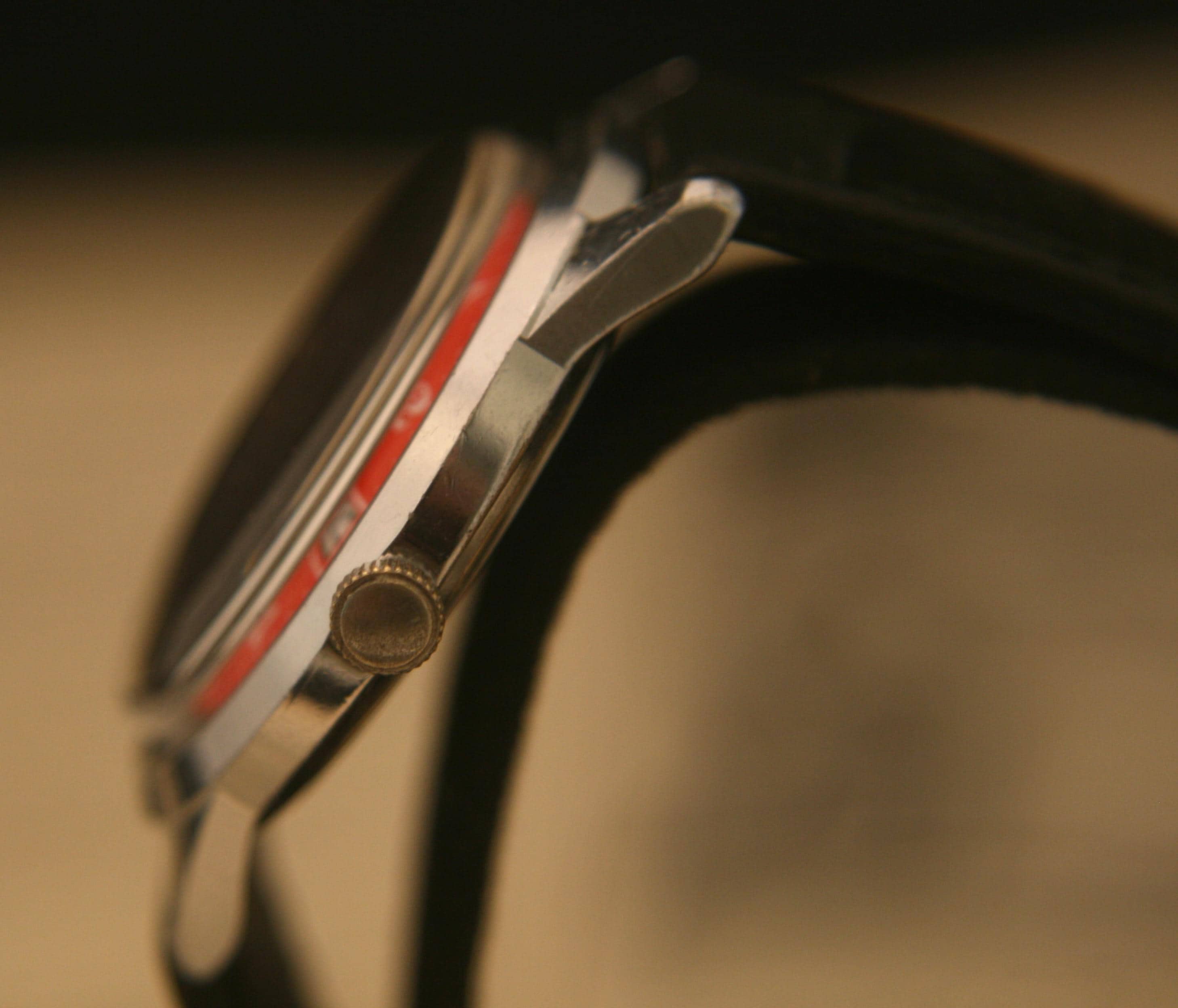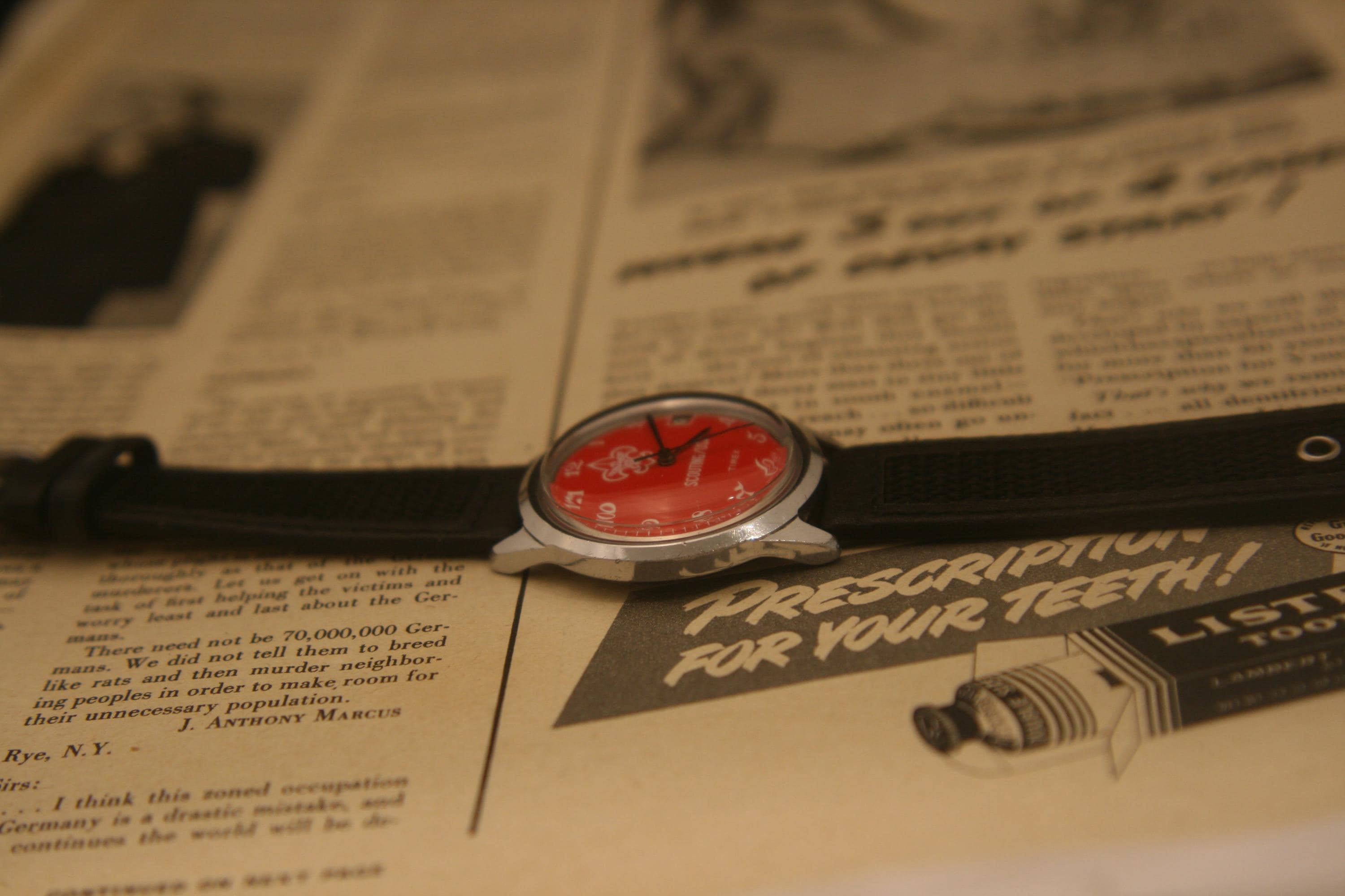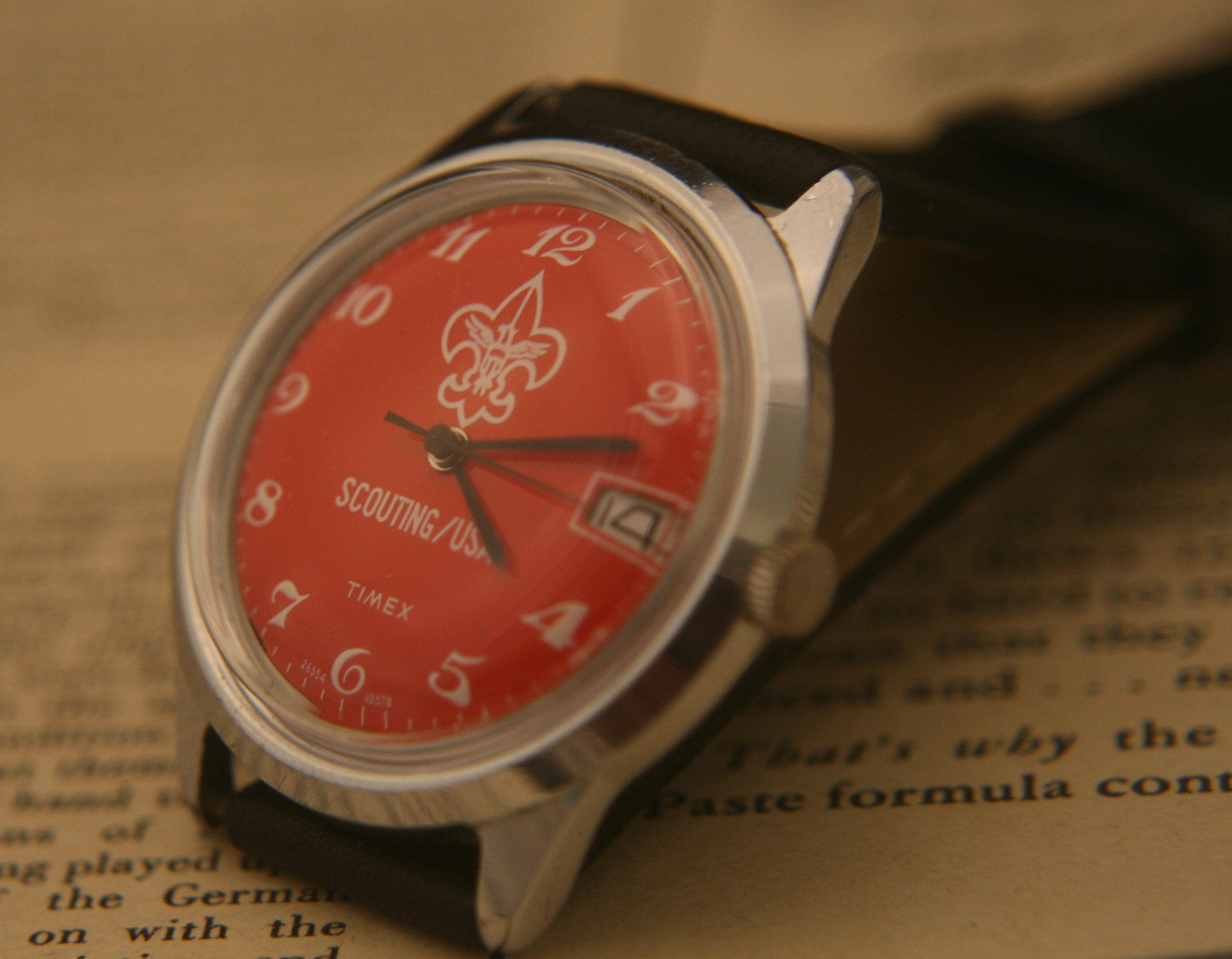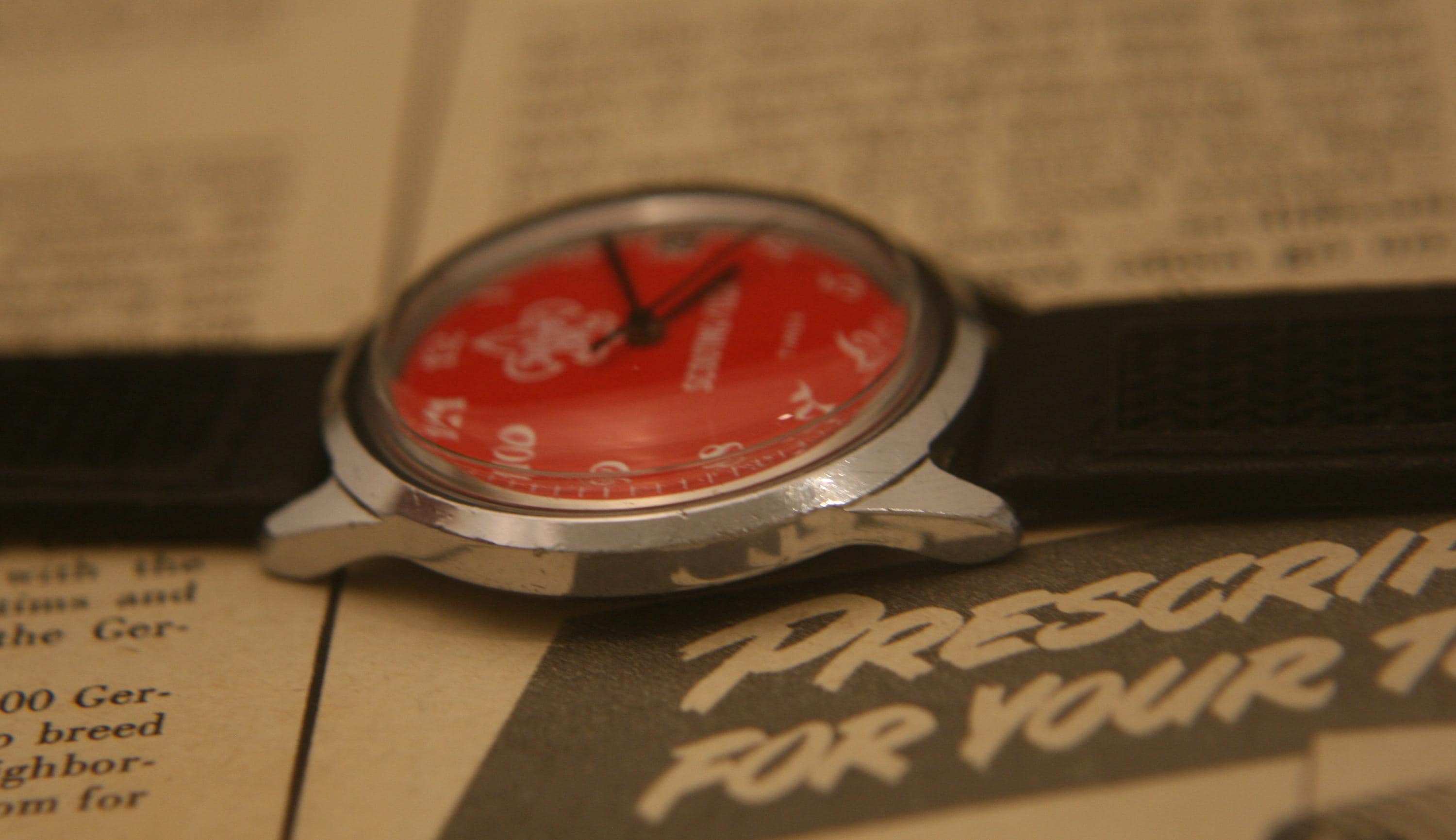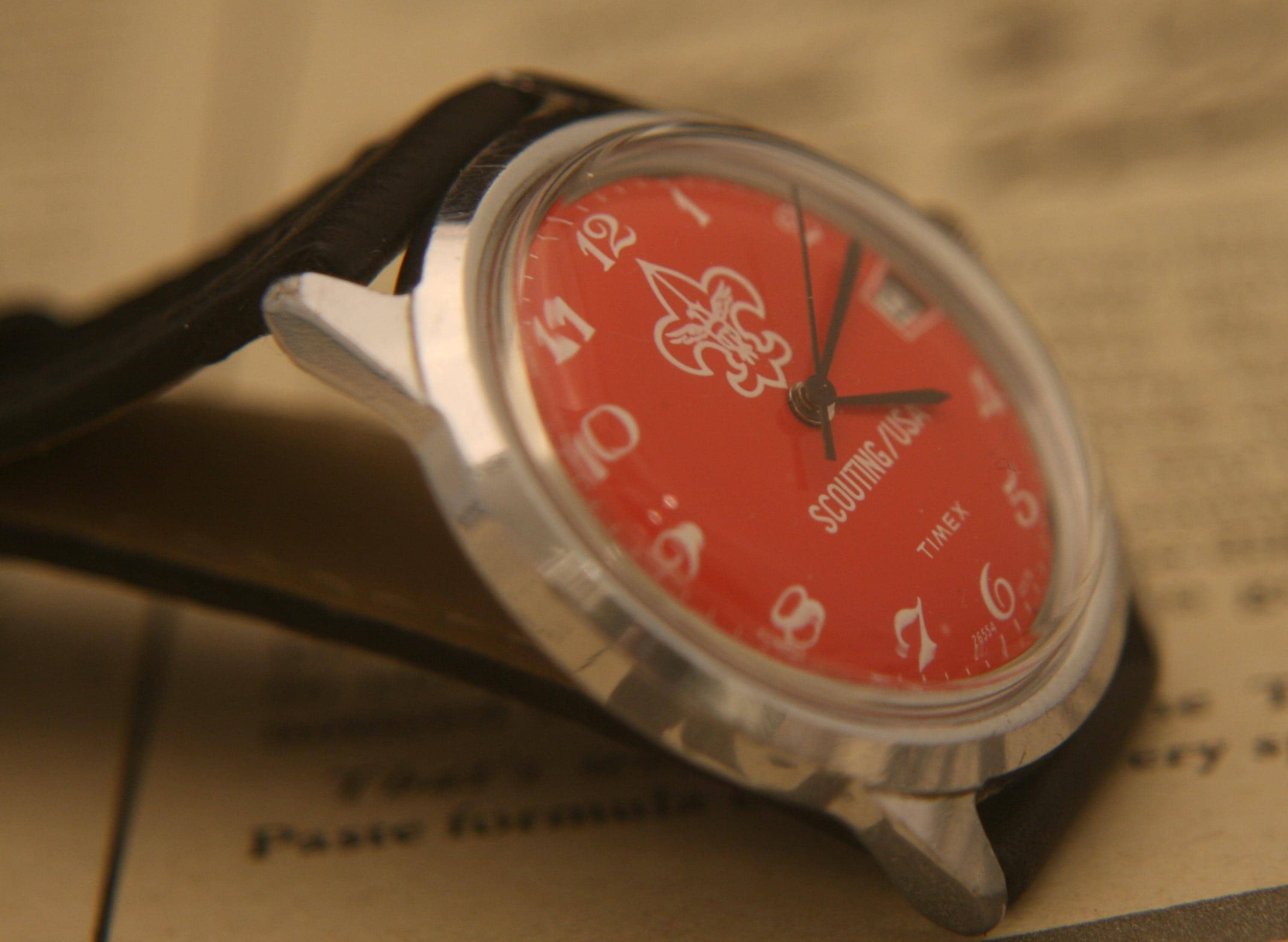 It features a 36.4 mm / 1.43" chrome plated case, excluding crown and lugs, that surrounds a pristine red dial that contrasts beautifully against black hour, minute, and sweep second hands, large white numbers, white outer-chapter, date window @ 3 o'clock, and the Scouting logo, all under a bright, new hi-domed crystal!