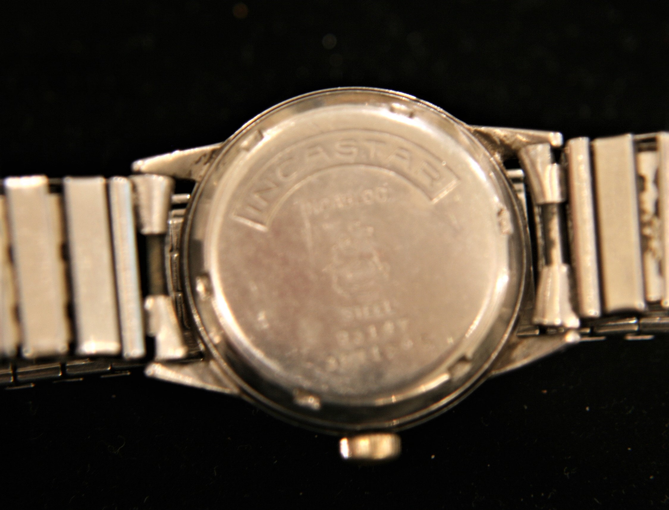 The high dome crystal is clear and bright, is has a stainless steel, screw-down back, and a vintage stainless Speidel flex band.